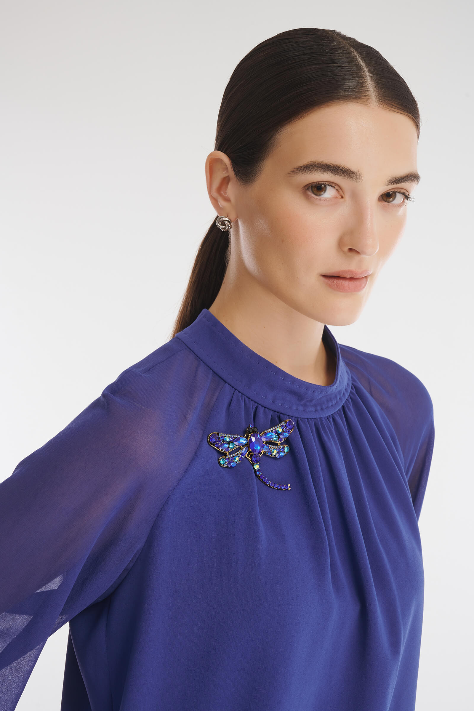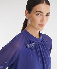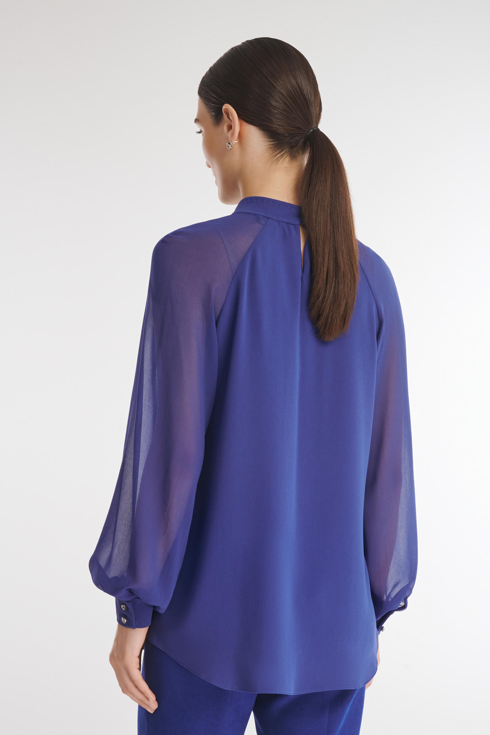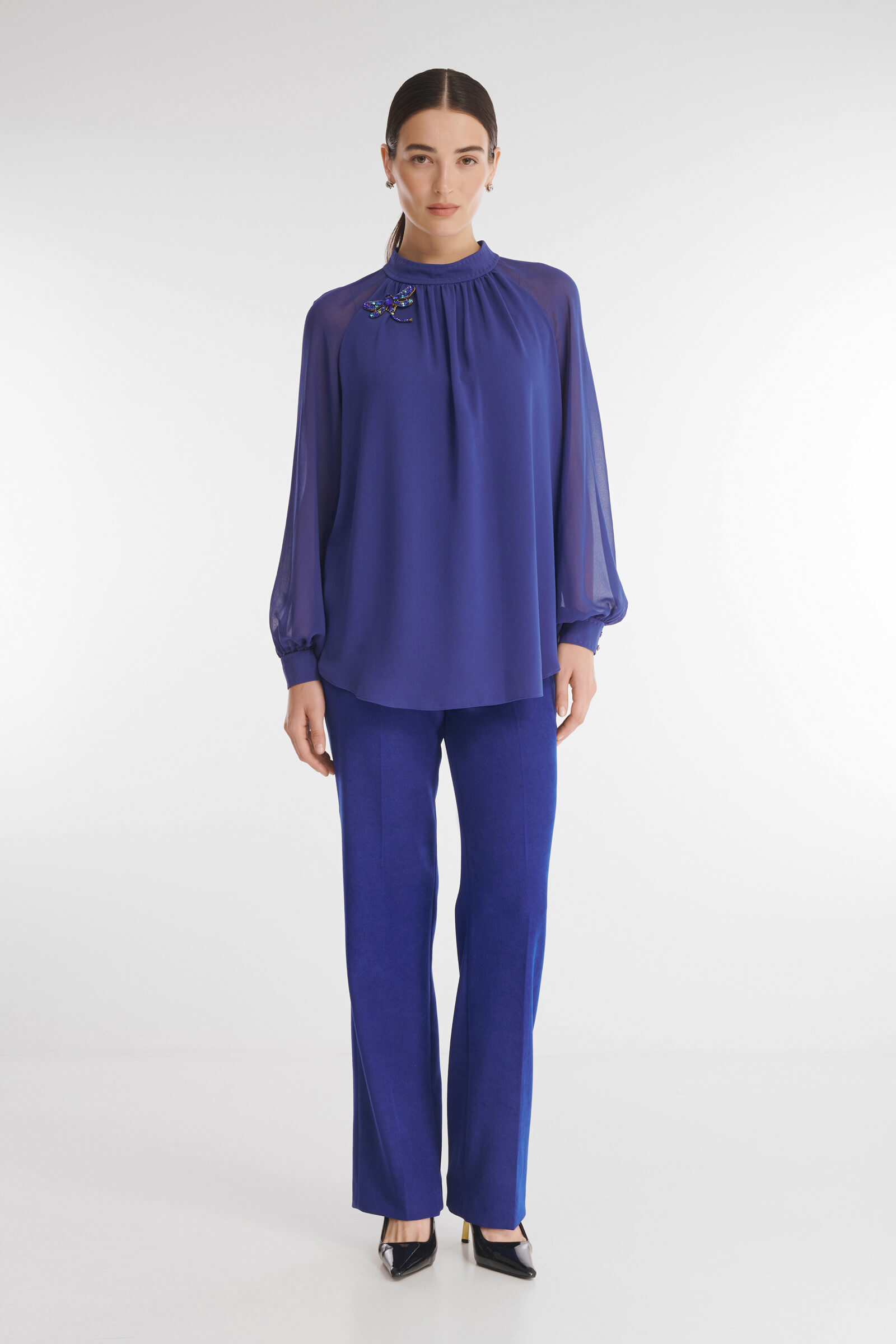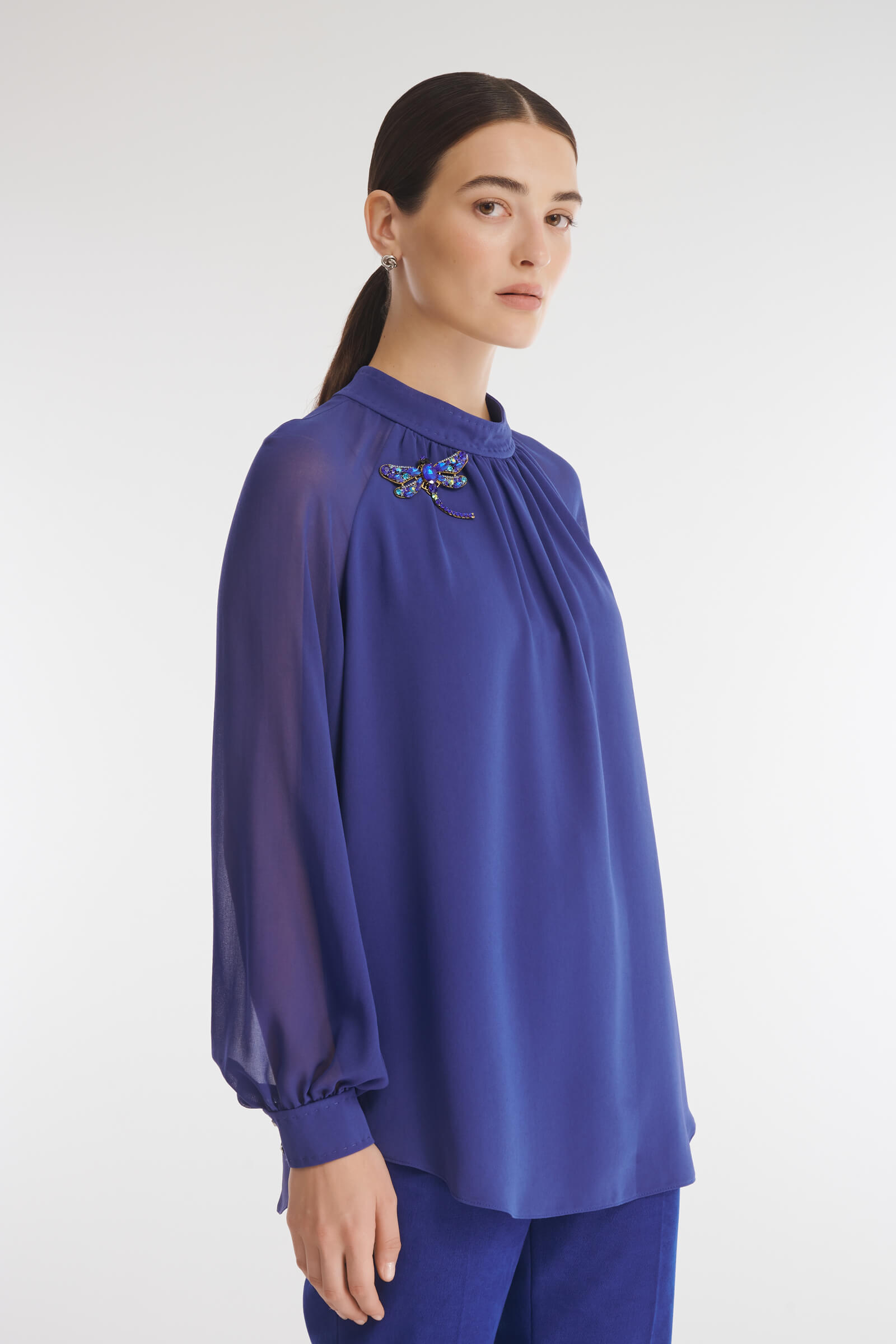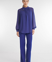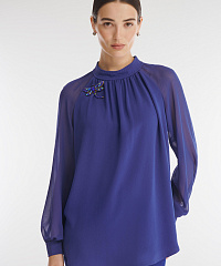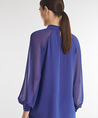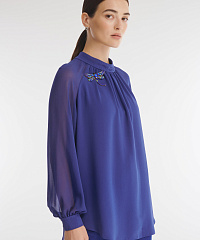 Блузка из воздушной поливискозы. Полупрозрачные рукава-реглан подчеркивают легкость изделия. Дизайн дополнен акцентными пуговицами со стразами. Носите блузку свободной или заправленной на свое усмотрение.