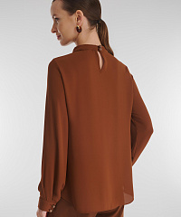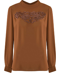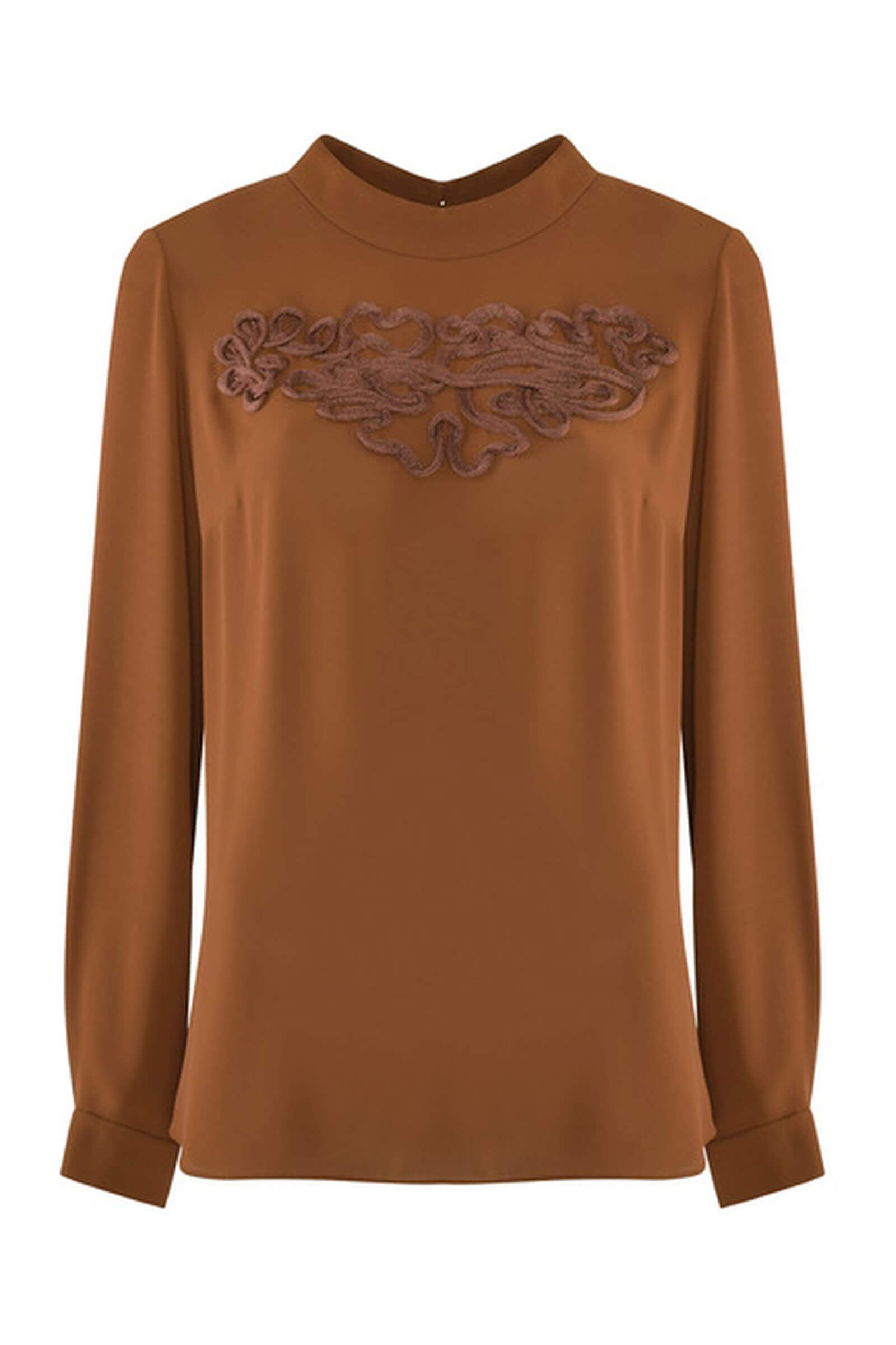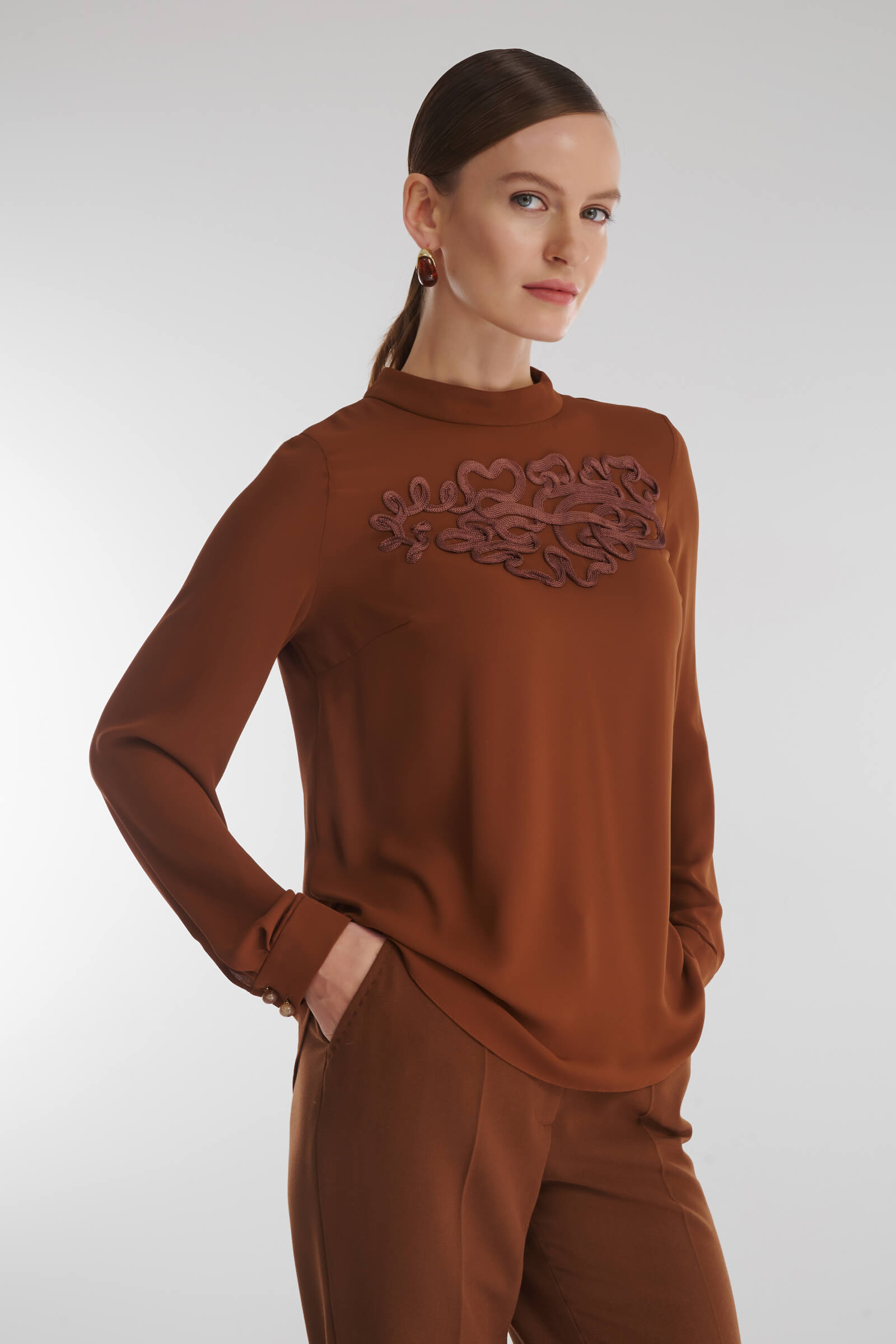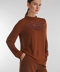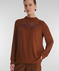 Элегантная блузка с мягким драпирующимся силуэтом сочетает сдержанность и выразительность. Чистые линии кроя подчеркнуты оригинальным декоративным элементом на груди, создающим утонченный акцент. Объемный накладной декор придает выразительности и превращает блузку в центральный элемент образа.