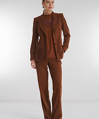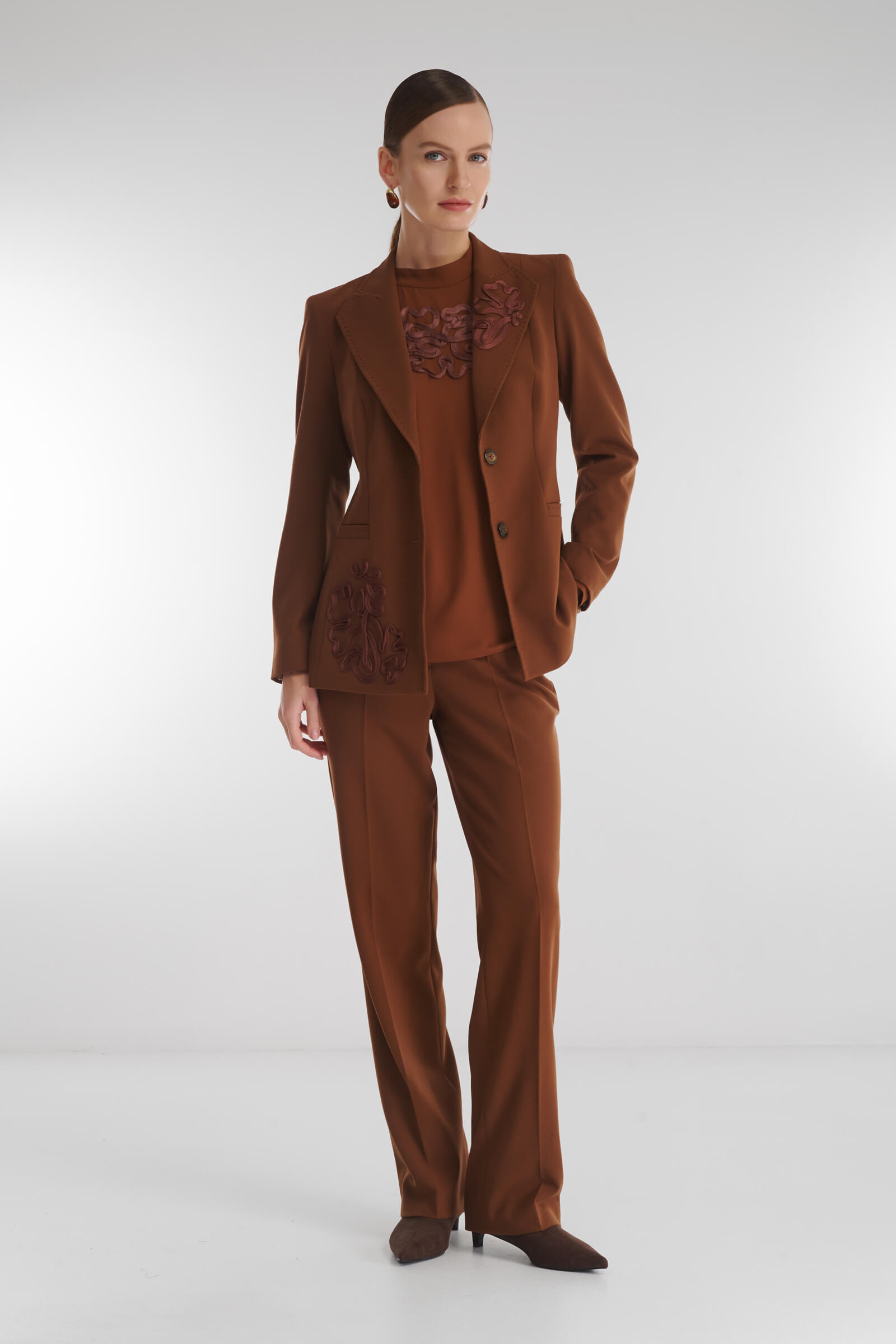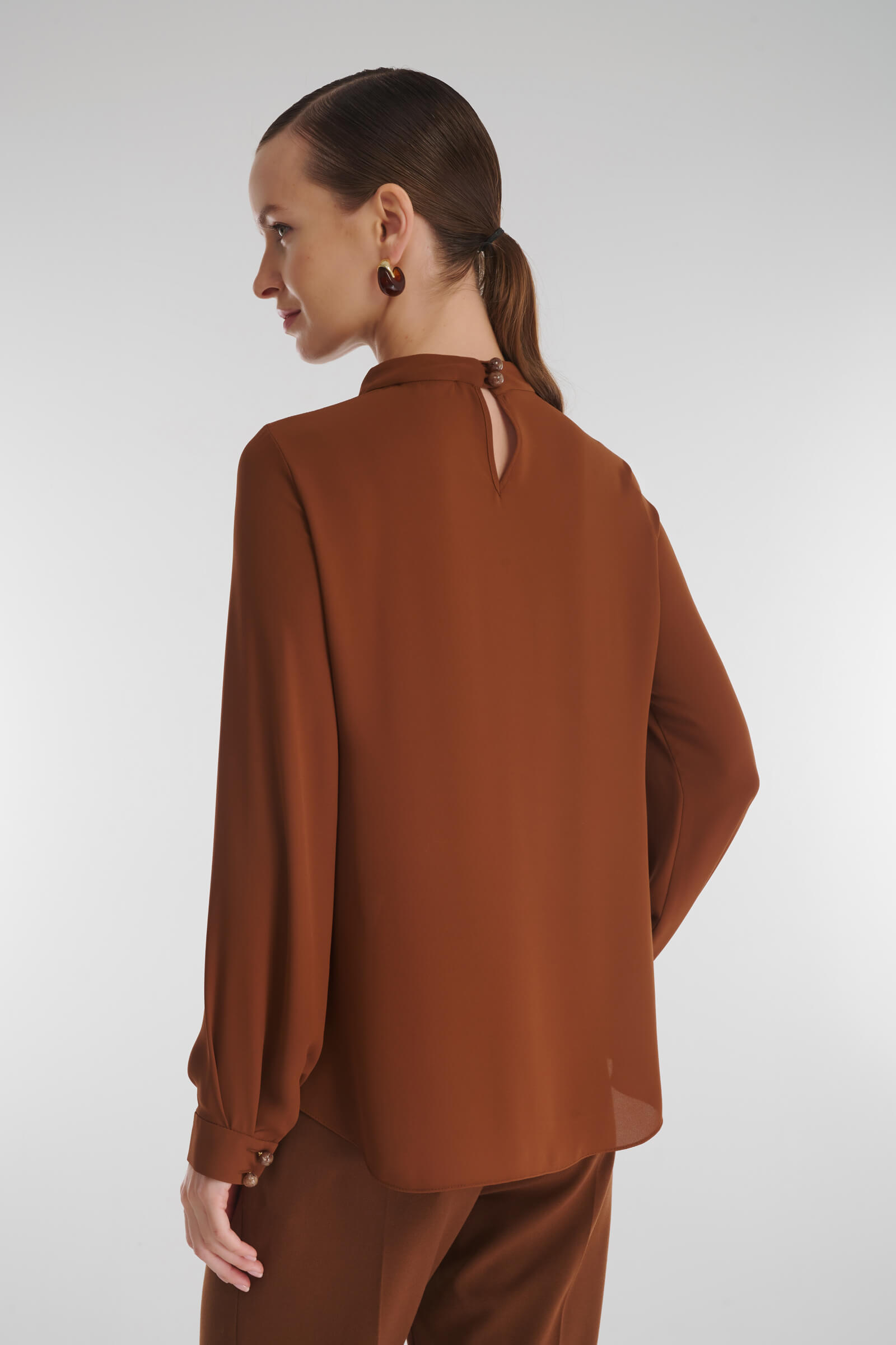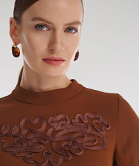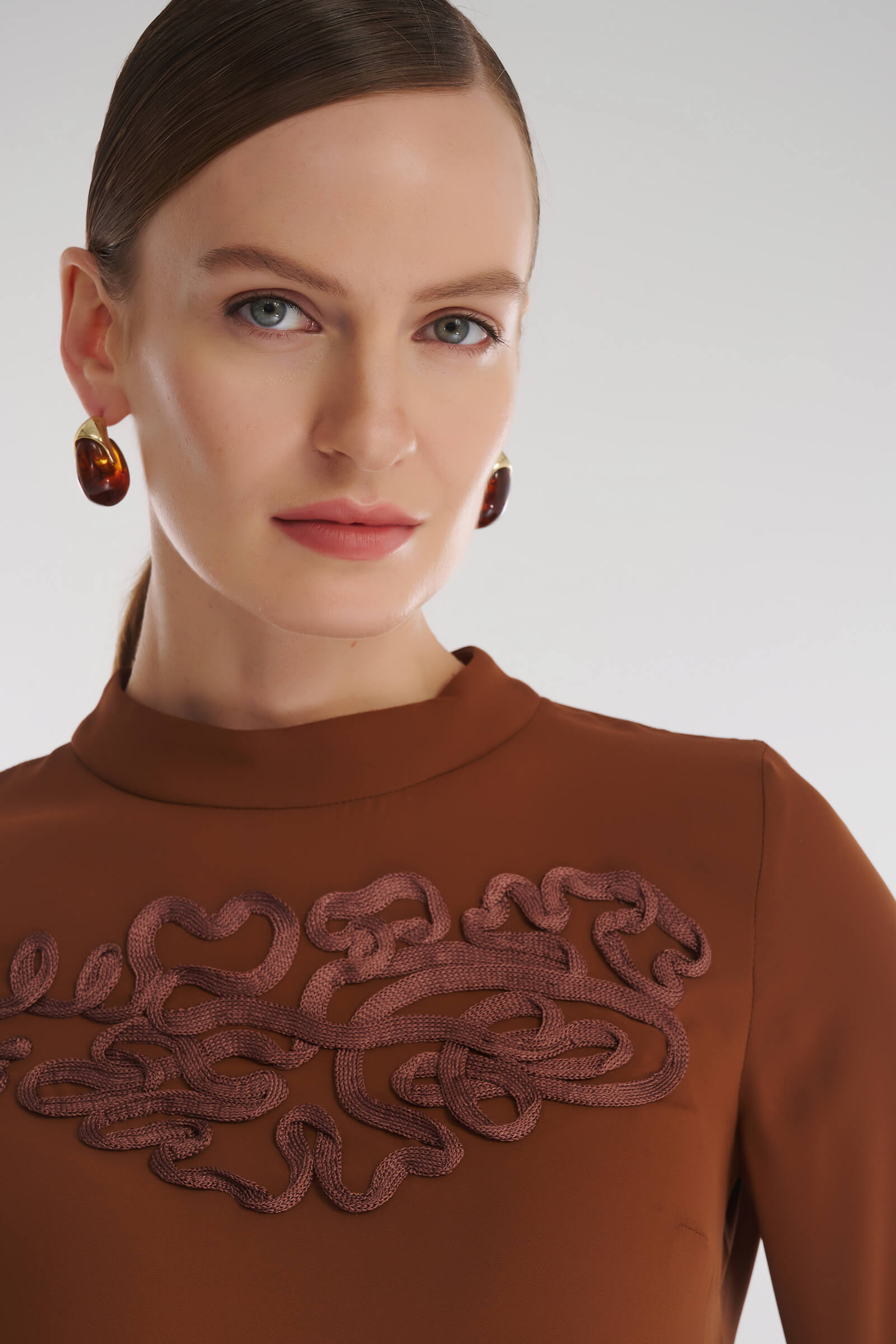 Элегантная блузка с мягким драпирующимся силуэтом сочетает сдержанность и выразительность. Чистые линии кроя подчеркнуты оригинальным декоративным элементом на груди, создающим утонченный акцент. Объемный накладной декор придает выразительности и превращает блузку в центральный элемент образа.