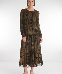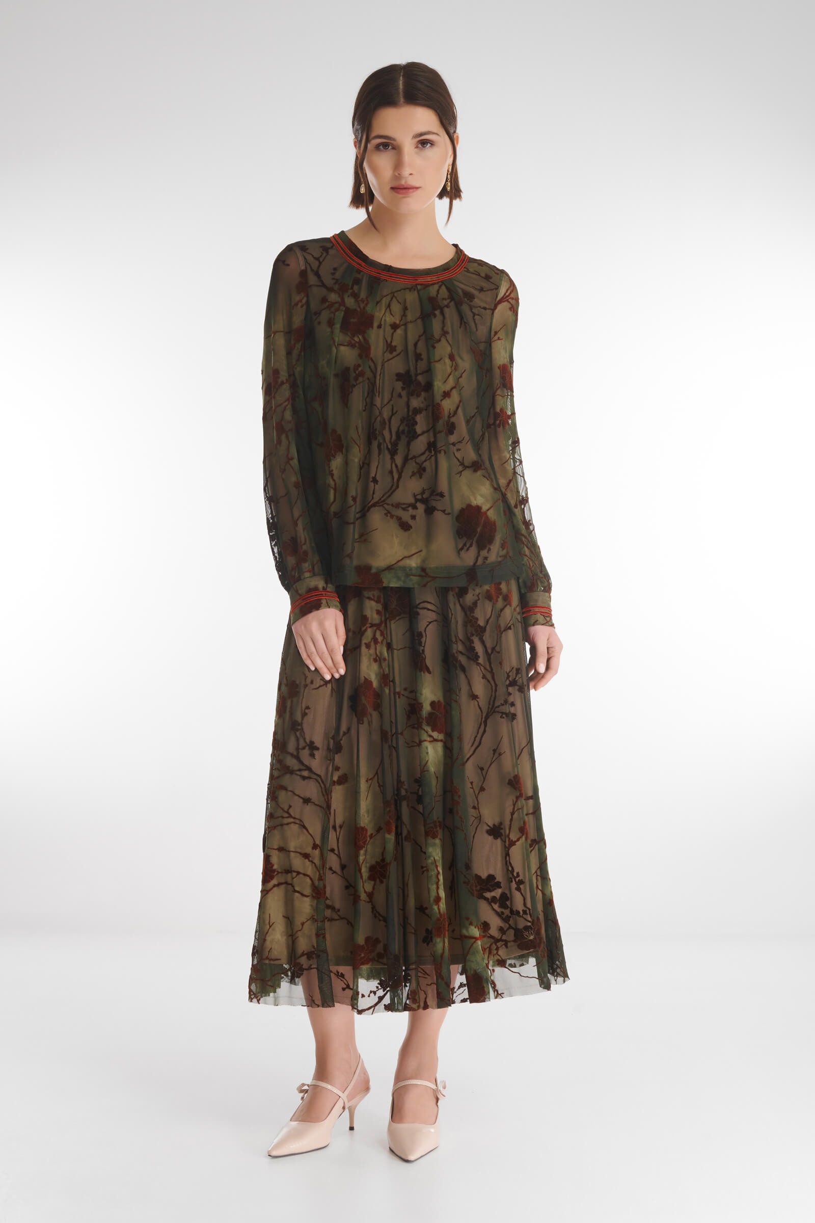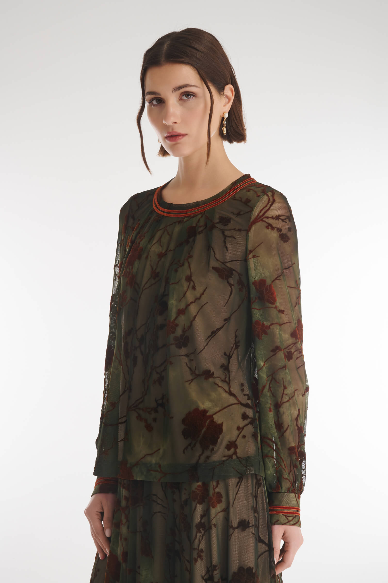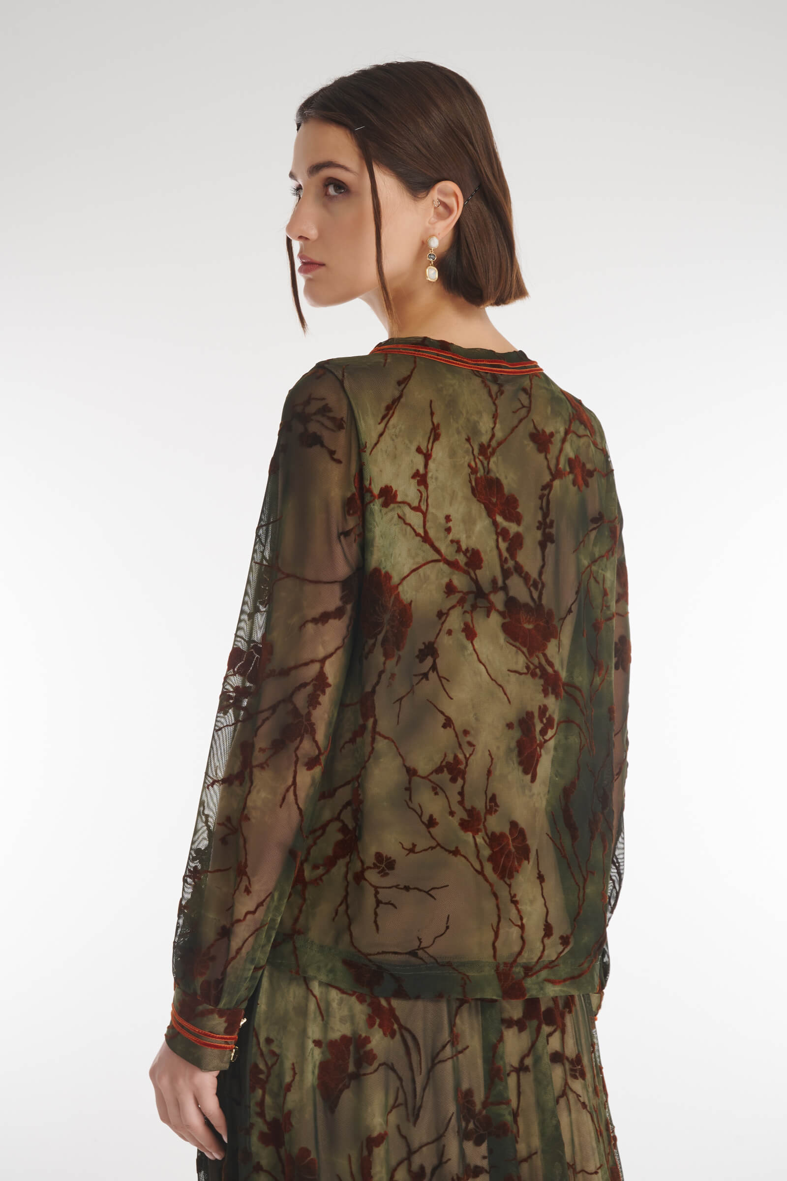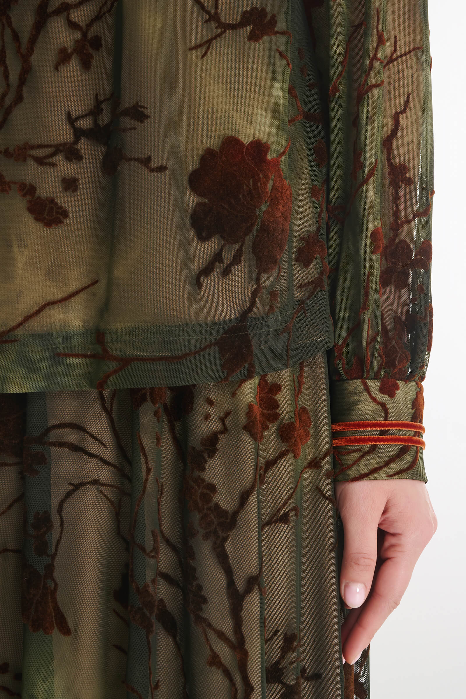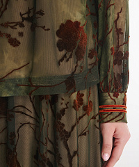 Воздушная и утонченная блузка, где бархатный цветочный узор на эластичном тюле плавно сочетается с мягкой подкладкой лицевой части. Прозрачные рукава придают образу легкость и элегантность, а декоративные складки создают женственный силуэт. Манжеты с акцентными пуговицами и контрастная отделка выреза делают образ завершенным и стильным — идеальный выбор для особого случая или эффектного повседневного образа.