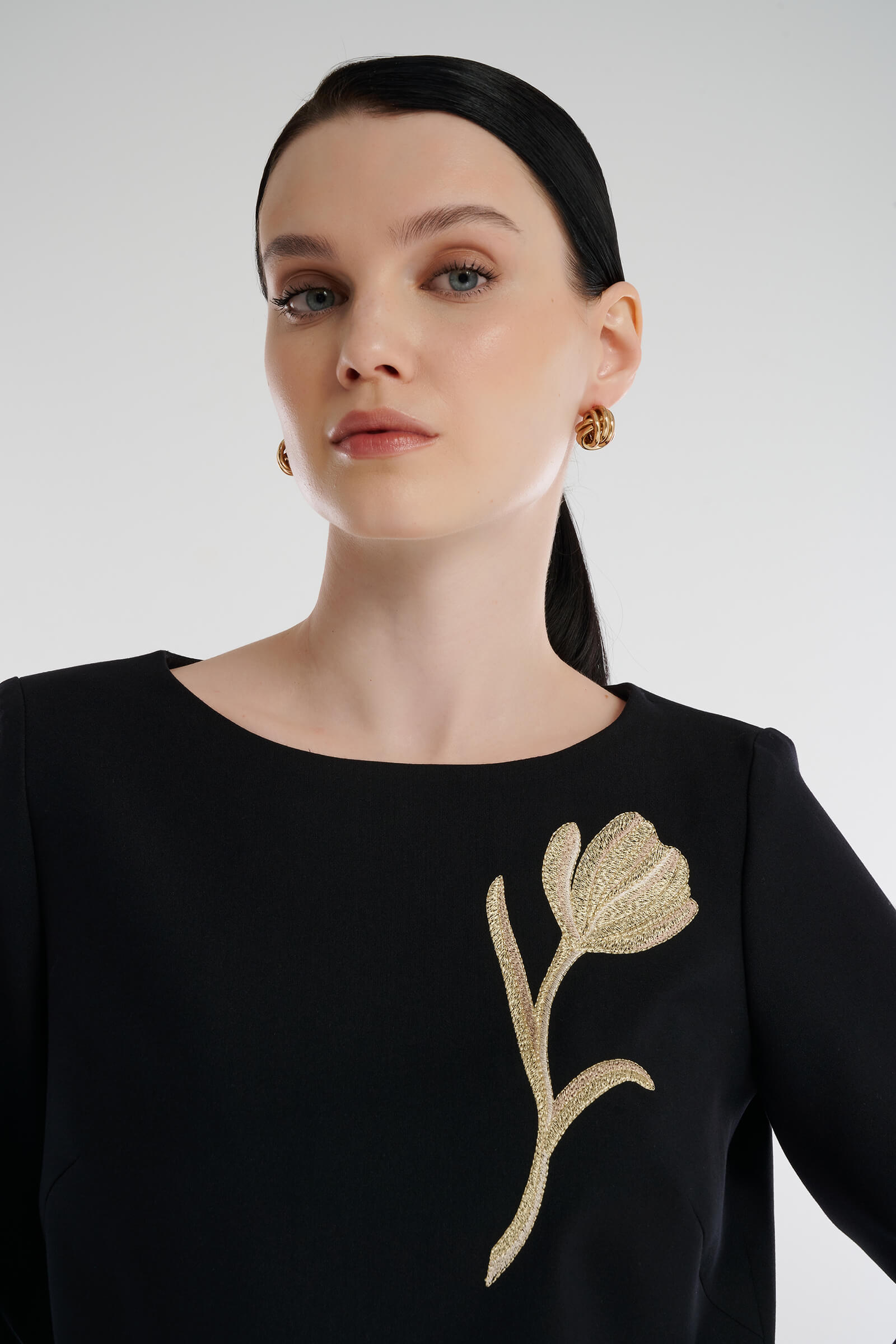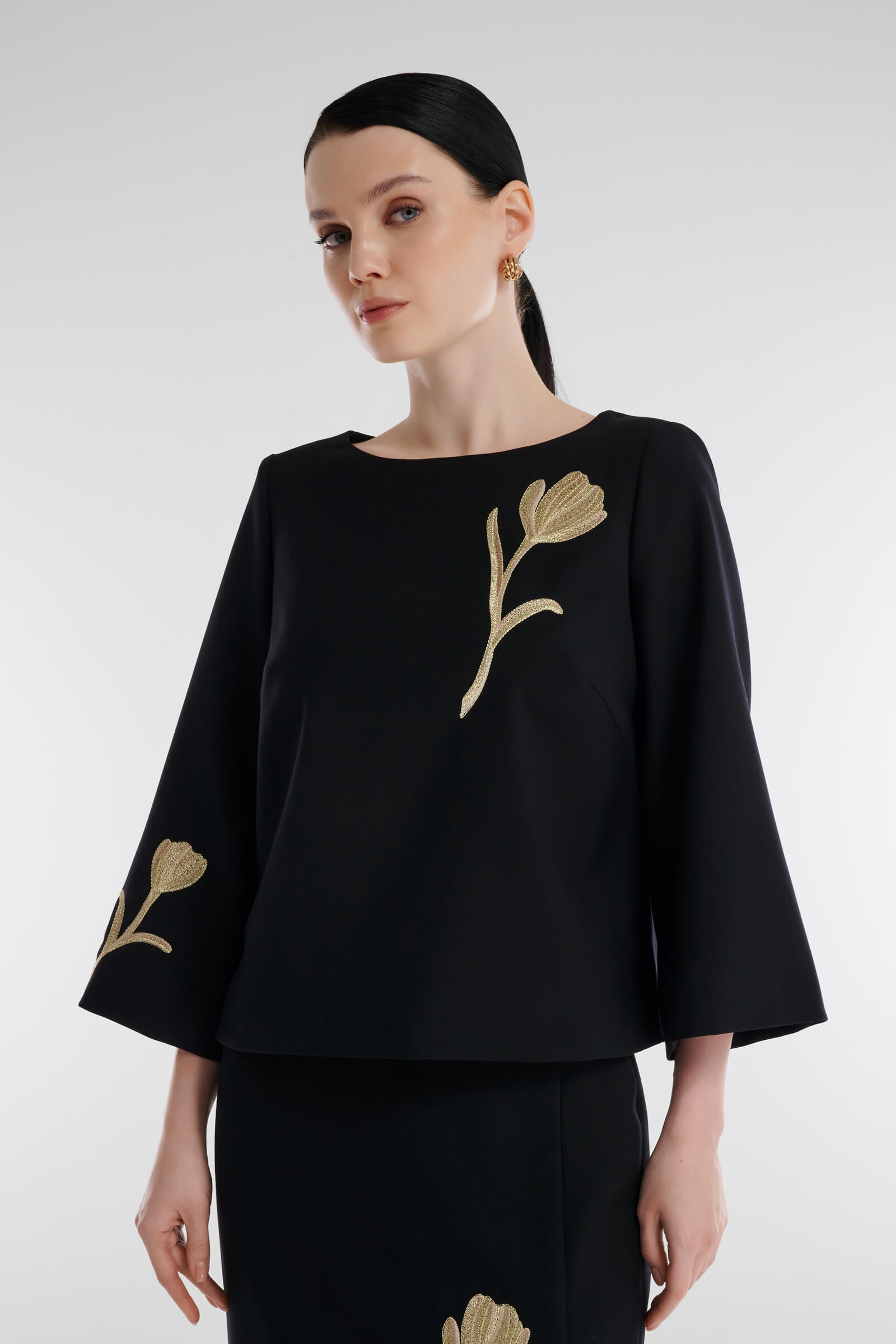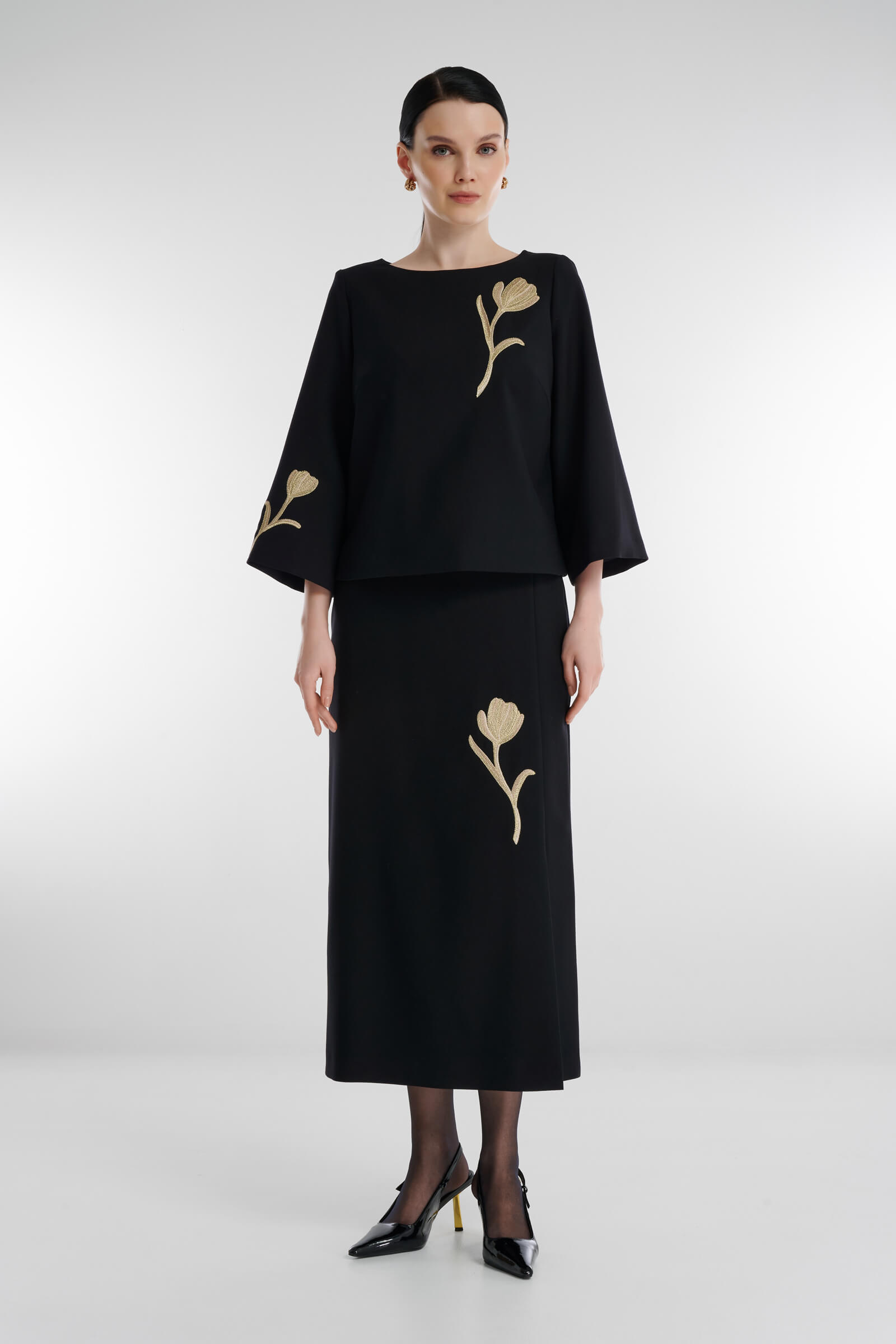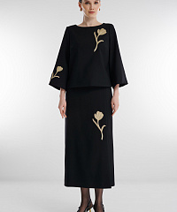 Блузка из костюмной ткани меняет представление о нарядной классике. Свободный крой и лаконичный силуэт обеспечивают комфорт и универсальность, а цветочная вышивка добавляет утонченный акцент. В сочетании с юбкой из той же линии блузка образует элегантный комплект для особых случаев.