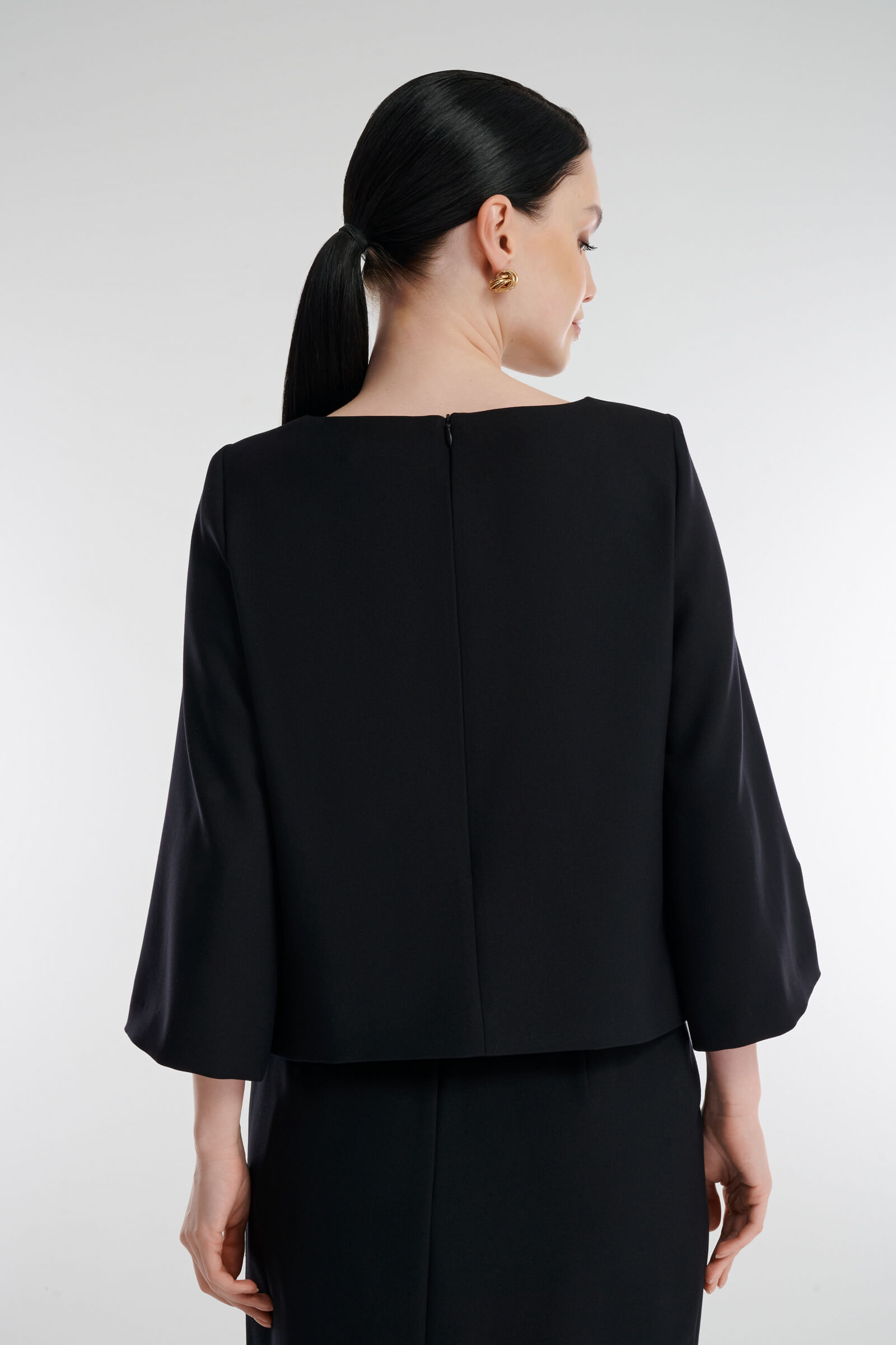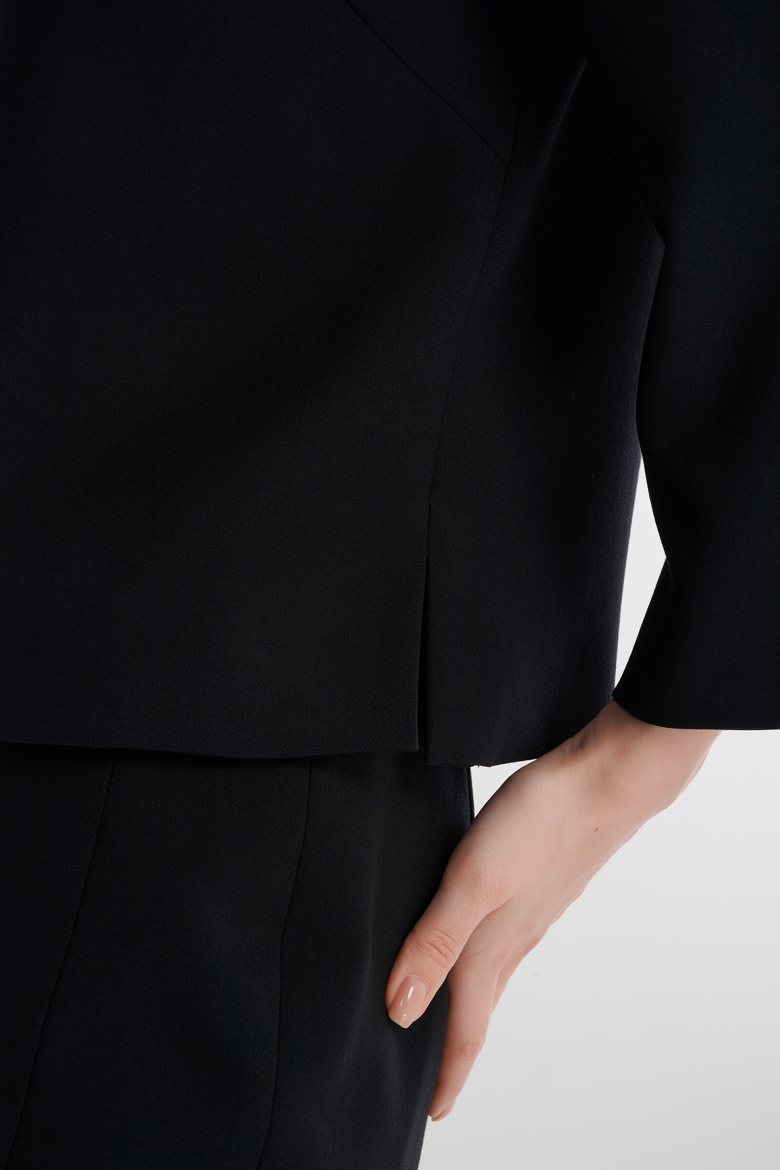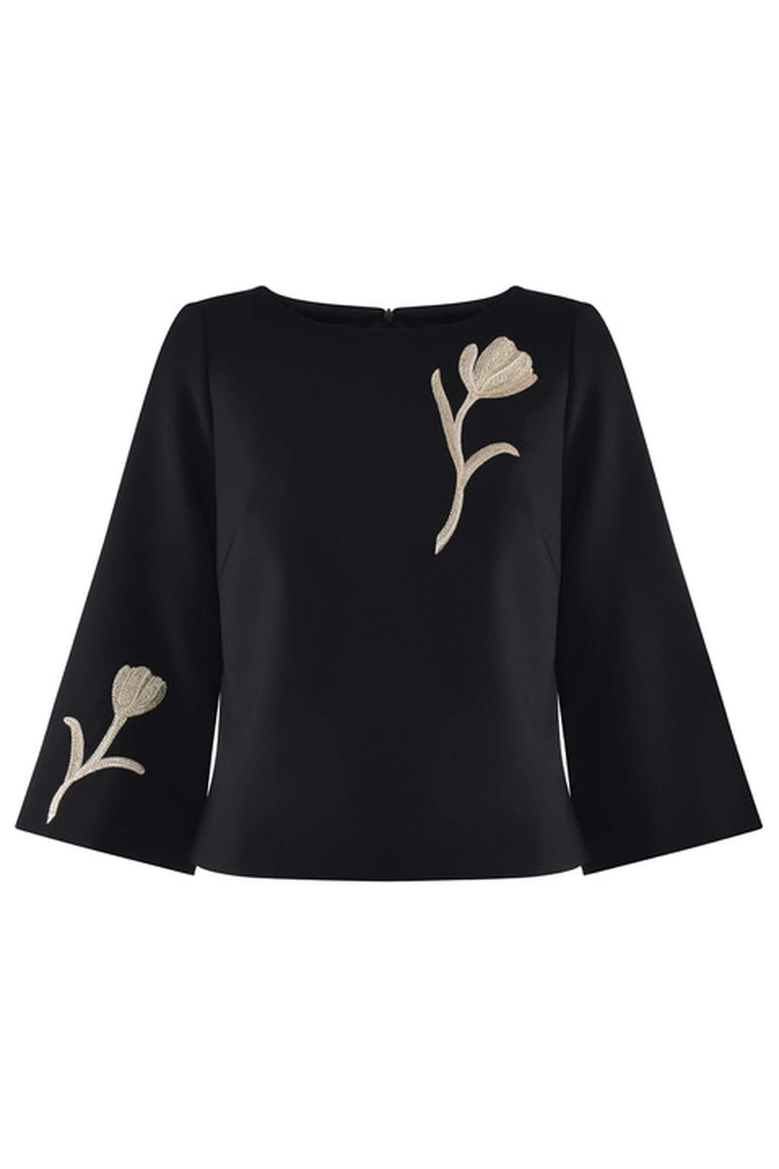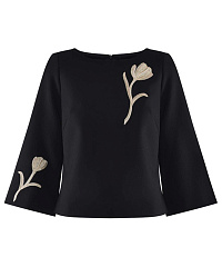 Блузка из костюмной ткани меняет представление о нарядной классике. Свободный крой и лаконичный силуэт обеспечивают комфорт и универсальность, а цветочная вышивка добавляет утонченный акцент. В сочетании с юбкой из той же линии блузка образует элегантный комплект для особых случаев.
