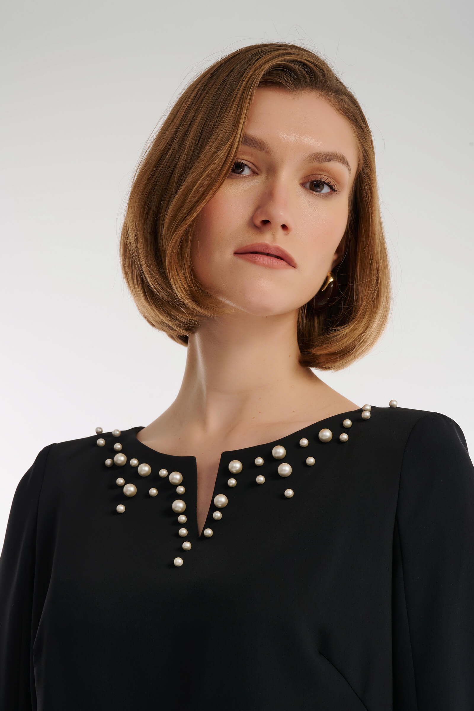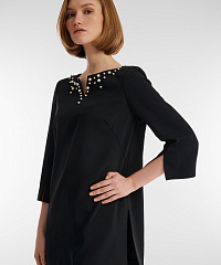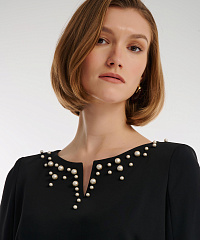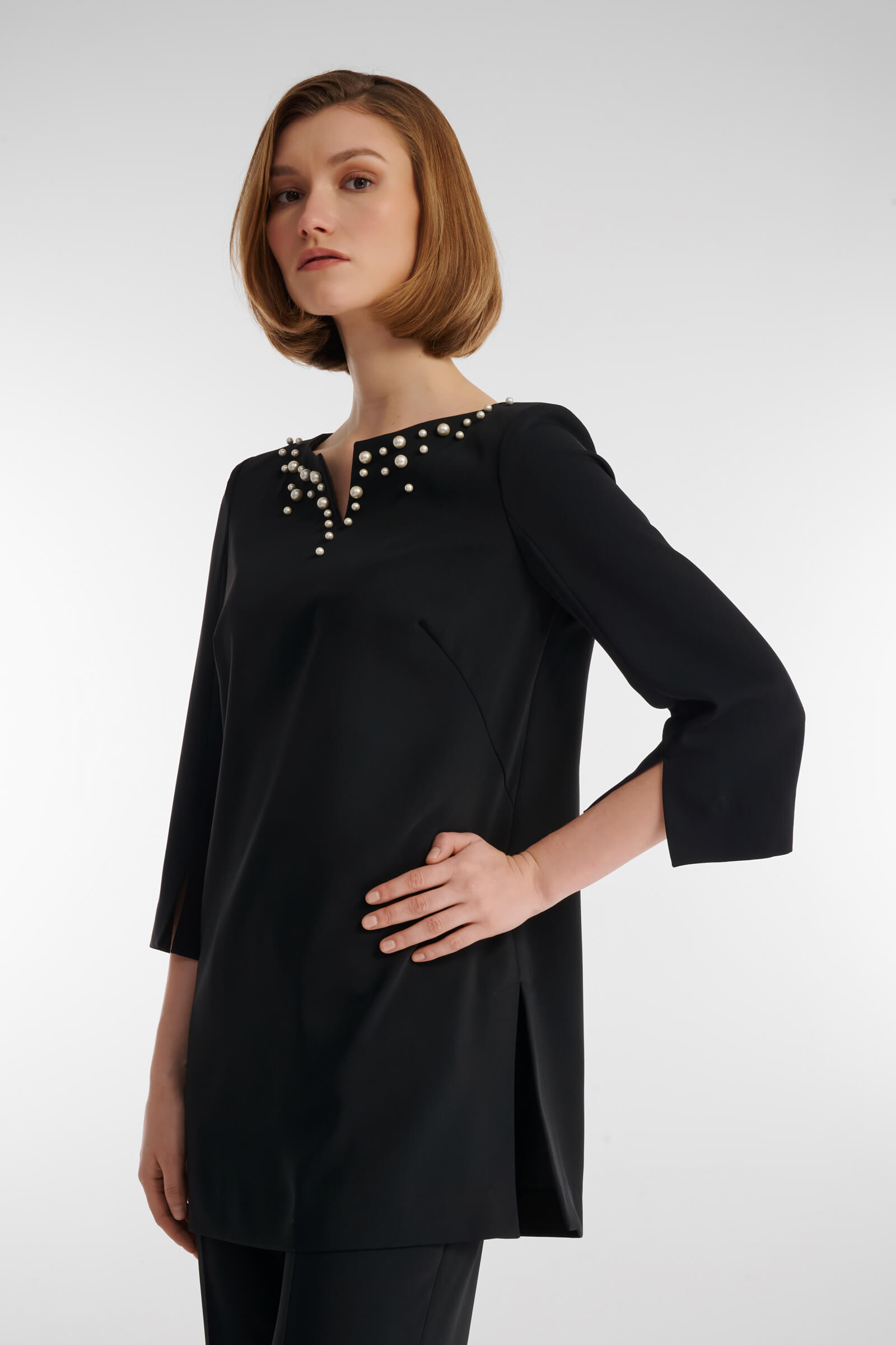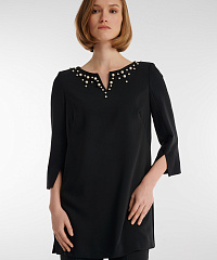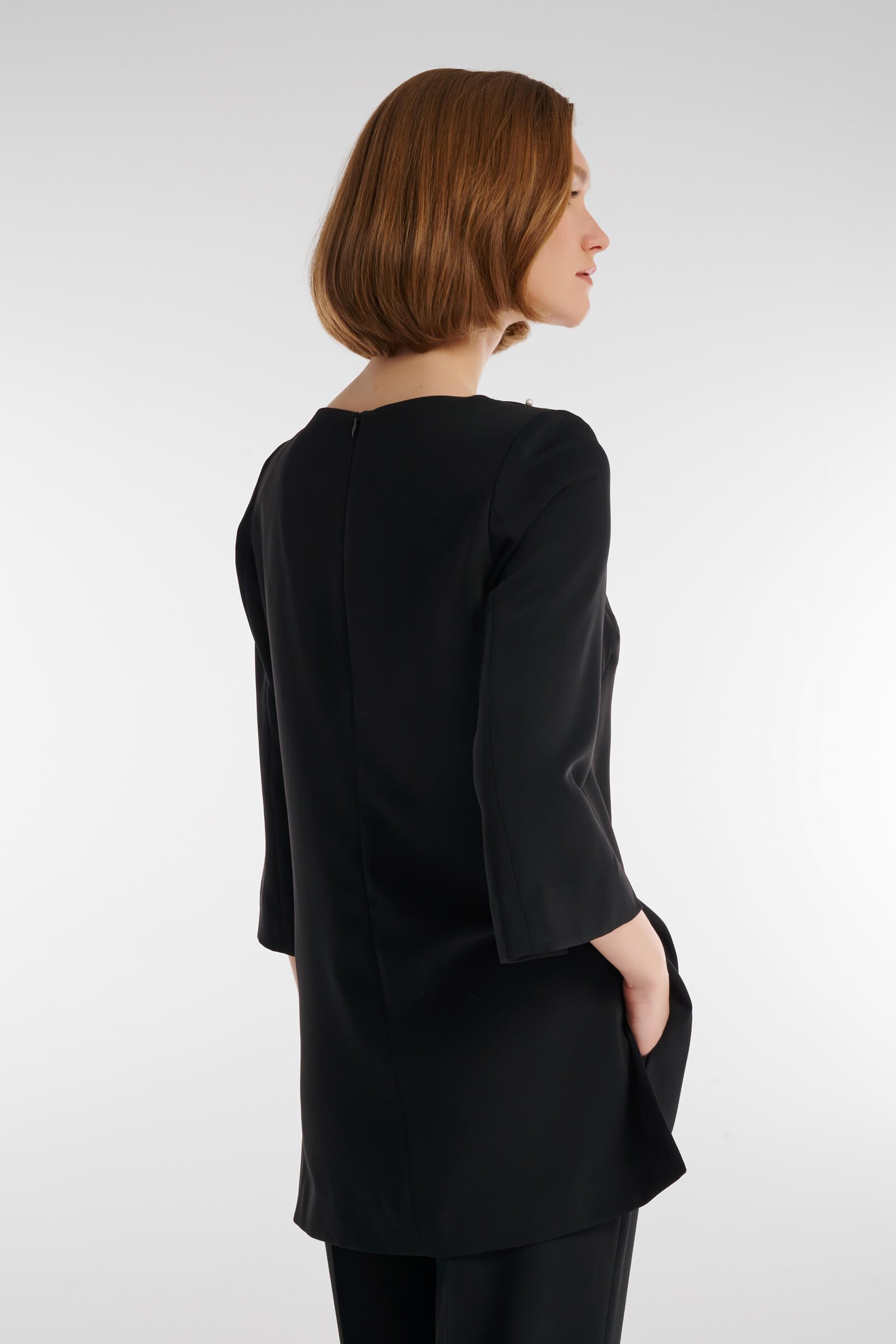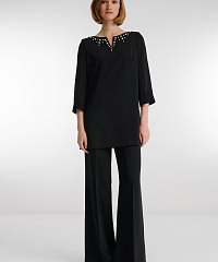 Блузка из струящейся поливискозы. Удлиненная модель с V-образным вырезом прекрасно вытягивает силуэт, боковые разрезы обеспечивают комфорт в движении. Небольшие подплечники делают линию плеча более графичной. Блузку можно сочетать с брюками из той же линейки для создания готового комплекта.
