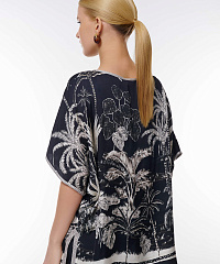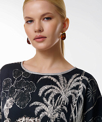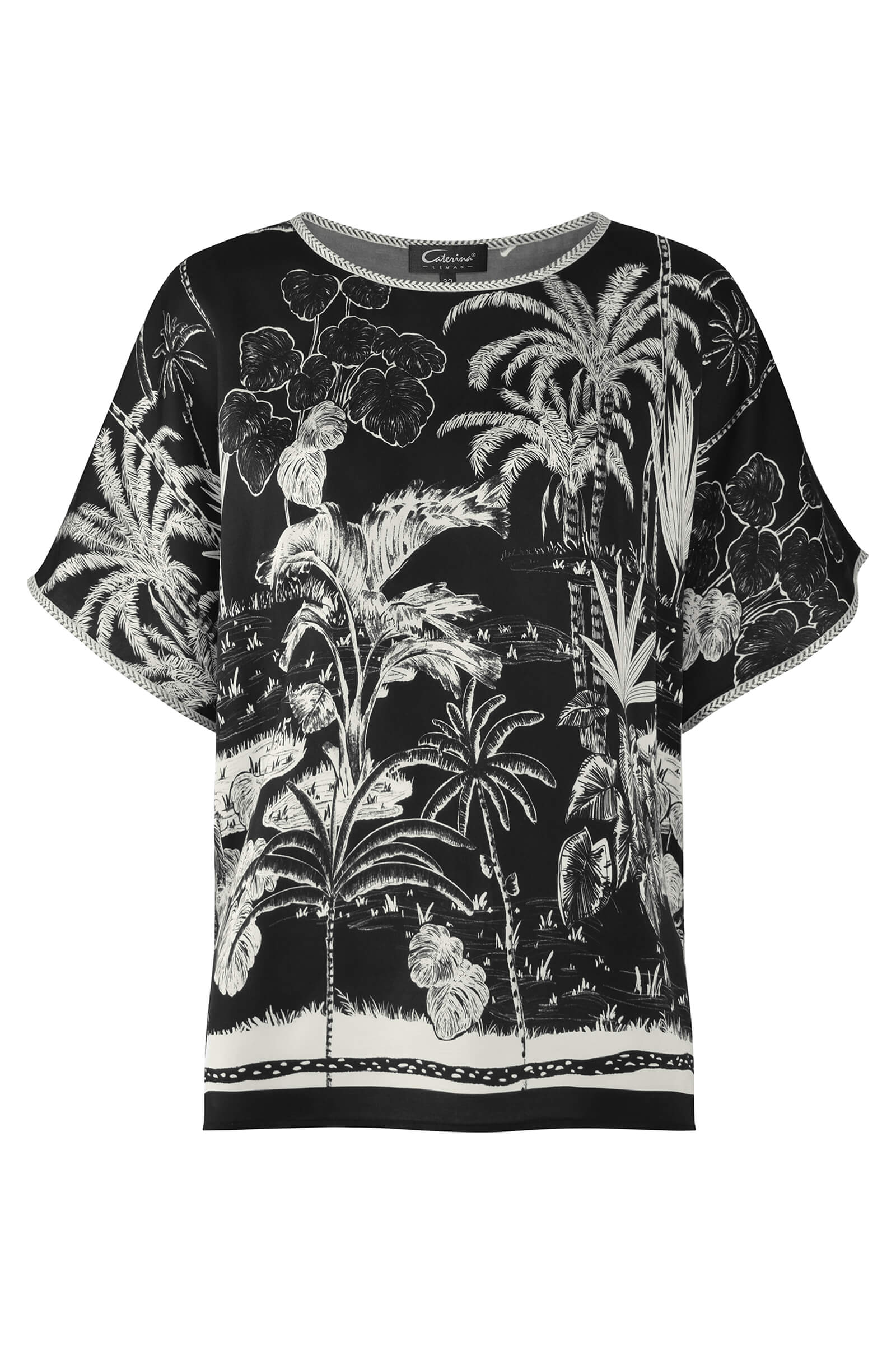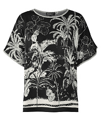 Футболка с растительным принтом от Caterina Leman. Черный фон с выразительным белым узором создает эффектный контраст, а свободный крой и короткие рукава гарантируют комфорт в любой ситуации. Идеально подходит для повседневной носки или сочетания с более элегантными образами. Удобная ткань способствует свободному движению, а округлый вырез подчеркивает женственность.
