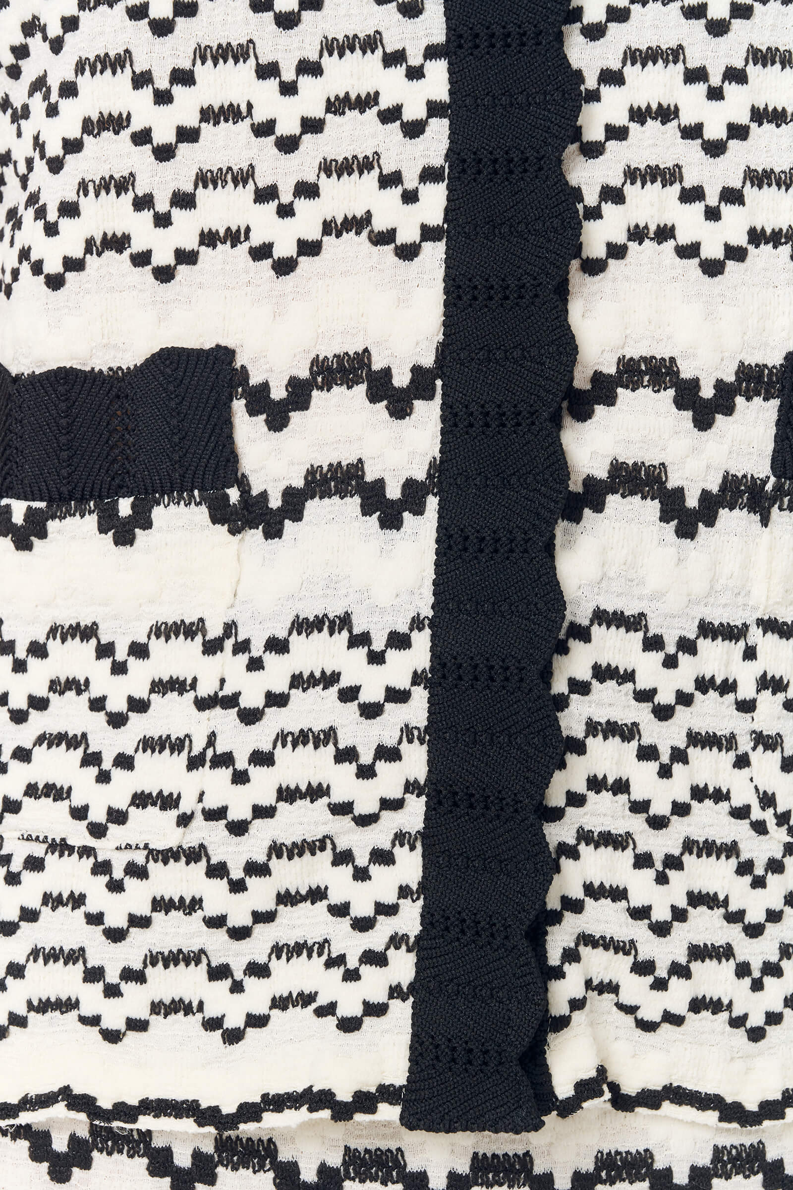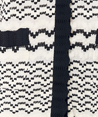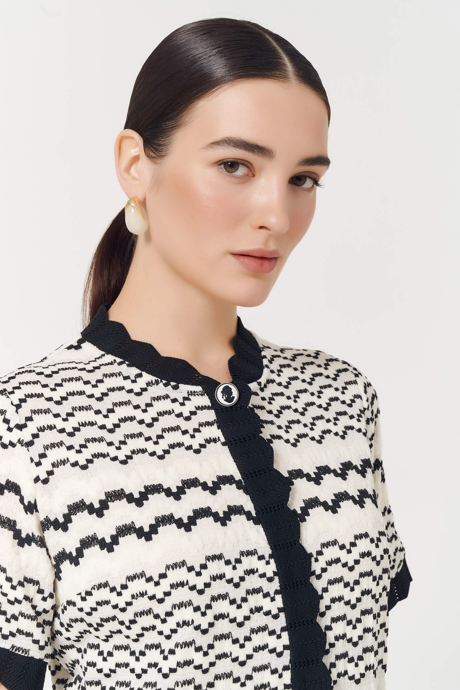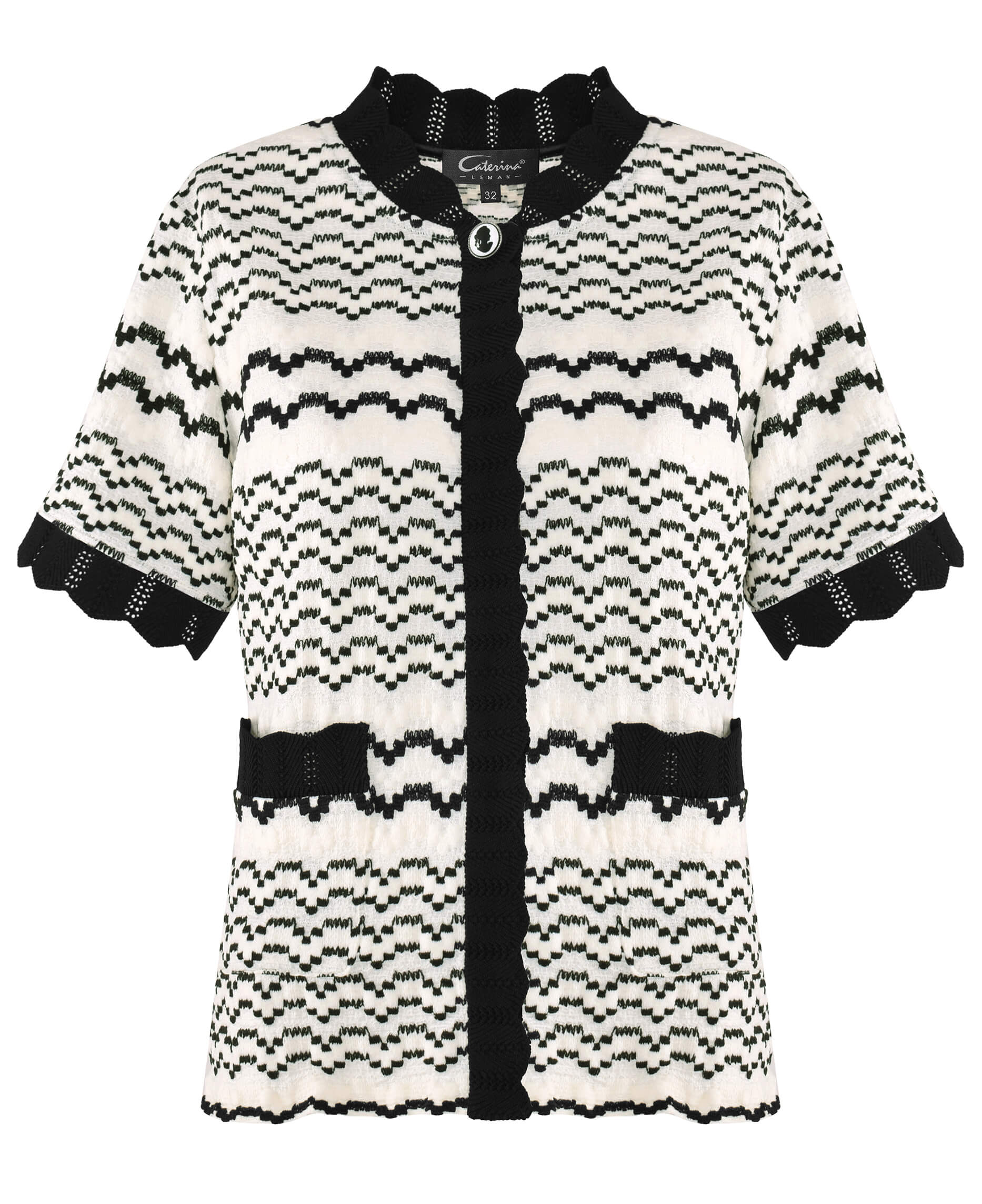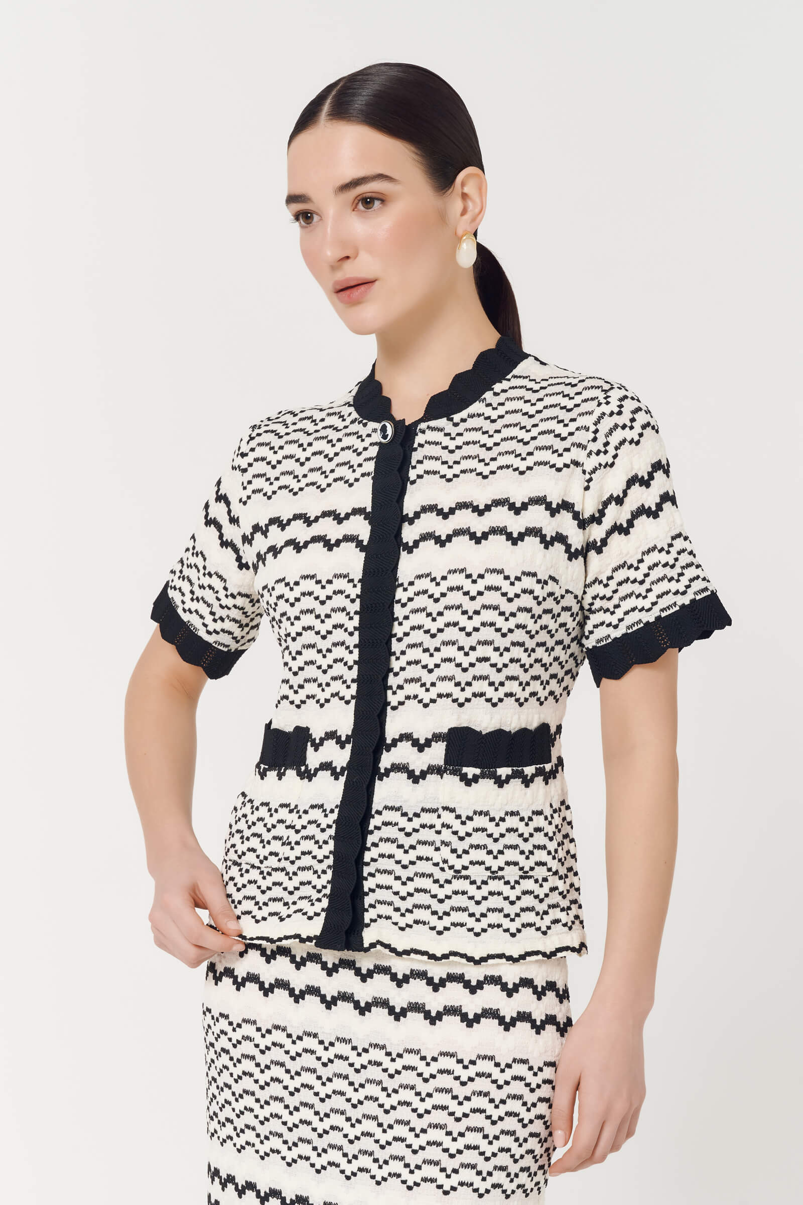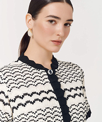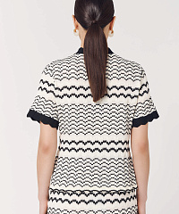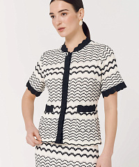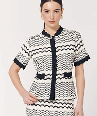 Трикотажная блузка с коротким рукавом и застежками на кнопках станет отличным дополнением к сдержанному образу. Узор в виде дугообразных полос смотрится необычно и уникально, а окантовка с контрастным черным цветом добавляет изюминку модели. В комплект можно добавить юбку из этой же линейки.