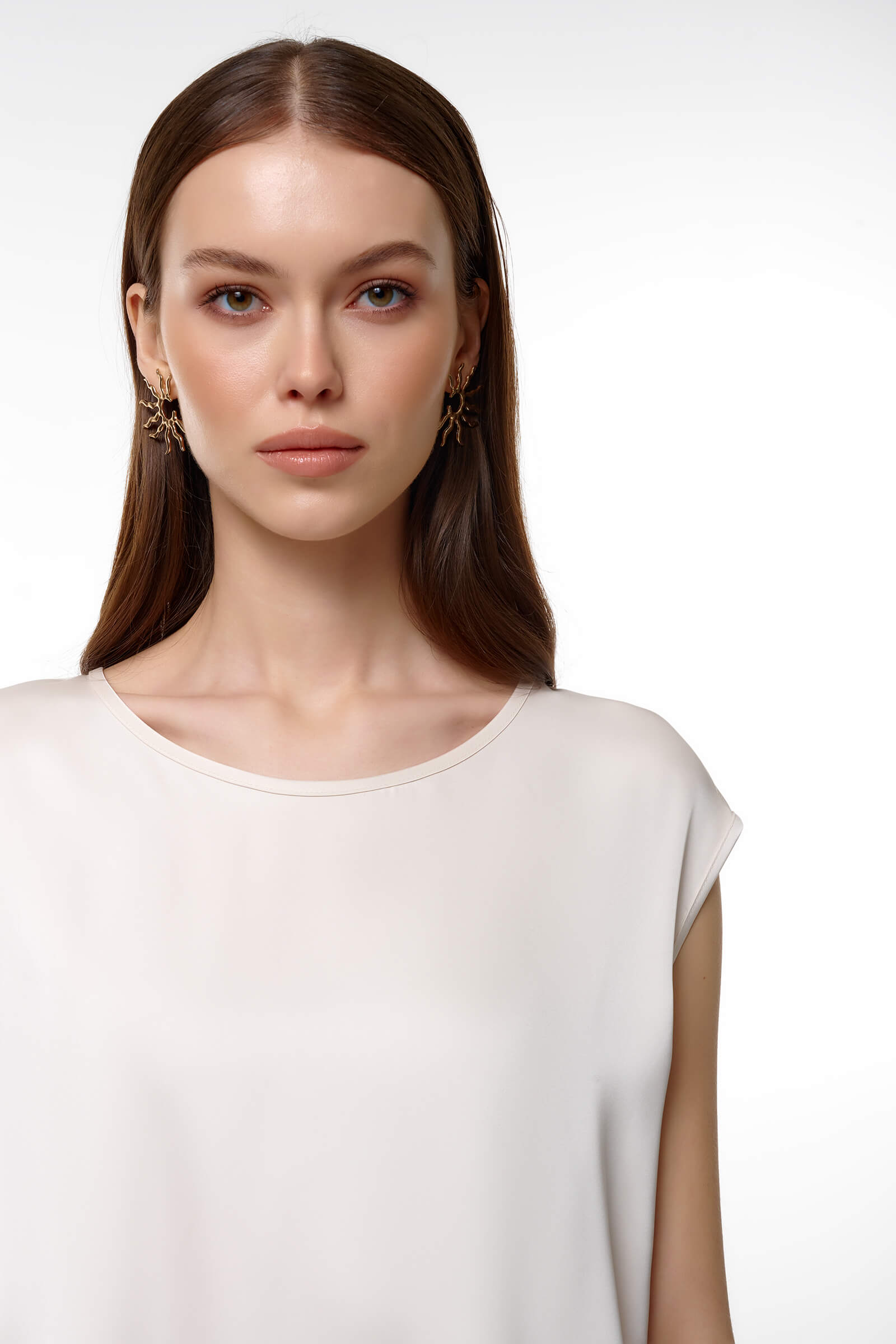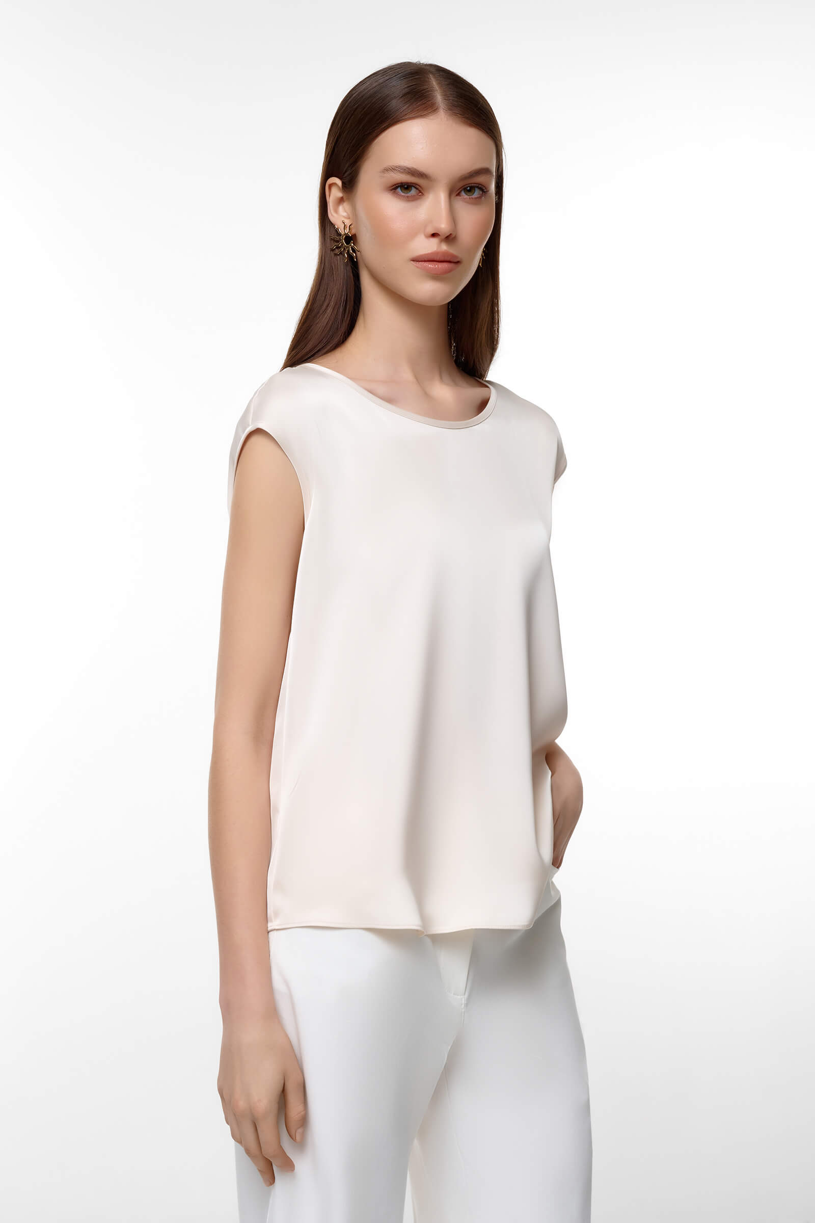 Элегантный топ со струящейся фактурой станет универсальной основой гардероба. Лаконичный дизайн уместен и в деловых, и в вечерних образах. Свободный крой позволяет носить изделие навыпуск или заправленным — в любом варианте образ выглядит стильно и современно