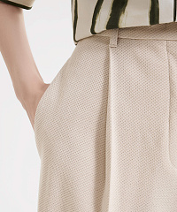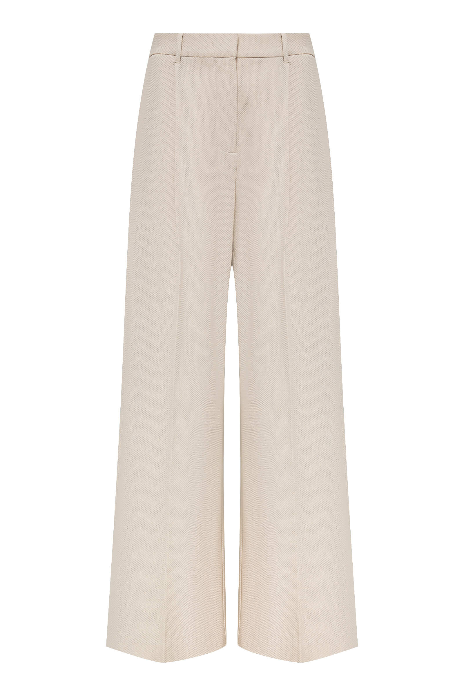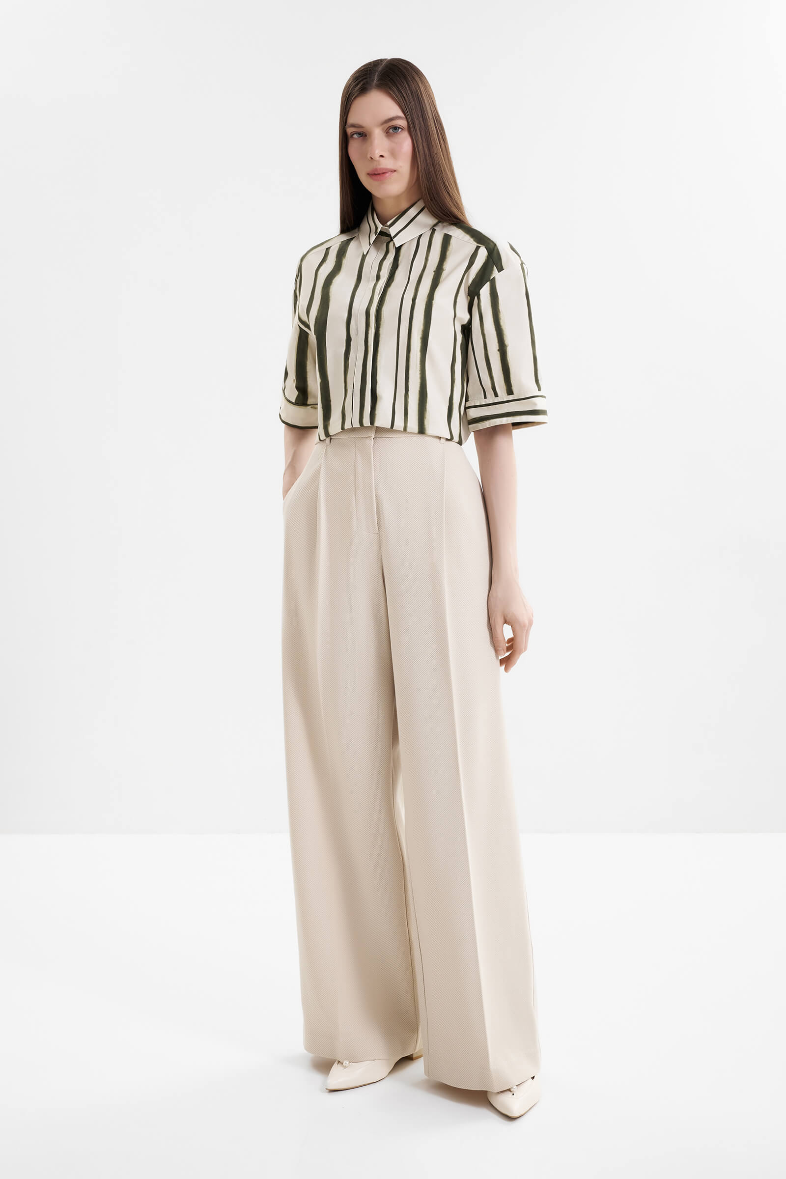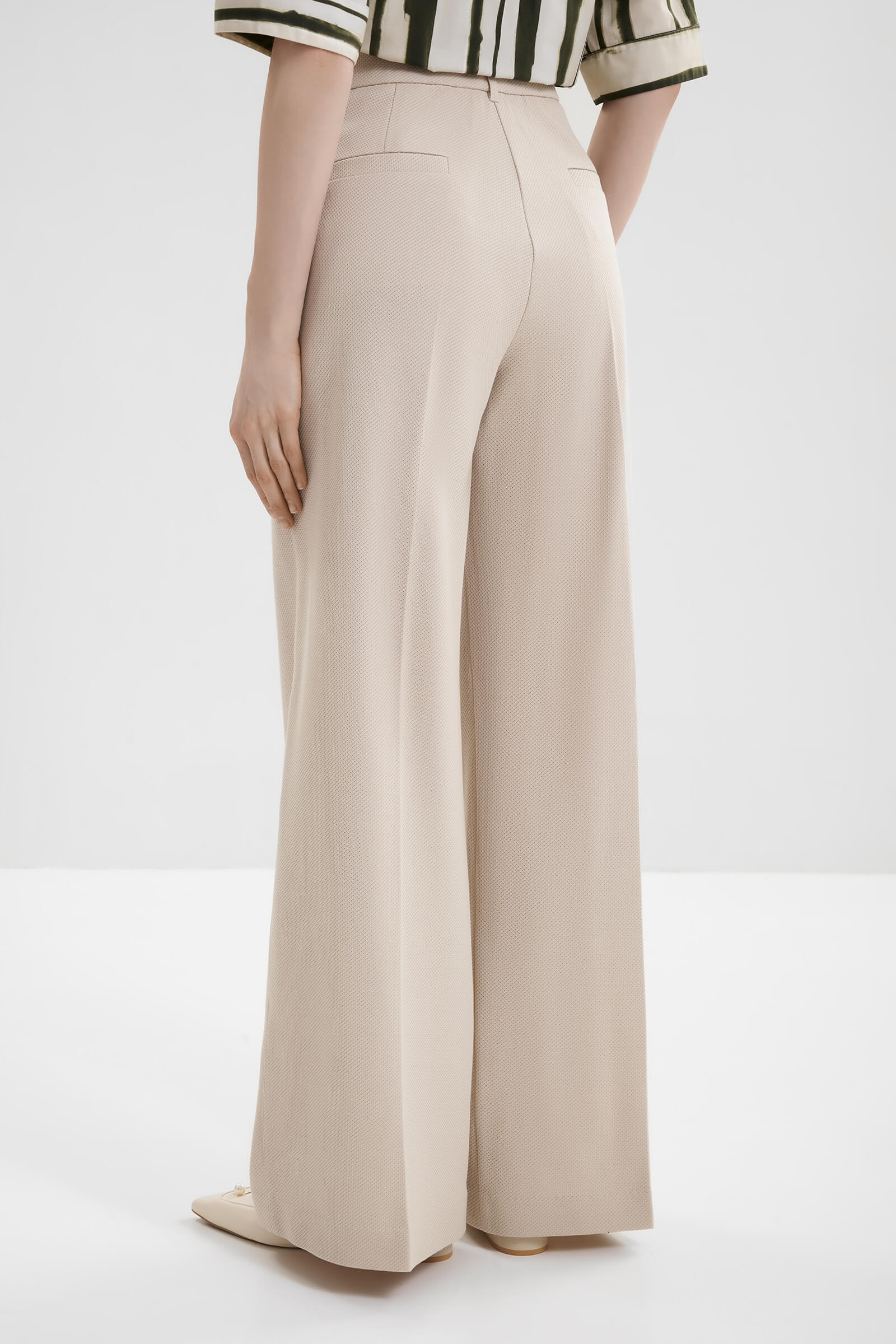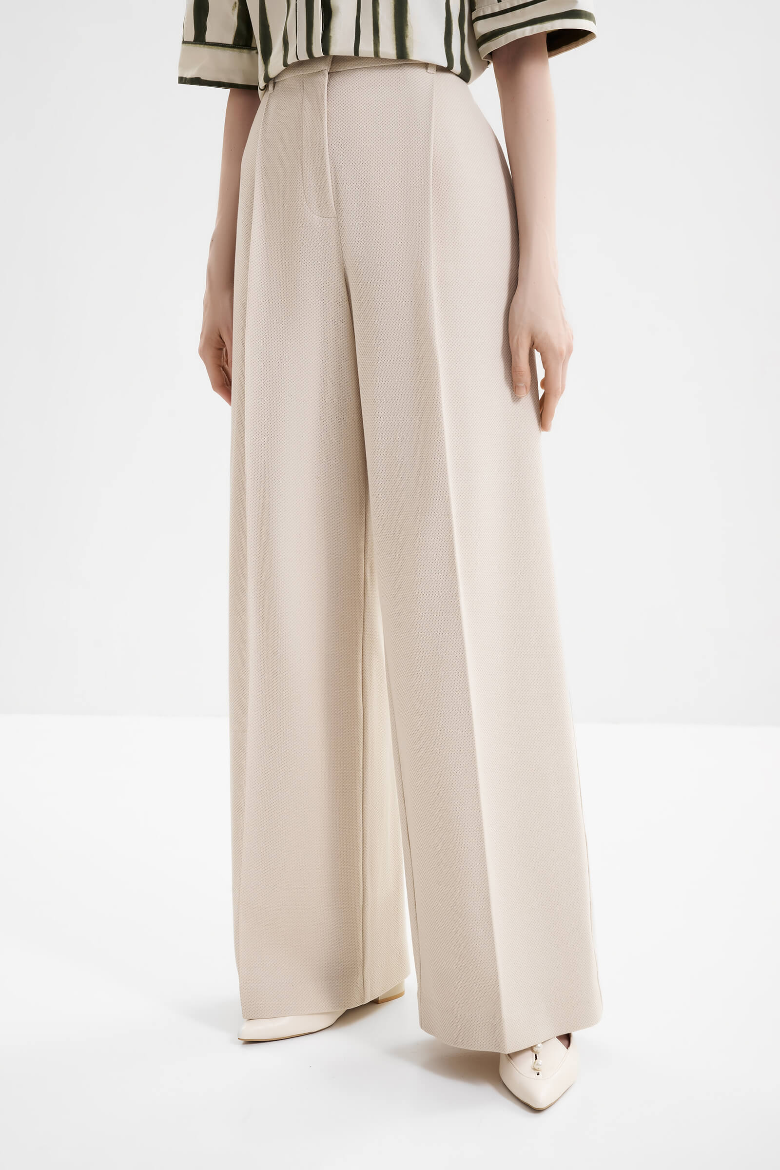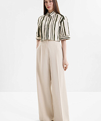 - Брюки-палаццо полной длины с характерными защипами
