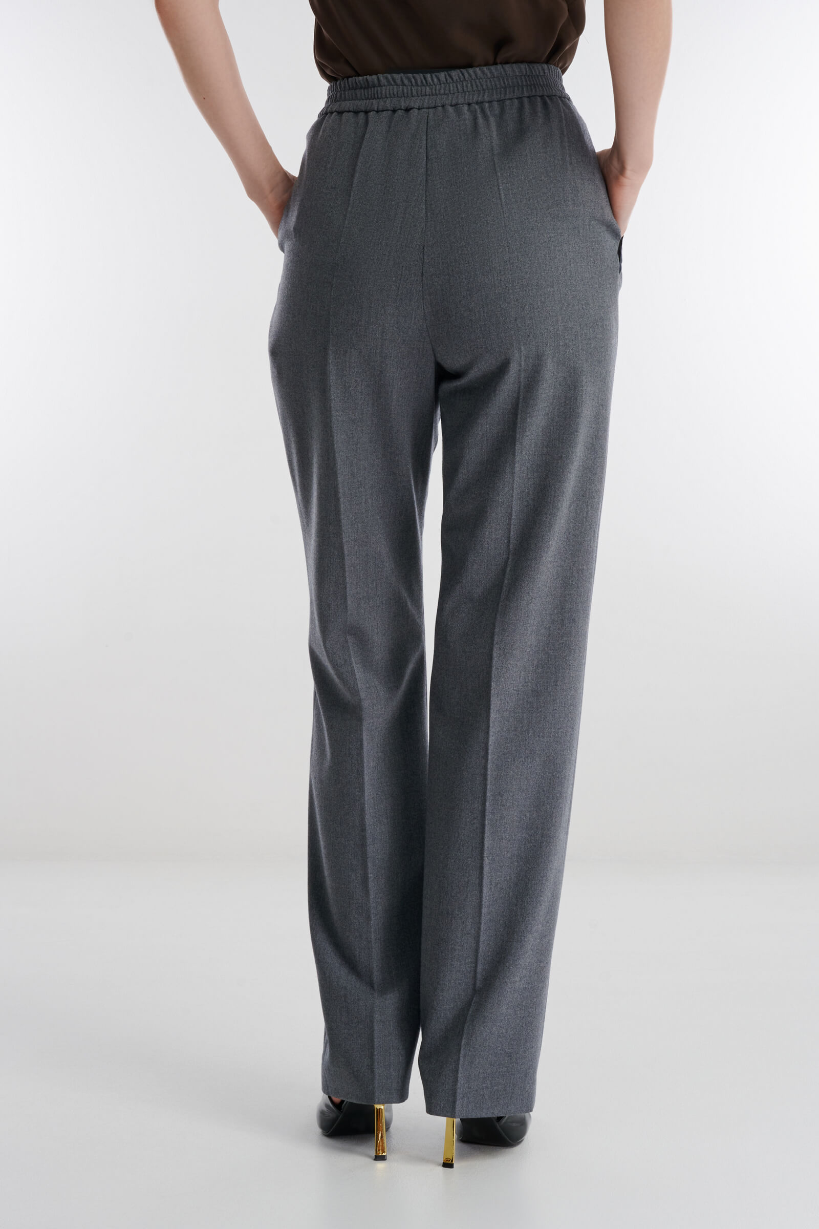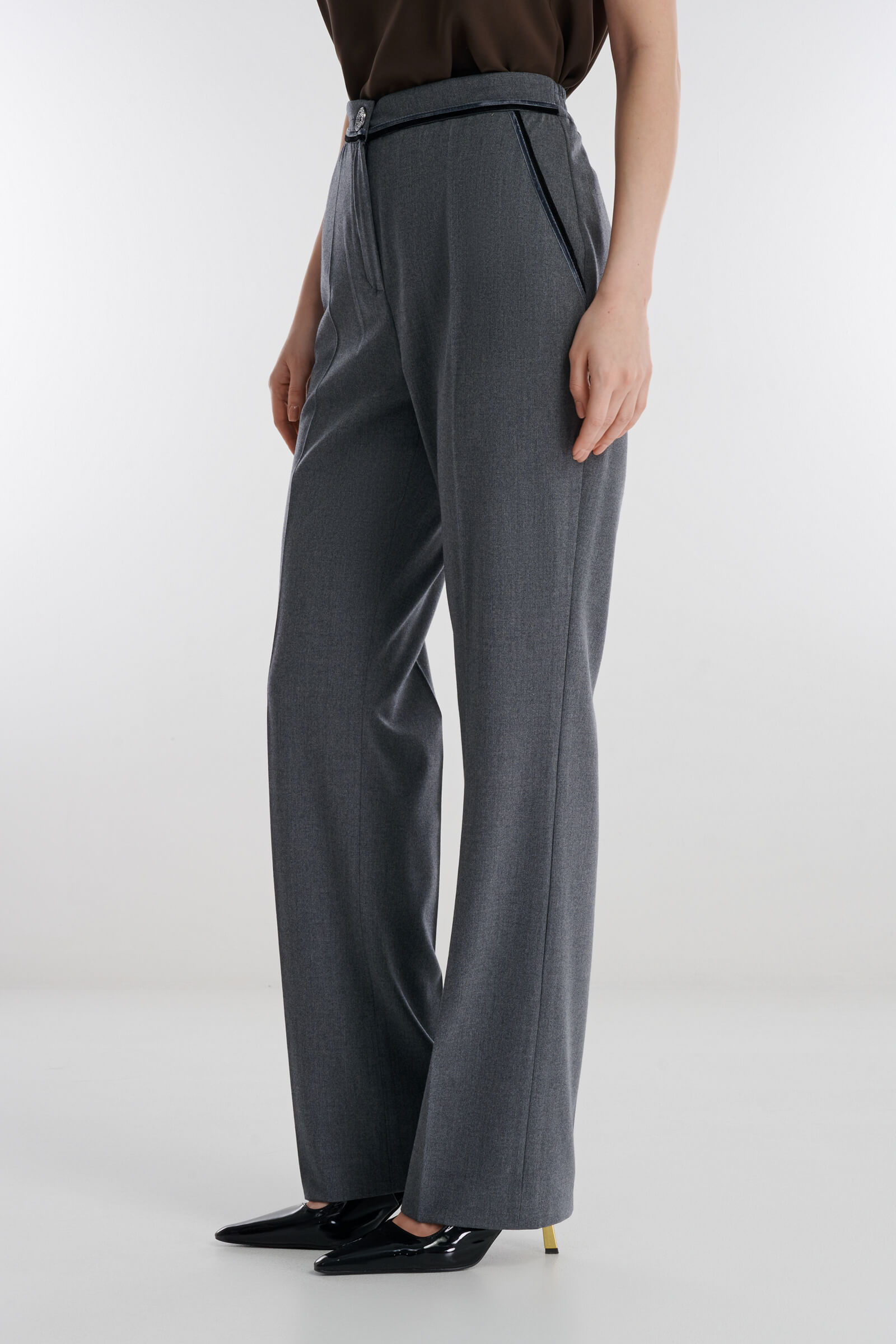 Брюки прямого кроя с бархатной окантовкой — элегантное переосмысление классического делового стиля. Мягкая костюмная ткань дарит комфорт во время носки, а эластичная вставка на поясе гарантирует безупречную посадку и удобство в течение всего дня.