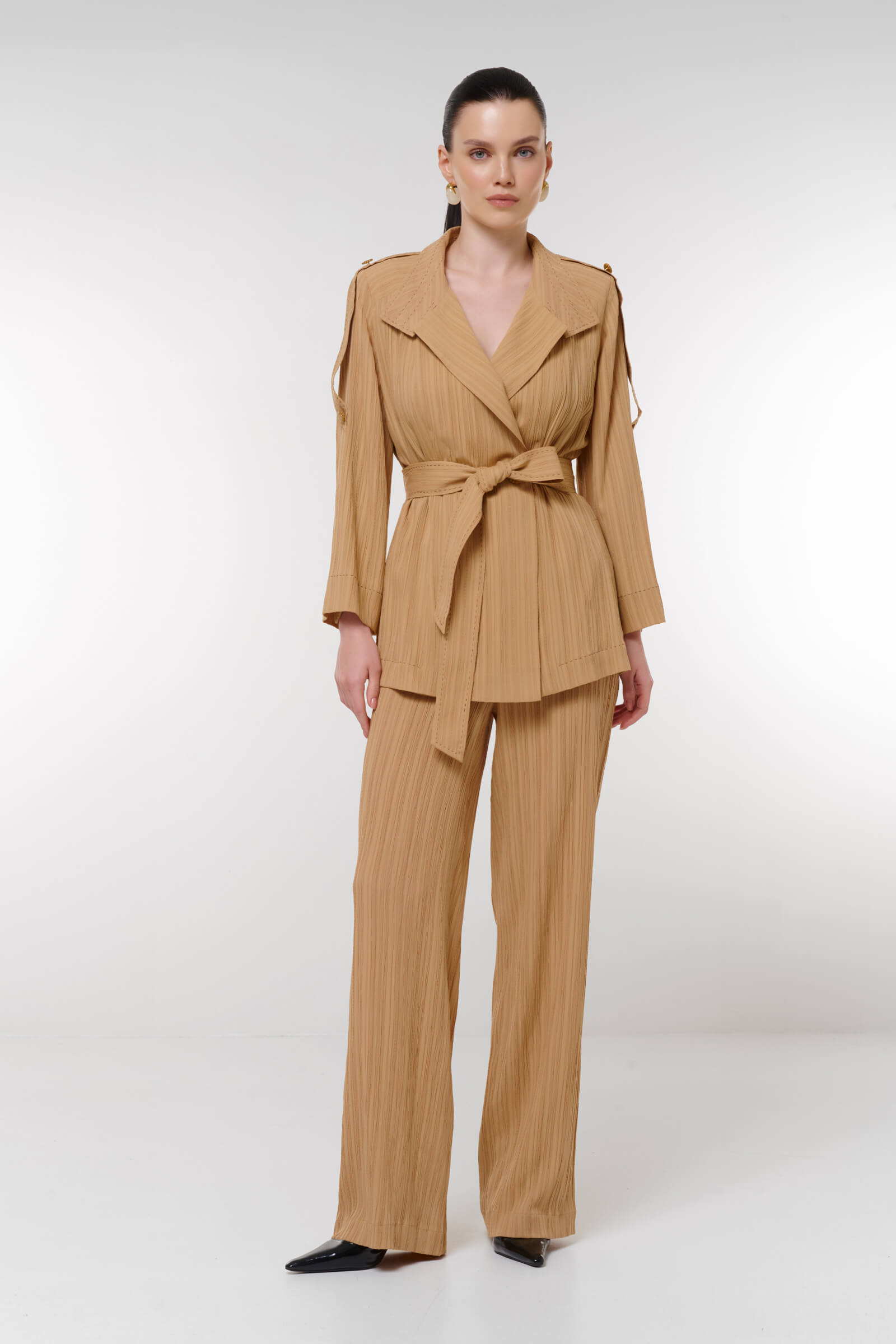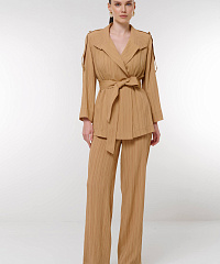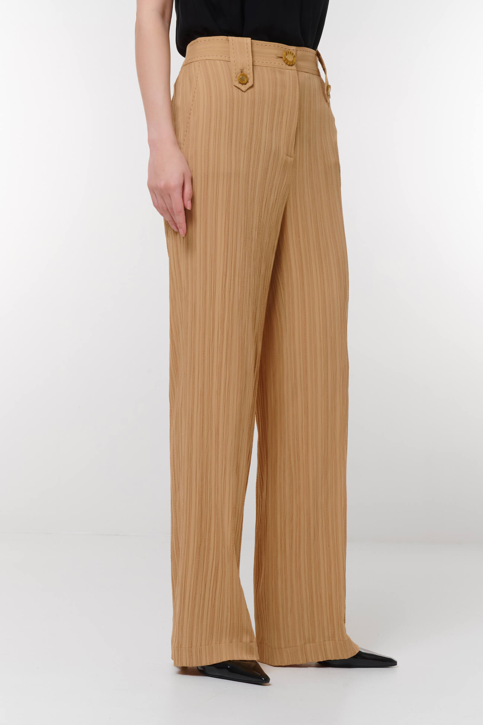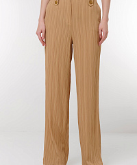 Эти стильные брюки из фактурного материала — идеальное дополнение к вашему гардеробу. Прямой крой создает элегантный силуэт, делая брюки подходящими как для повседневных, так и для более формальных образов.