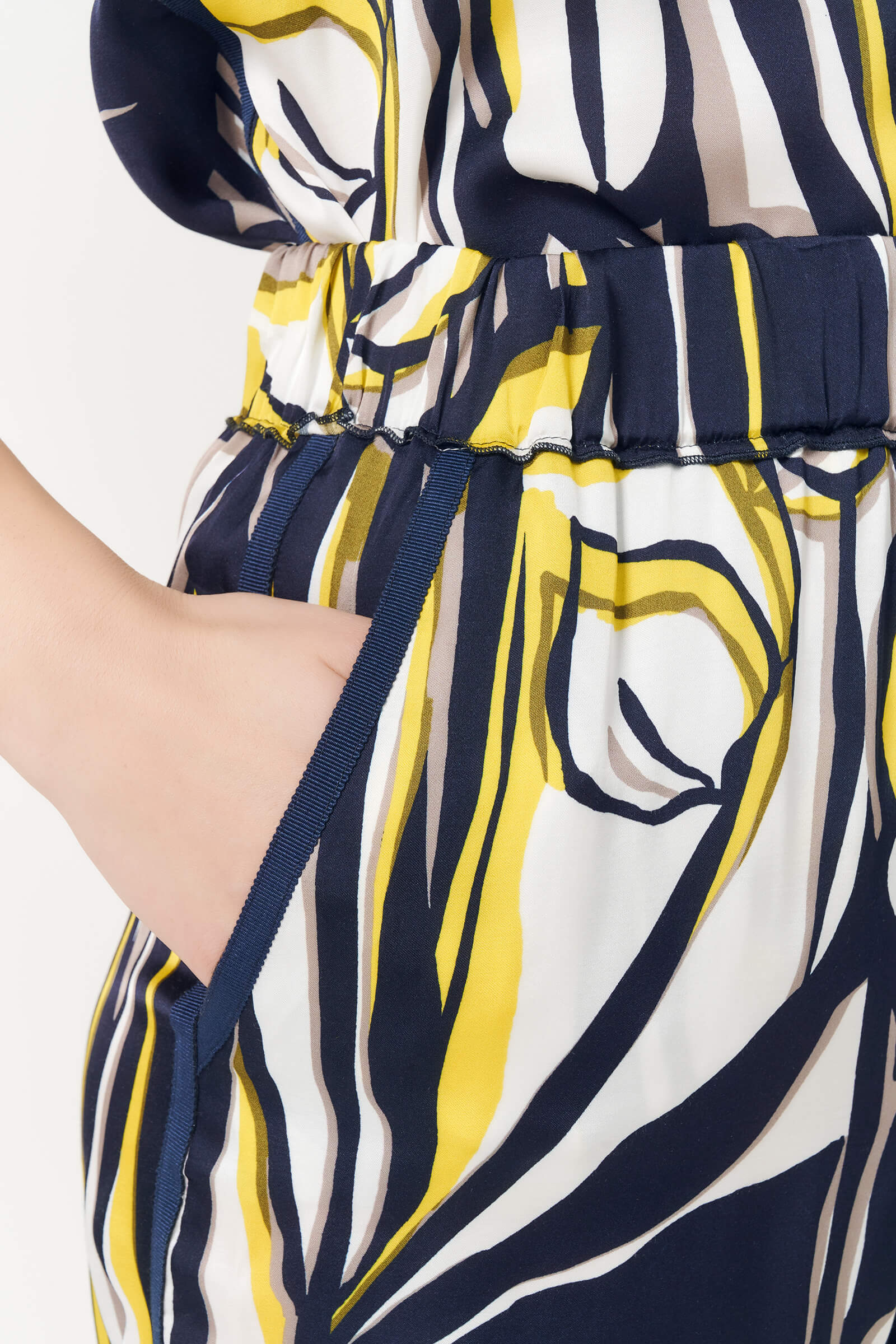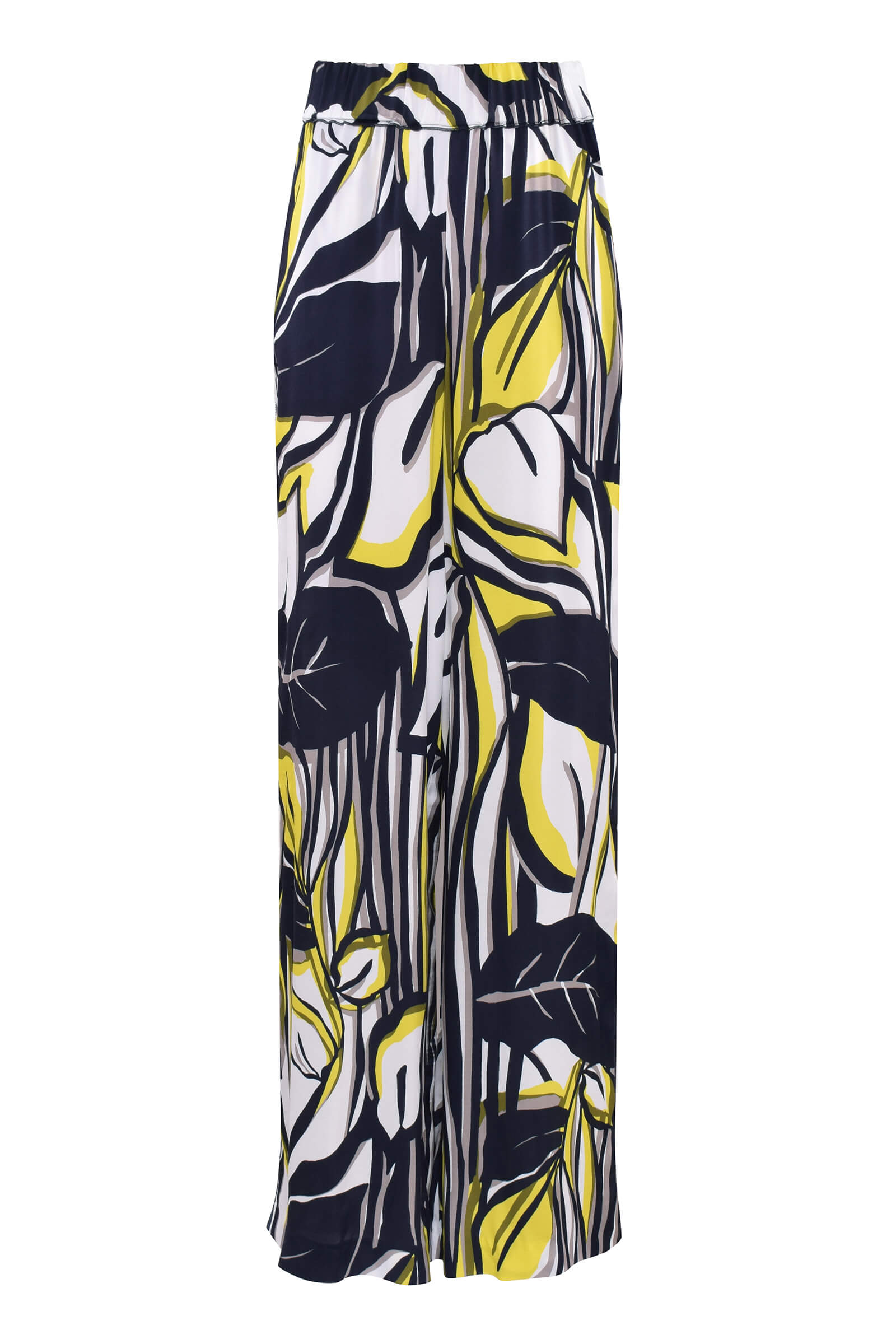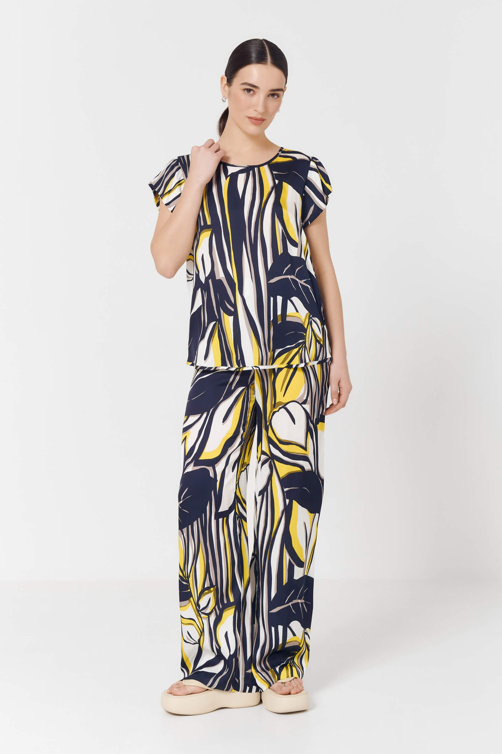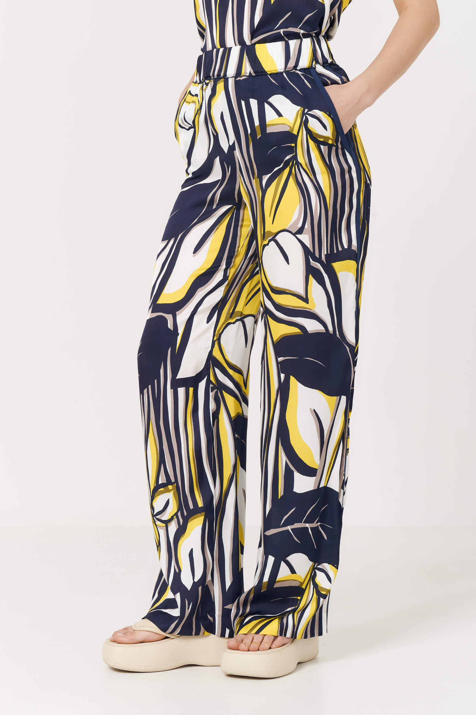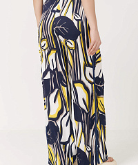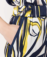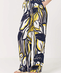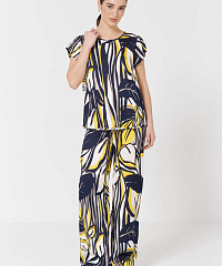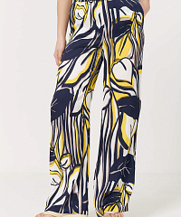 Широкие легкие брюки с абстрактным принтом и лампасами по бокам.