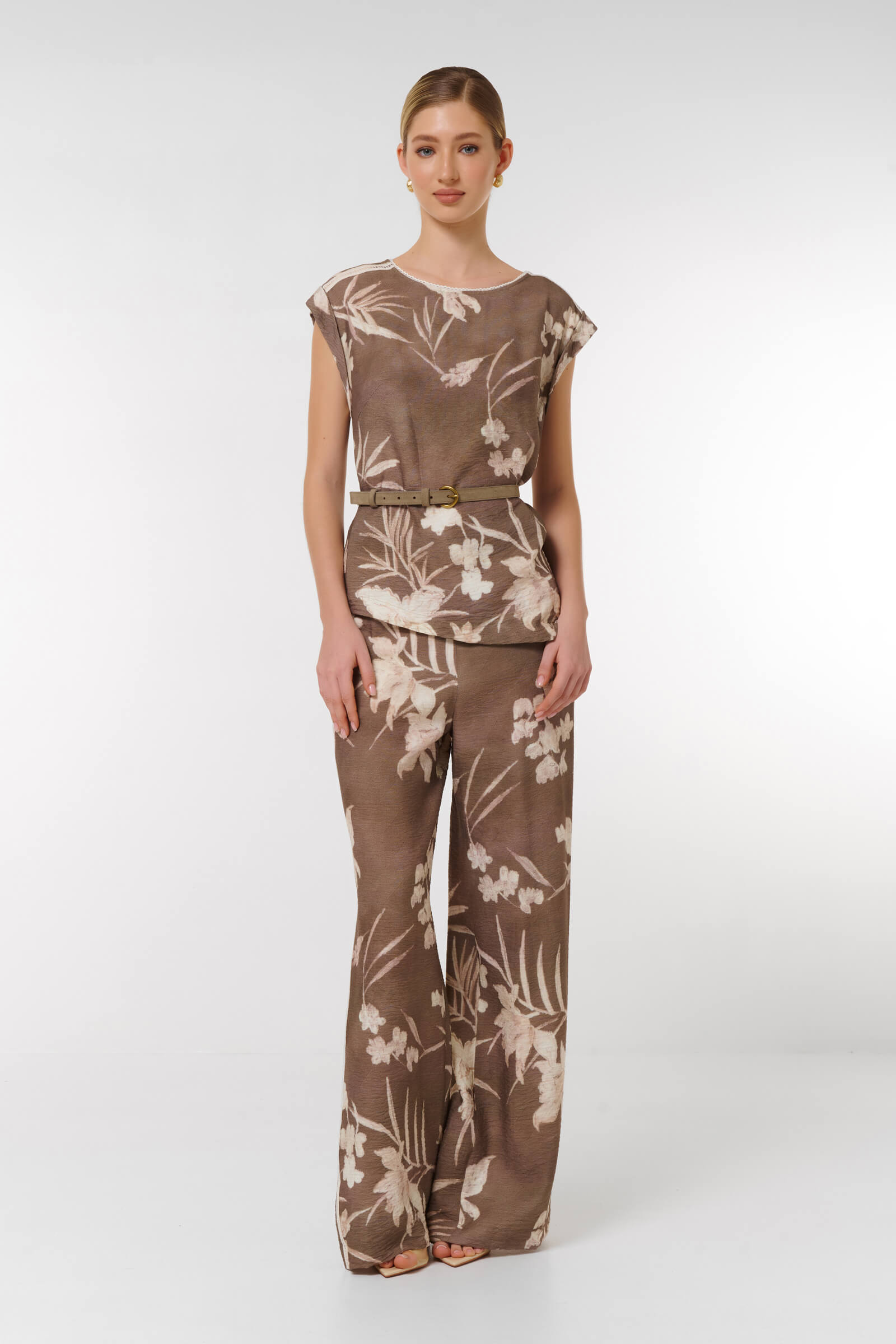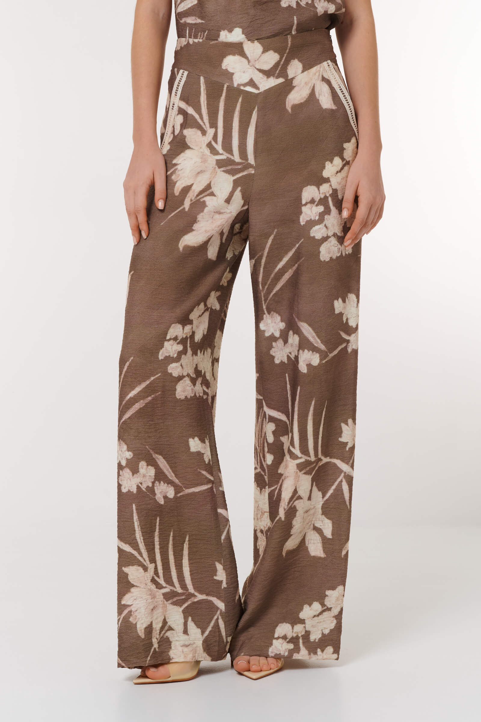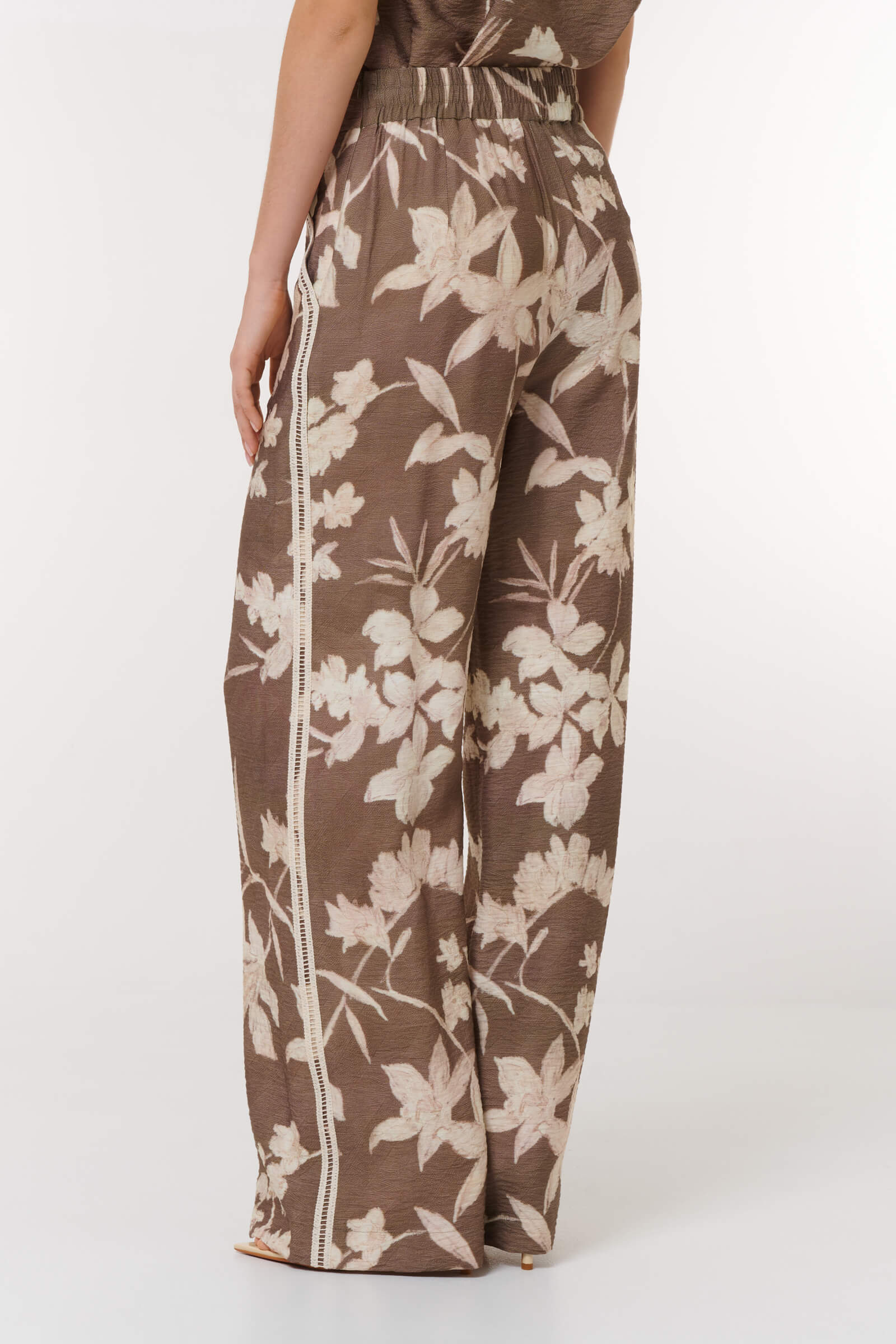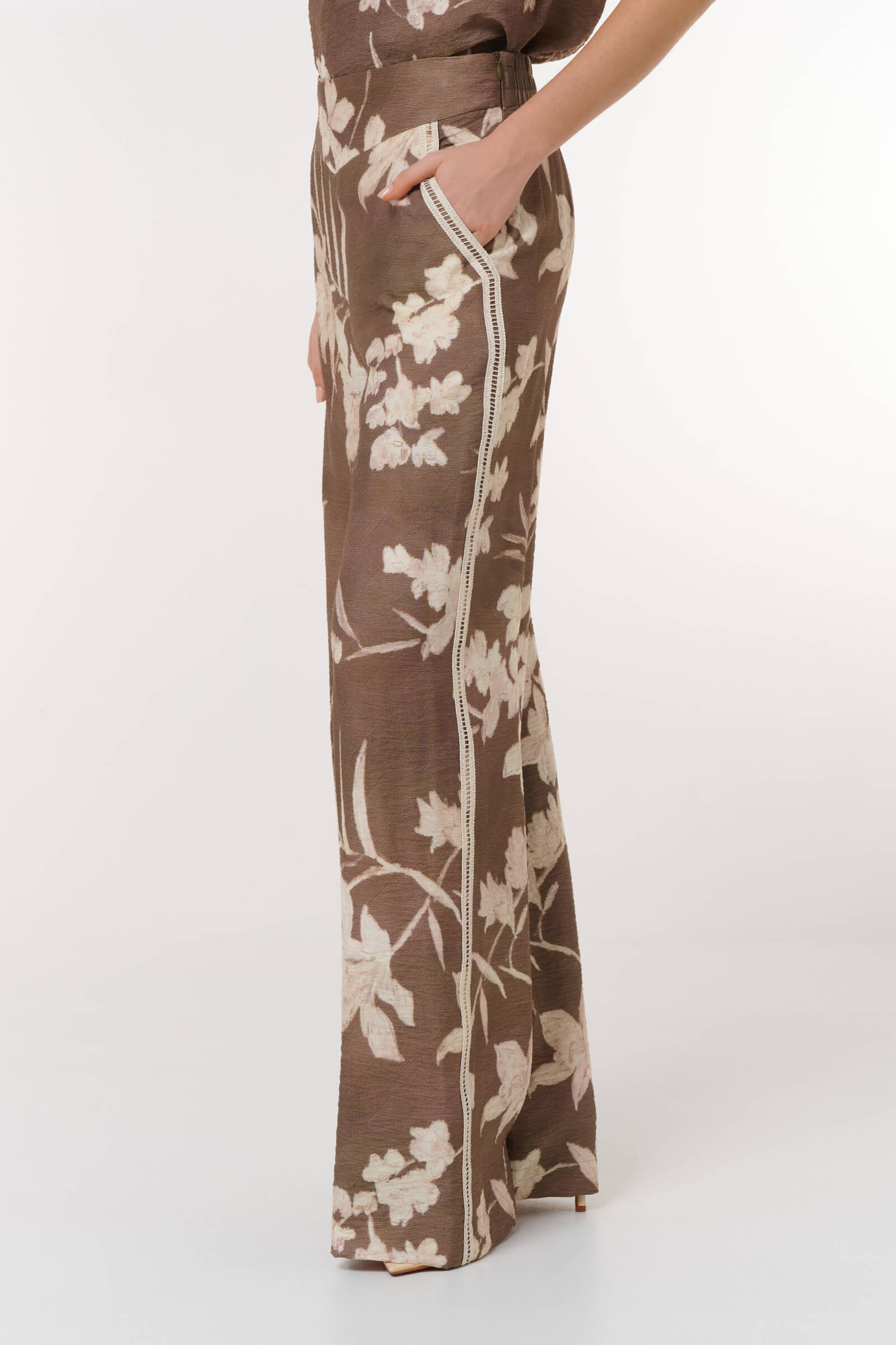 Брюки с цветочным принтом,которые станут яркой деталью вашего гардероба.Широкий крой не только подчеркивает достоинства фигуры,но и обеспечивает комфорт в носке.Нежный цветочный узор на коричневом фоне добавляет образу романтичности и утонченности.