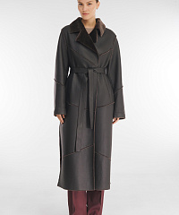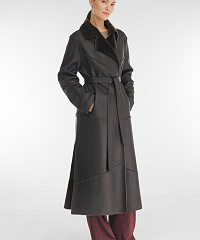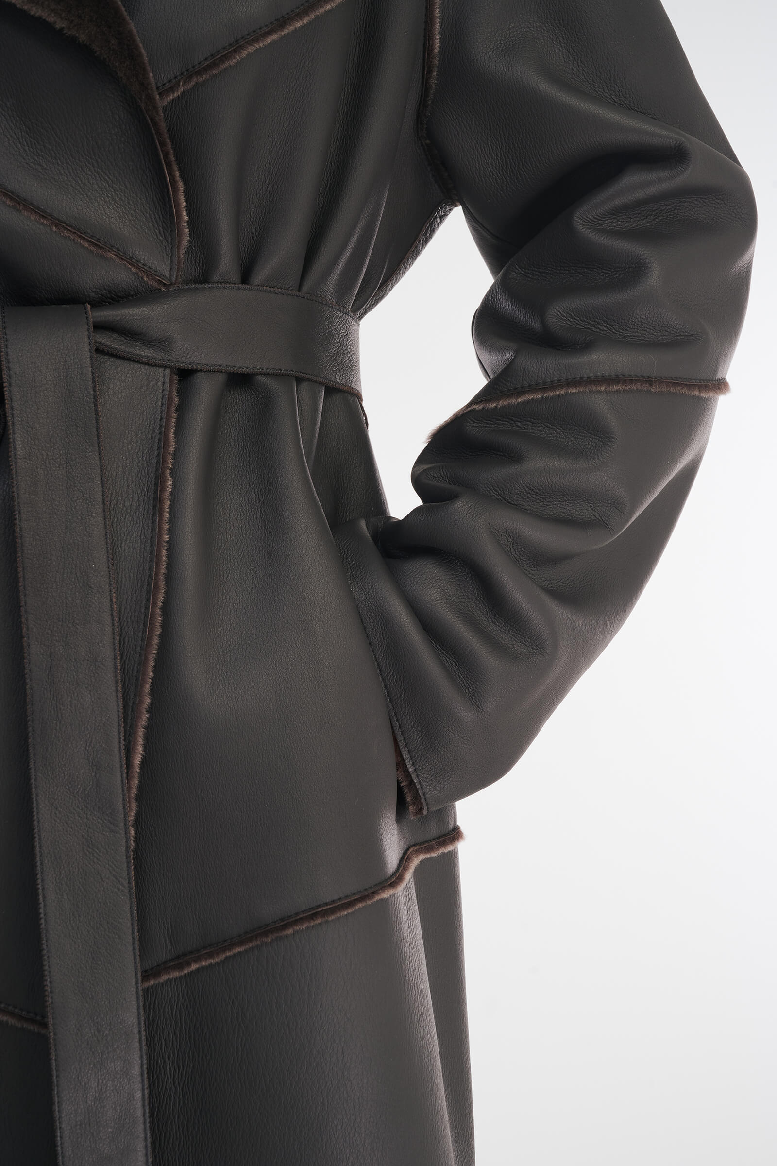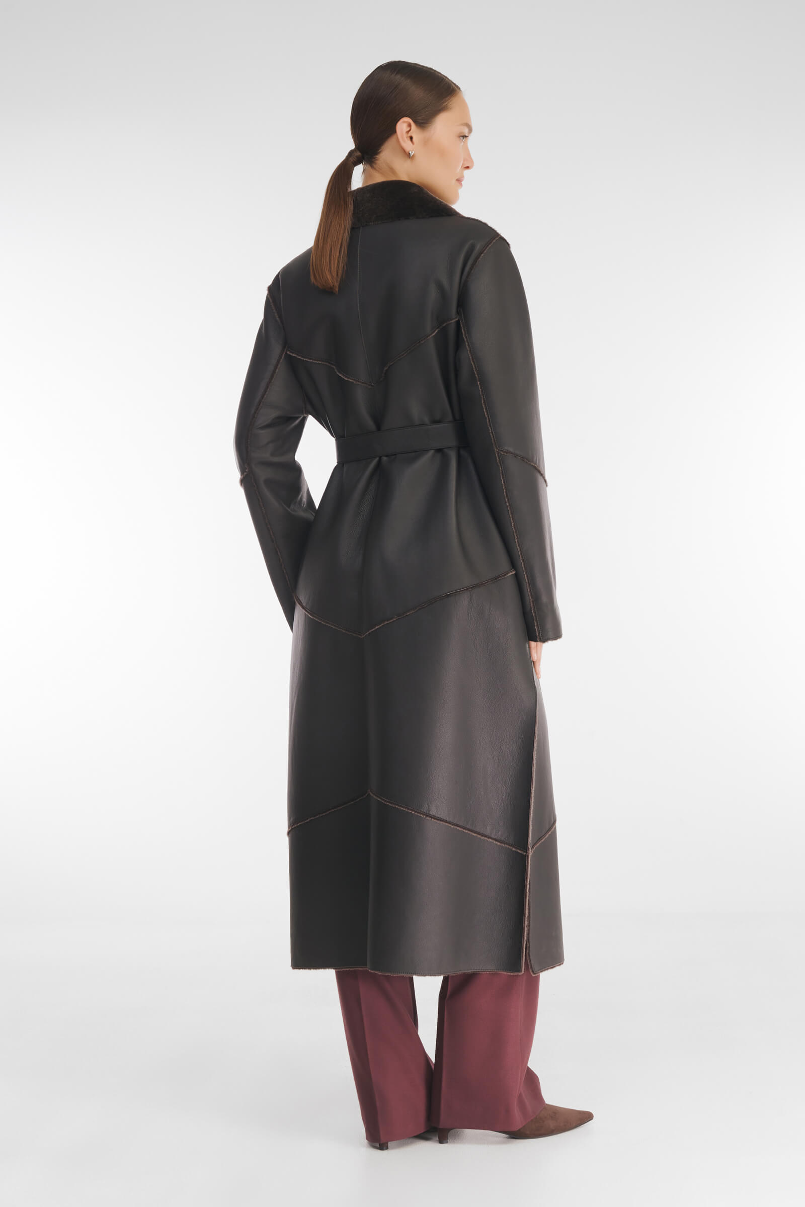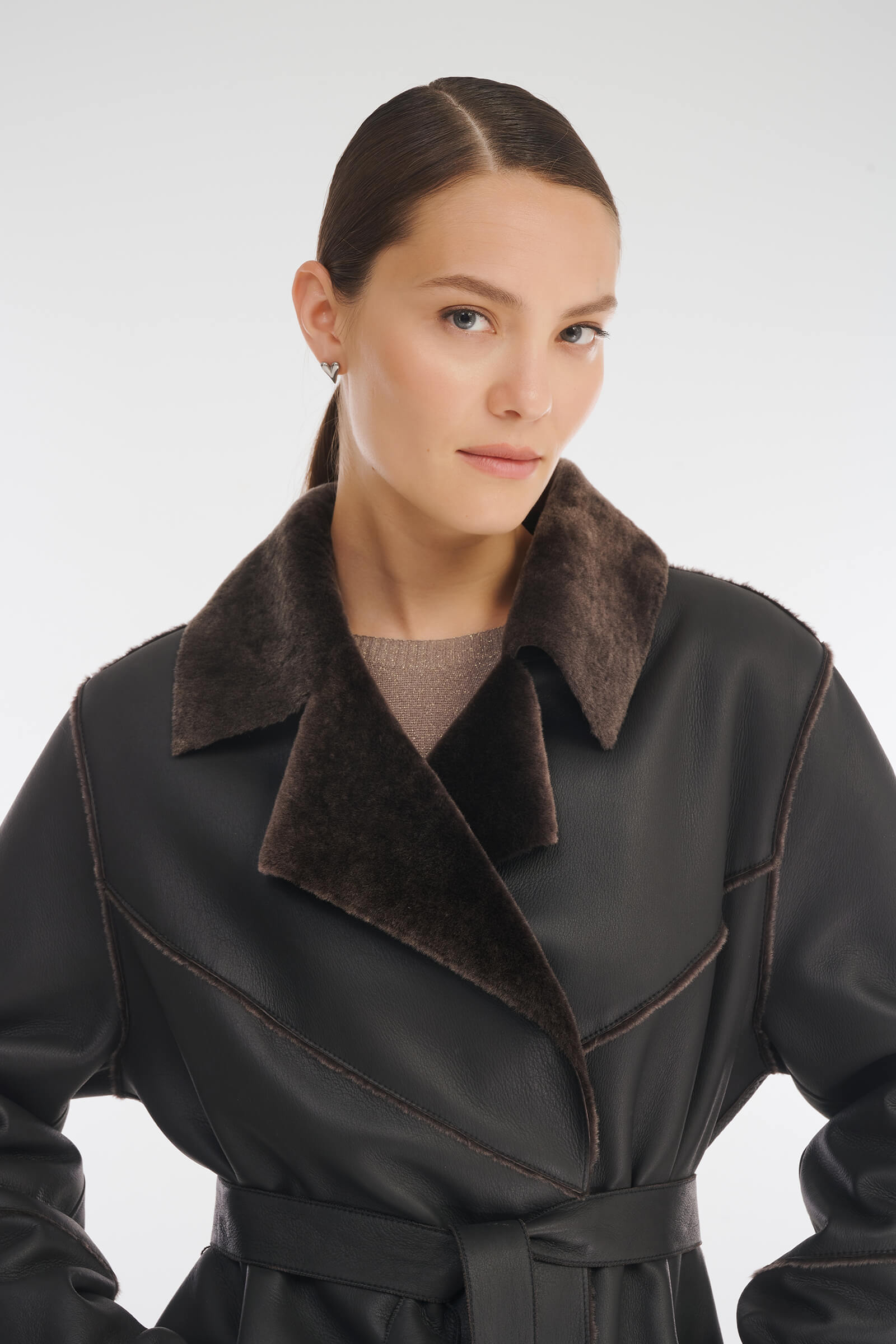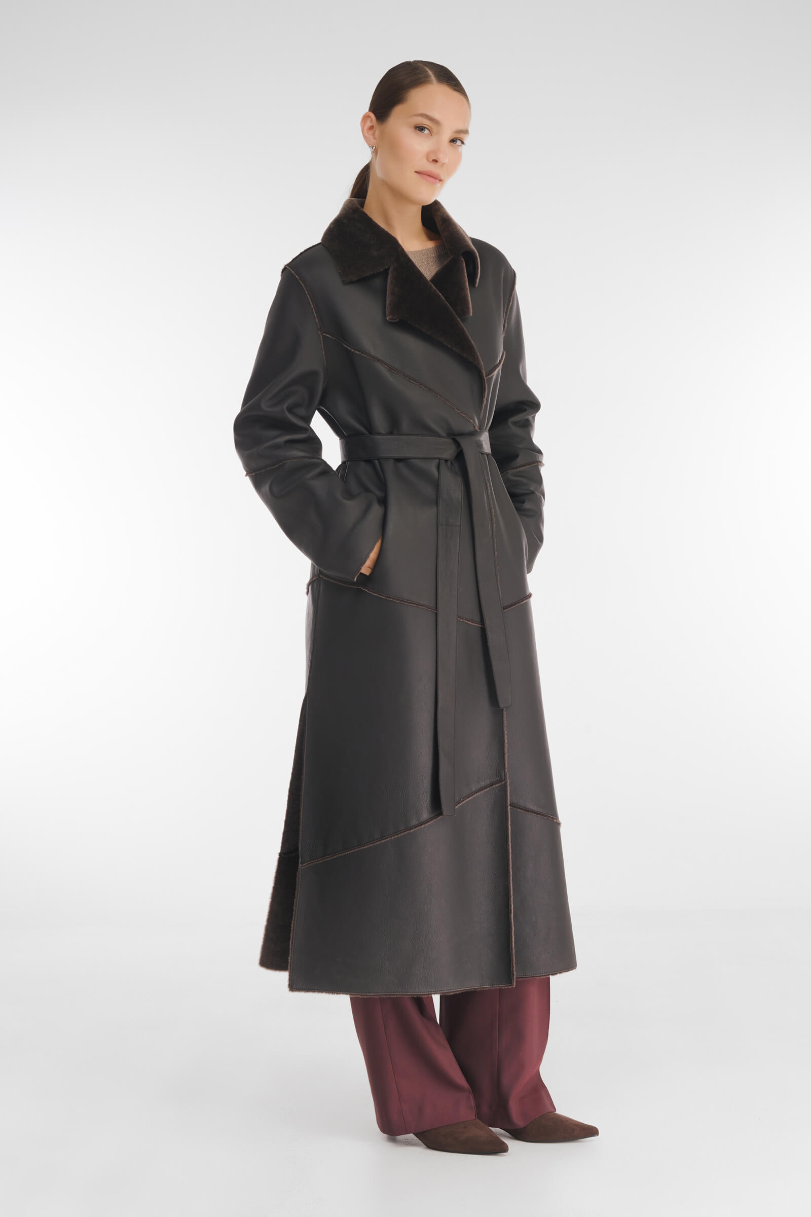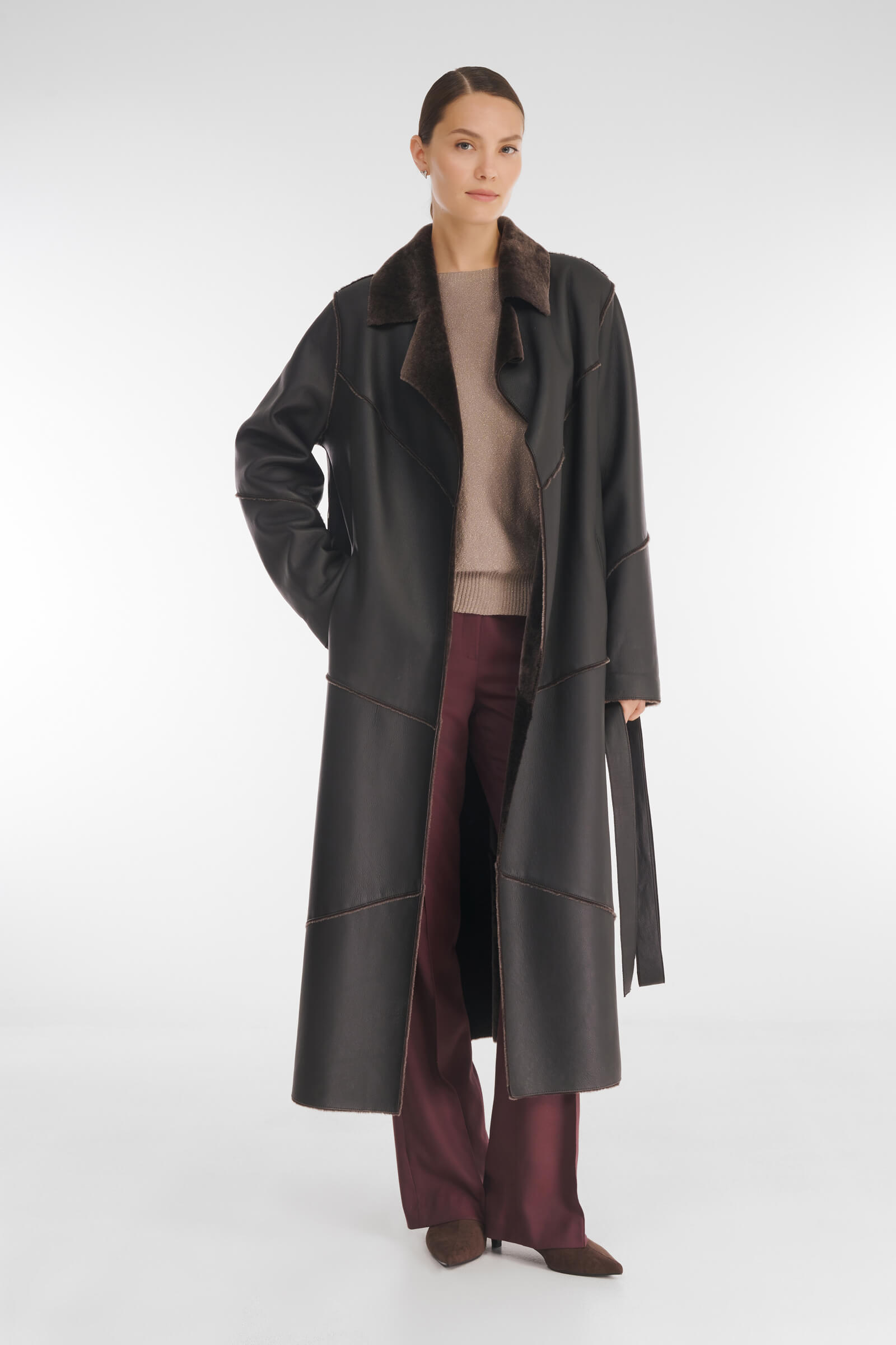 Элегантная дубленка длины мидакси, выполненная из натуральной кожи с роскошным мехом с внутренней стороны. Модель с классическим английским воротником и скрытой застежкой на кнопках, которые подчеркивают строгость дизайна. Удобство обеспечивают прорезные карманы и высокие боковые разрезы, добавляющие легкости движениям.