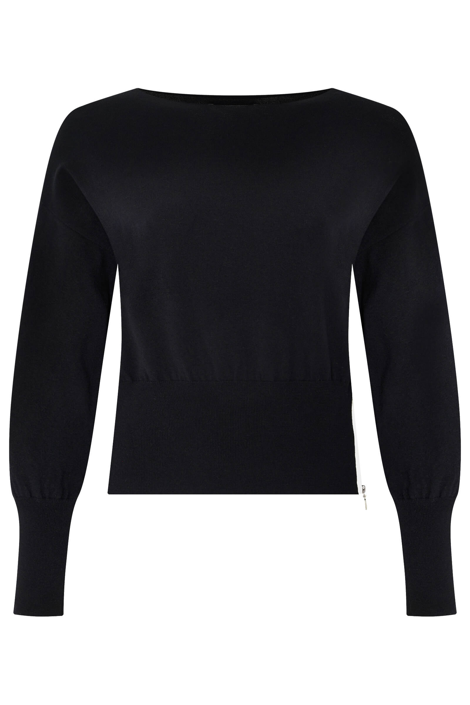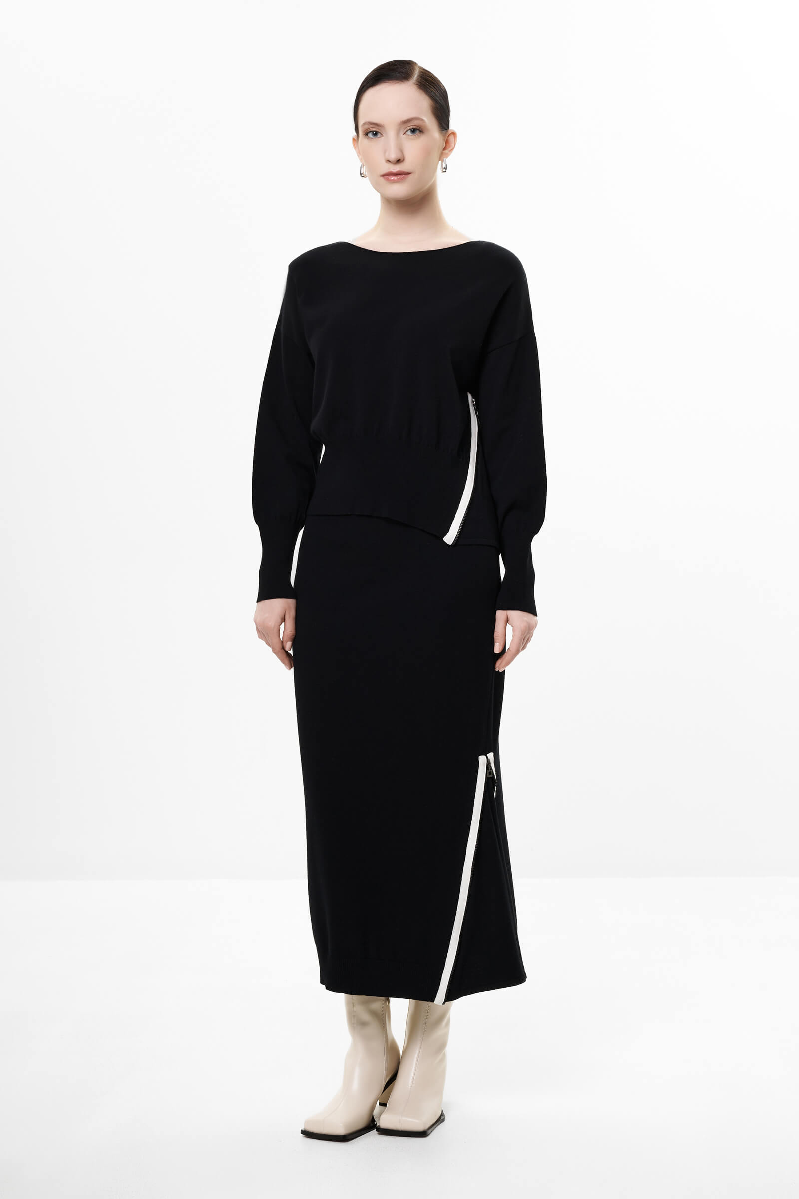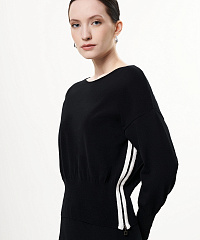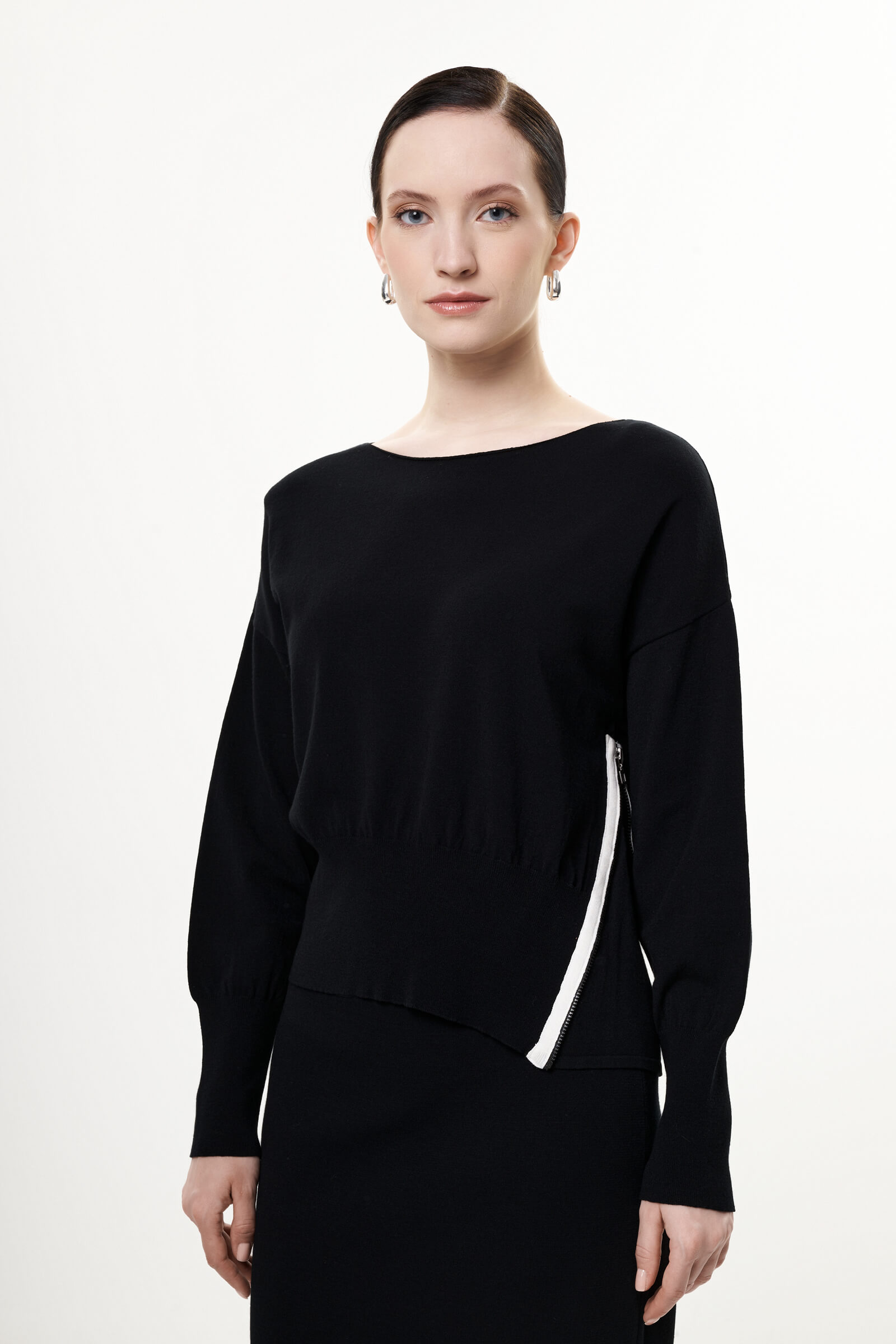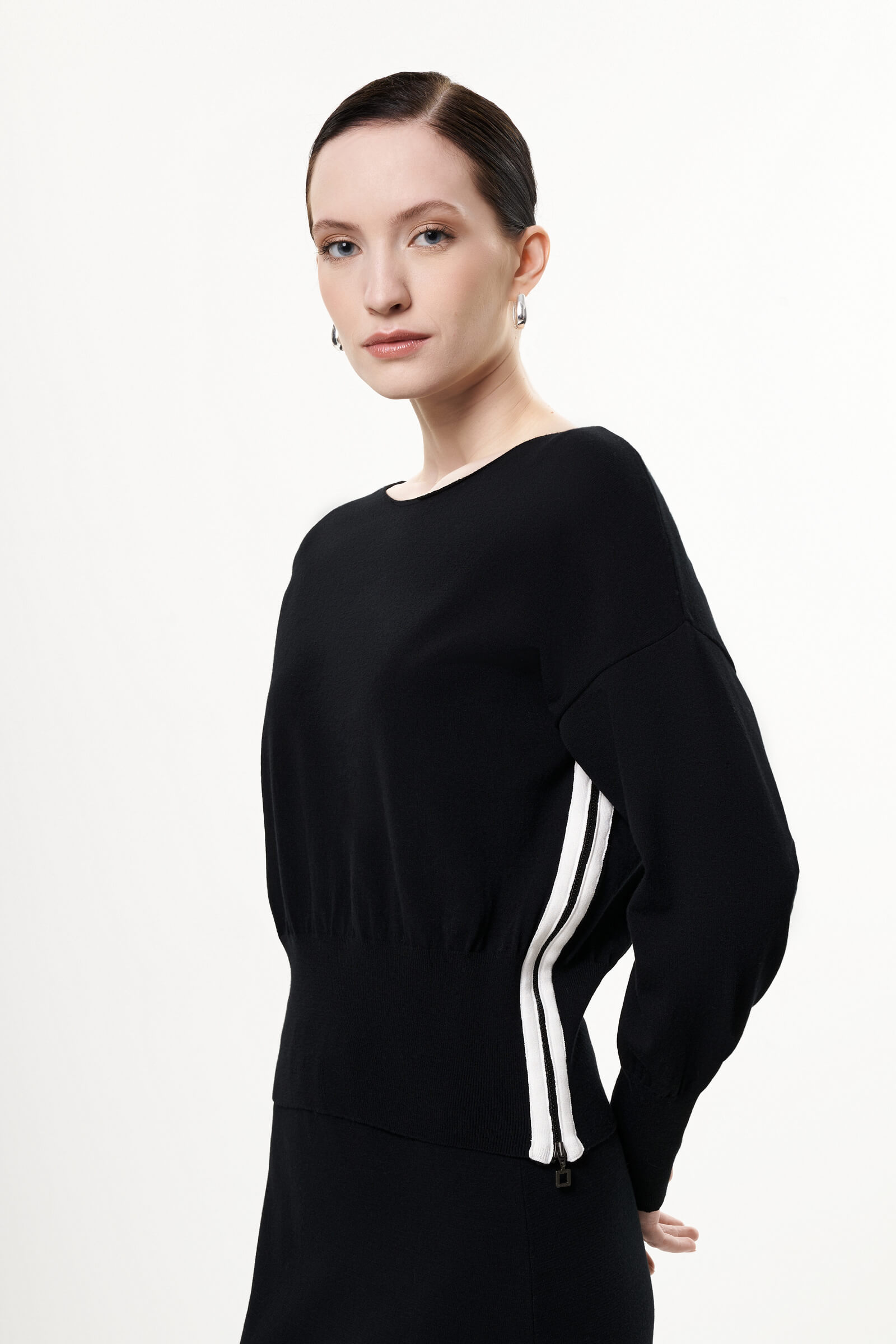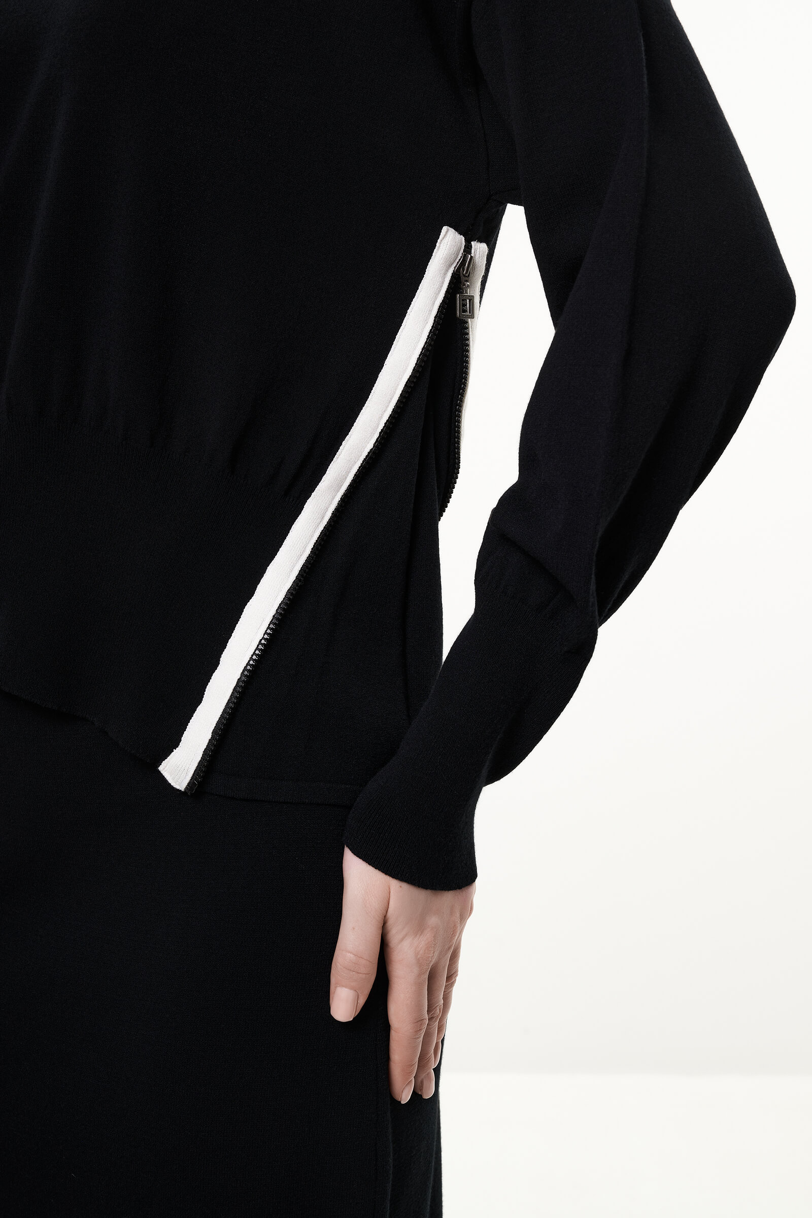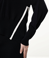 - Джемпер украшен молнией сбоку, дополненной контрастными полосками