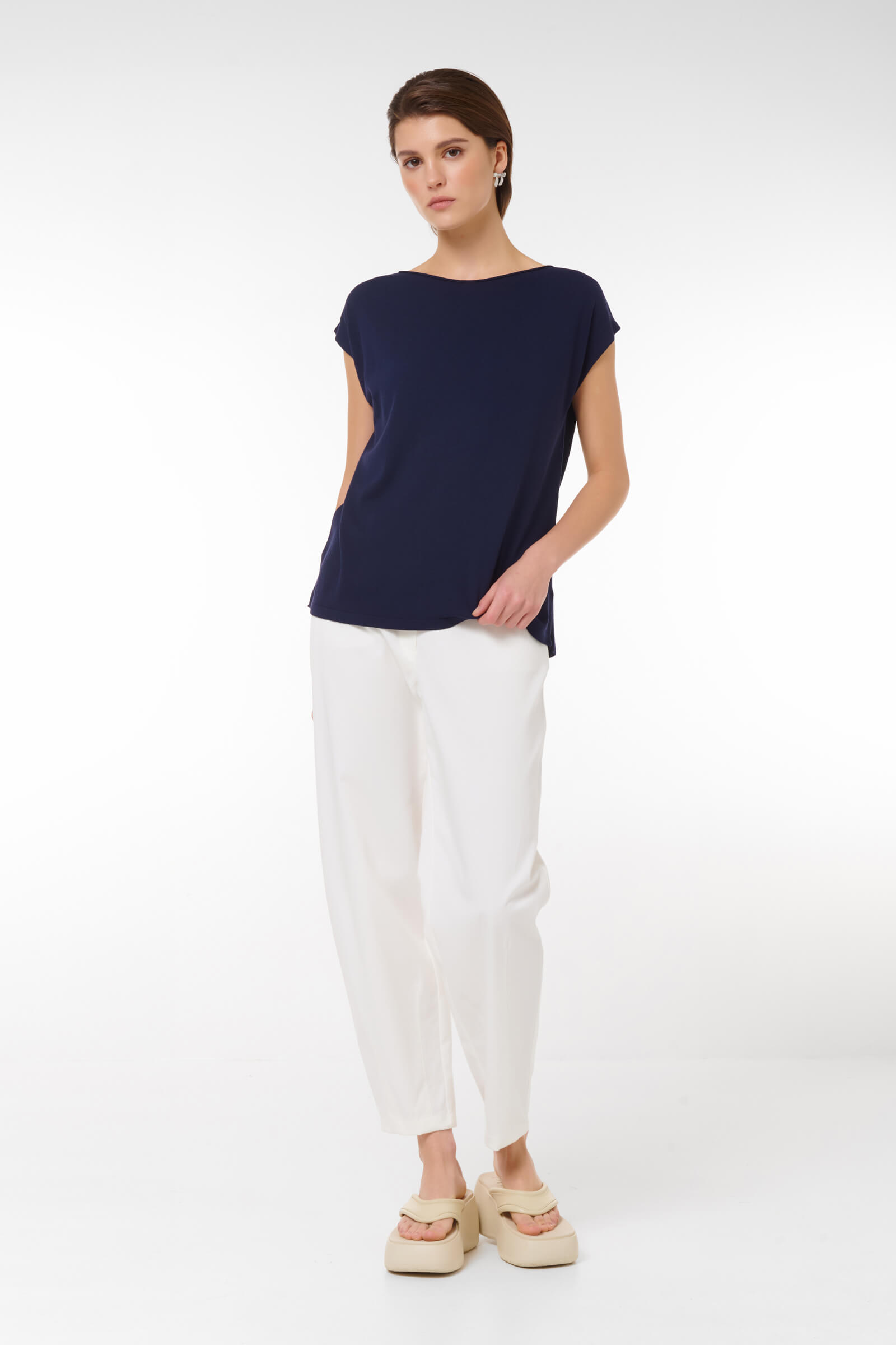 Подарите себе комфорт и стиль с нашим джемпером свободного кроя. Элегантный темно-синий цвет легко сочетается с другими предметами вашего гардероба, а короткие рукава добавляют женственности образу. Создайте уникальный стиль, добавляя аксессуары на ваш вкус.