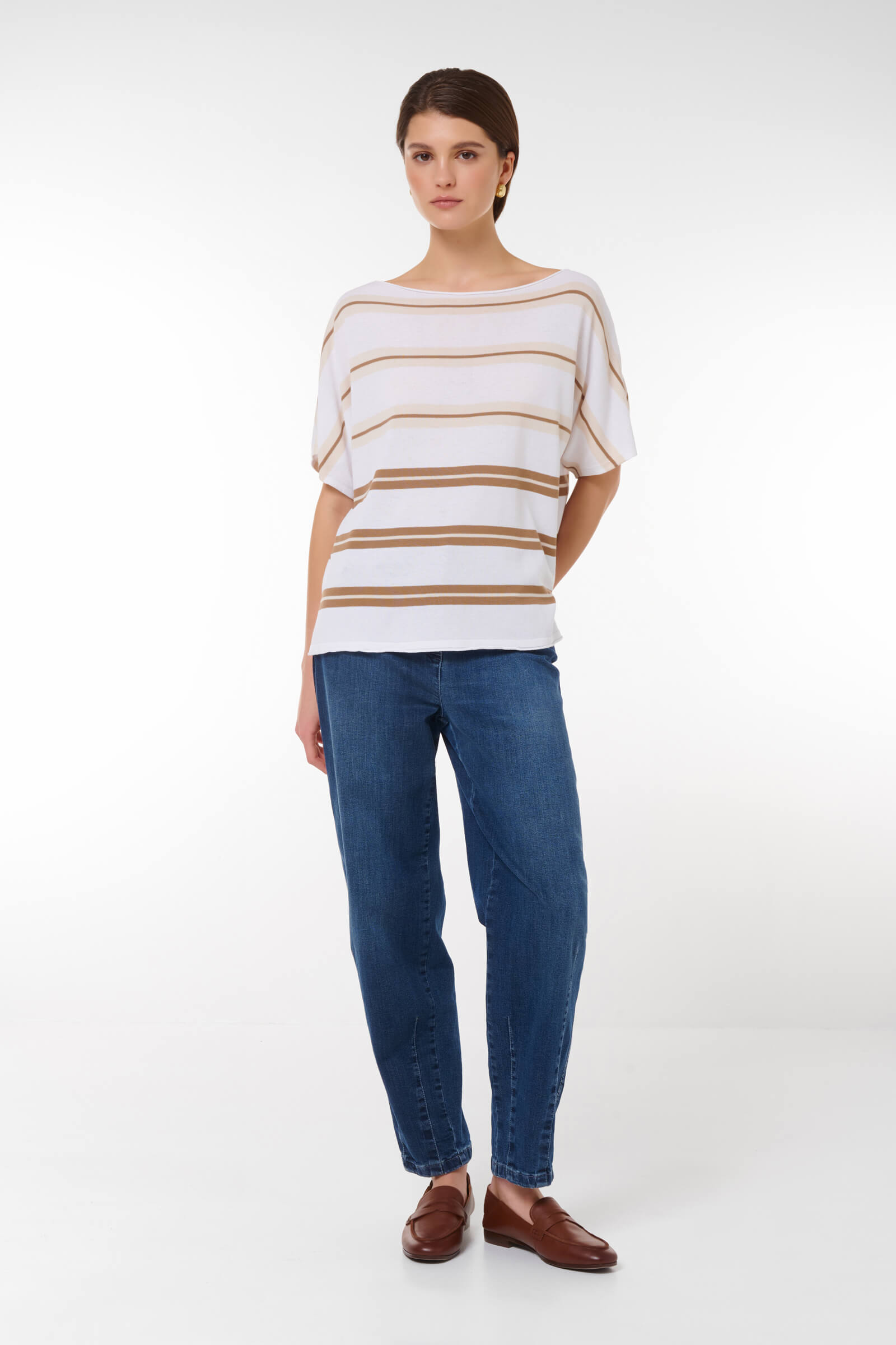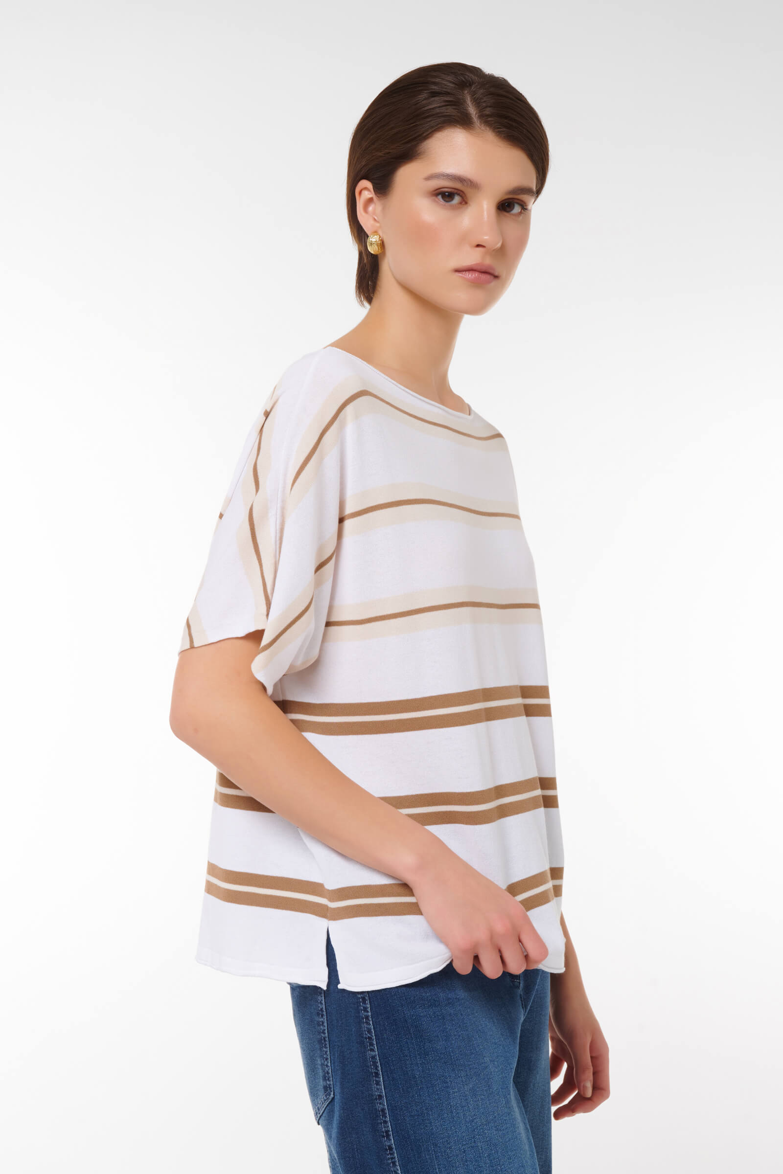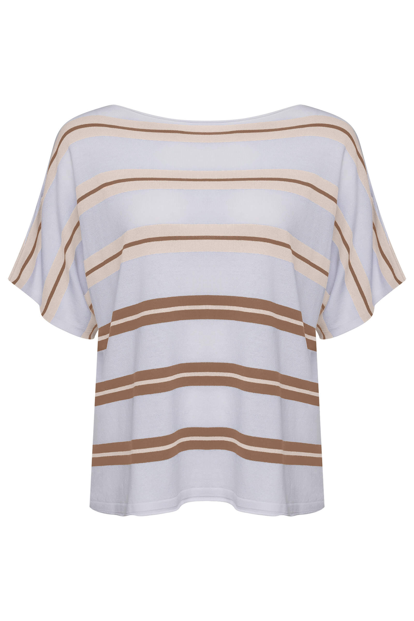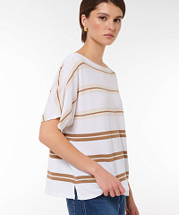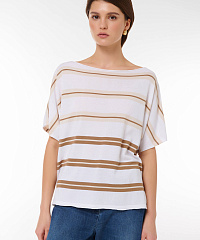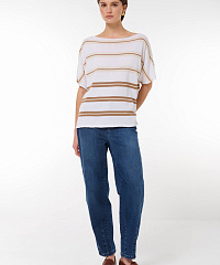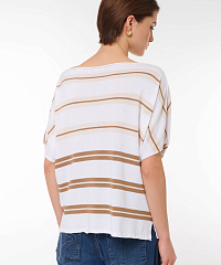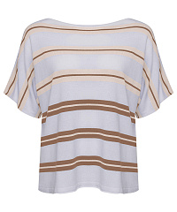 Этот стильный джемпер свободного кроя станет идеальным дополнением вашего гардероба. Нежная цветовая палитра с горизонтальными полосами придаст вашему образу элегантности и свежести. Короткие рукава и расслабленный крой позволяют удобно носить его как с джинсами, так и с юбками, создавая непринужденный и модный look.