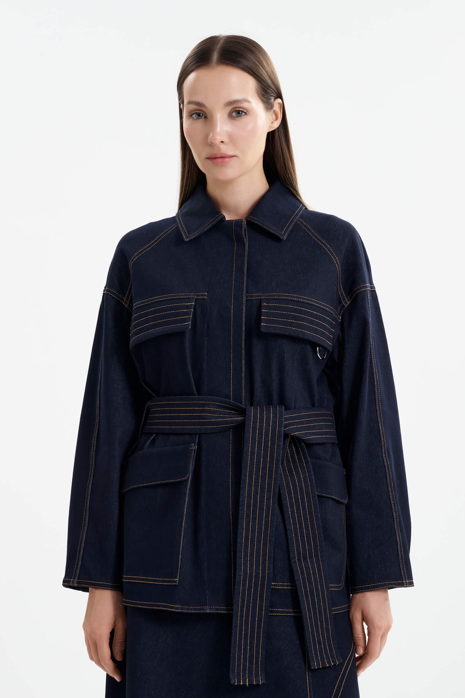 - Плотный хлопковый деним с контрастной строчкой