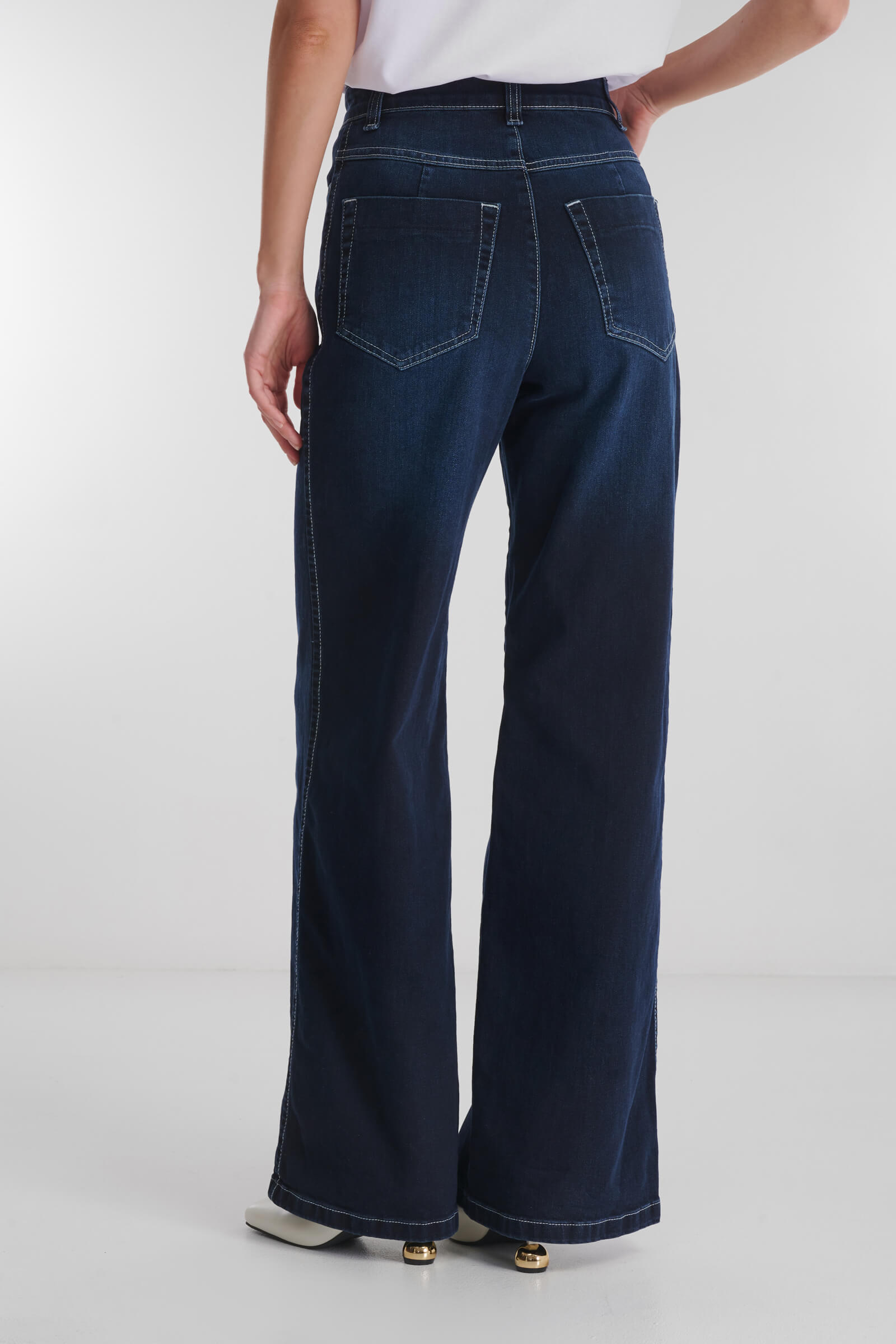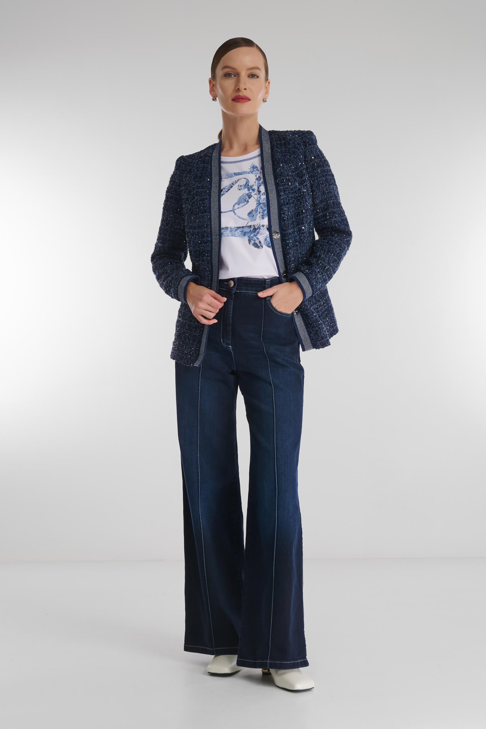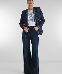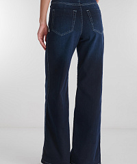 Расклешенные джинсы из плотного эластичного денима — это сочетание уверенности и легкости, которое мгновенно преображает силуэт. Стрелки, застроченные спереди, и высокая посадка визуально вытягивают силуэт и подчеркивают талию. Контрастная строчка придает образу выразительности и акцентирует внимание на лаконичности дизайна.