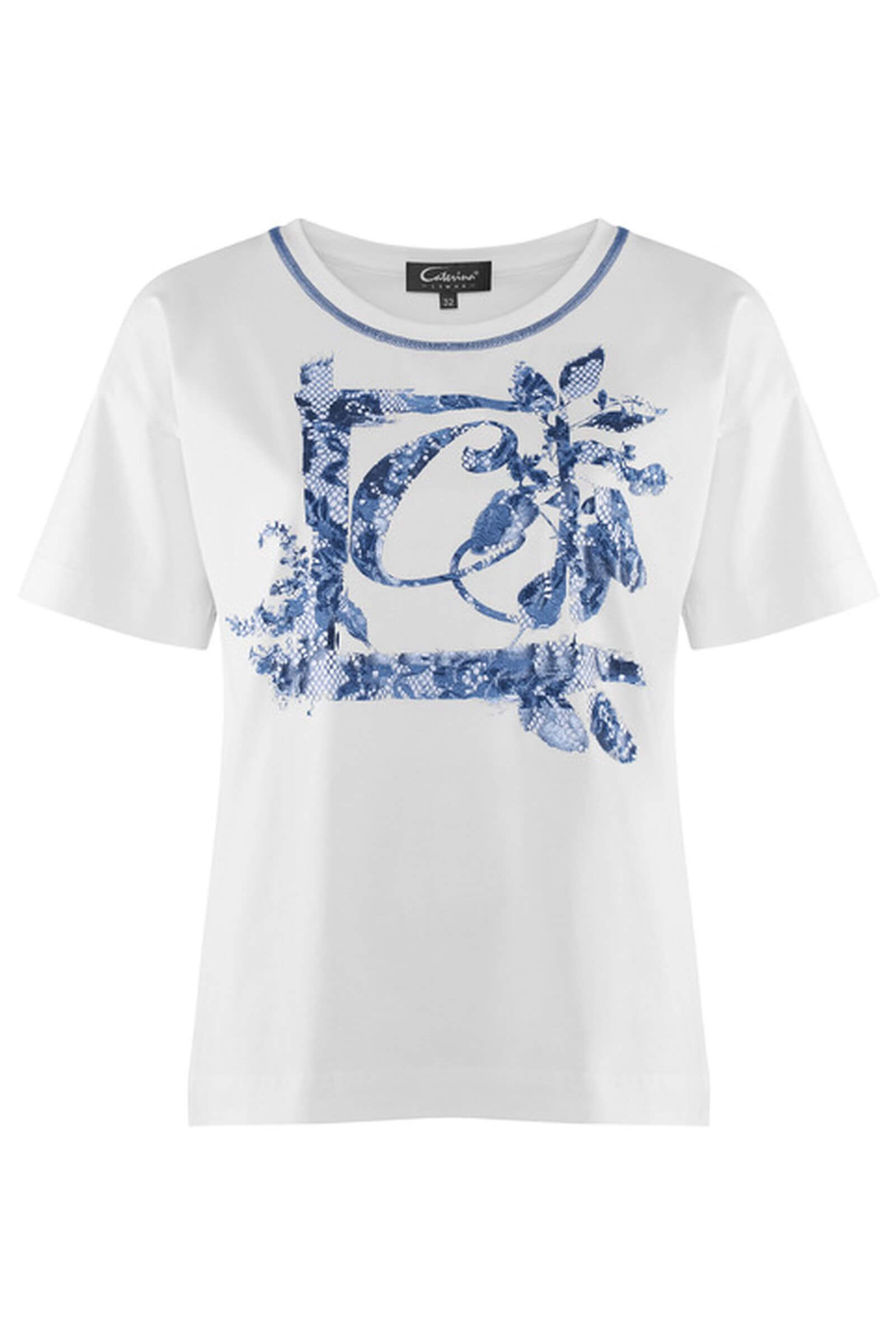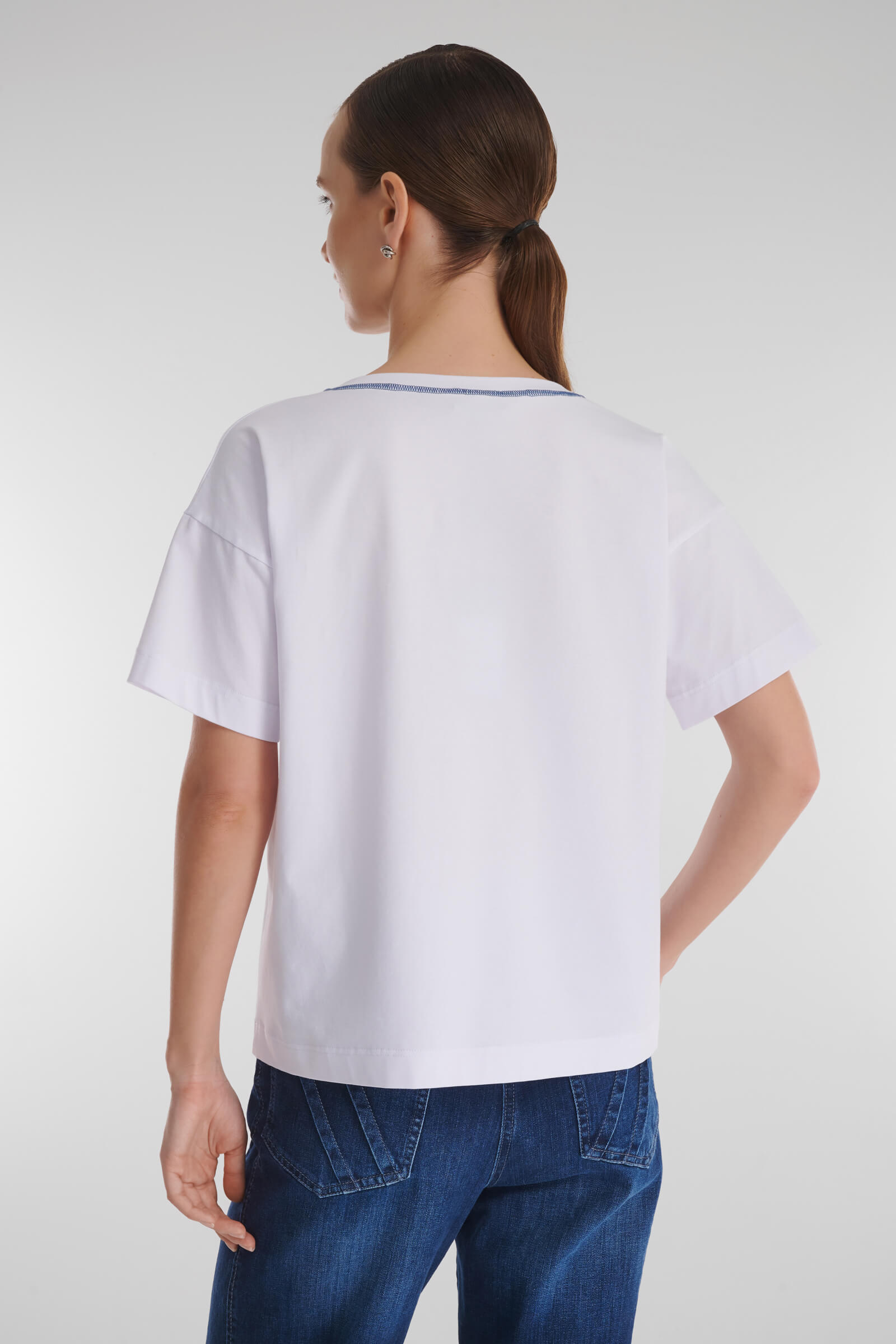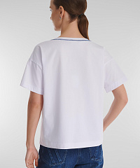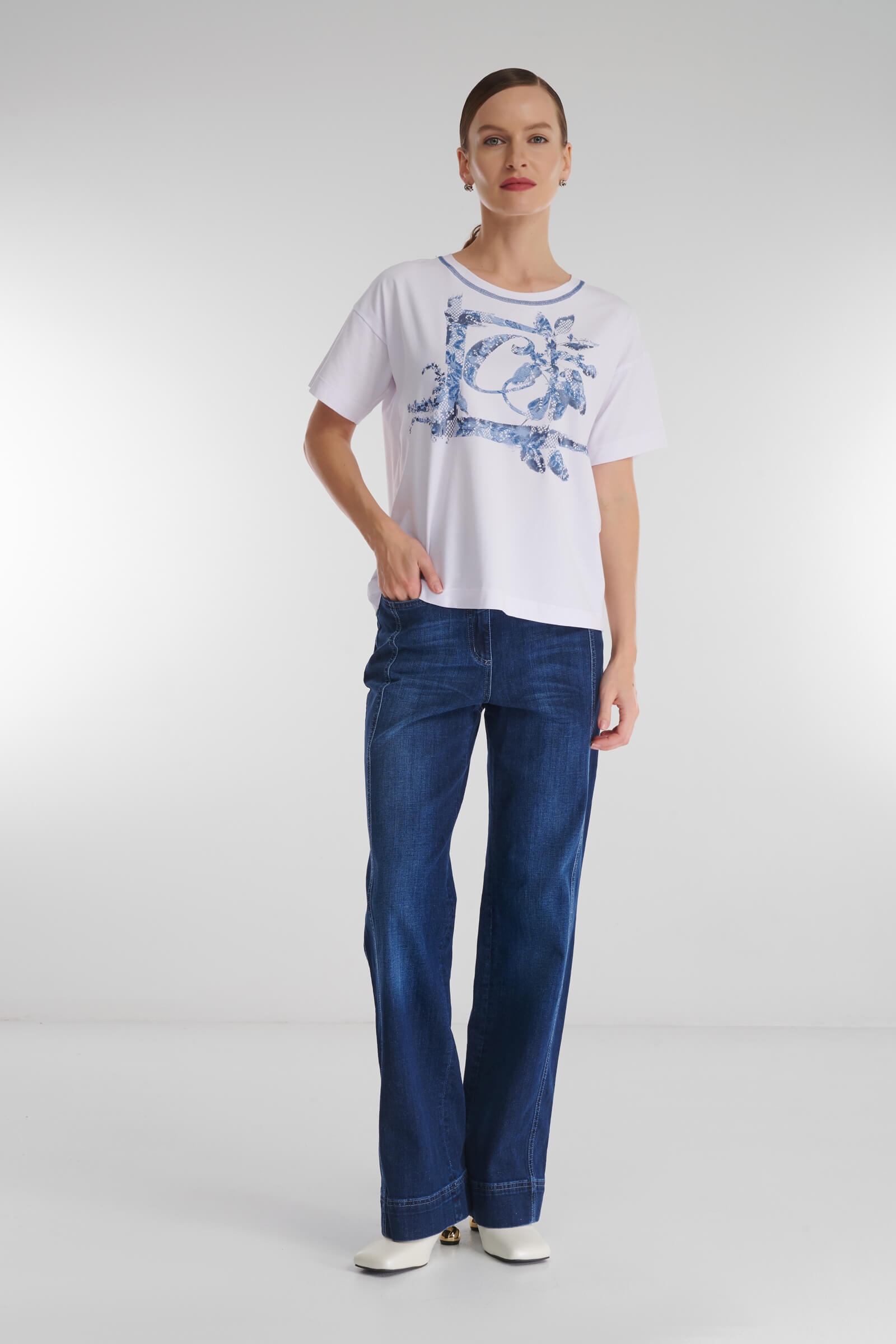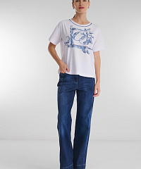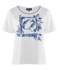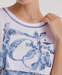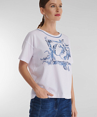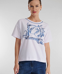Футболка из смесового хлопка. Спущенная линия плеча подчеркивает мягкость силуэта. Акцентные детали — эксклюзивный принт с цветочным дизайном и контрастная декоративная строчка, украшающая вырез.