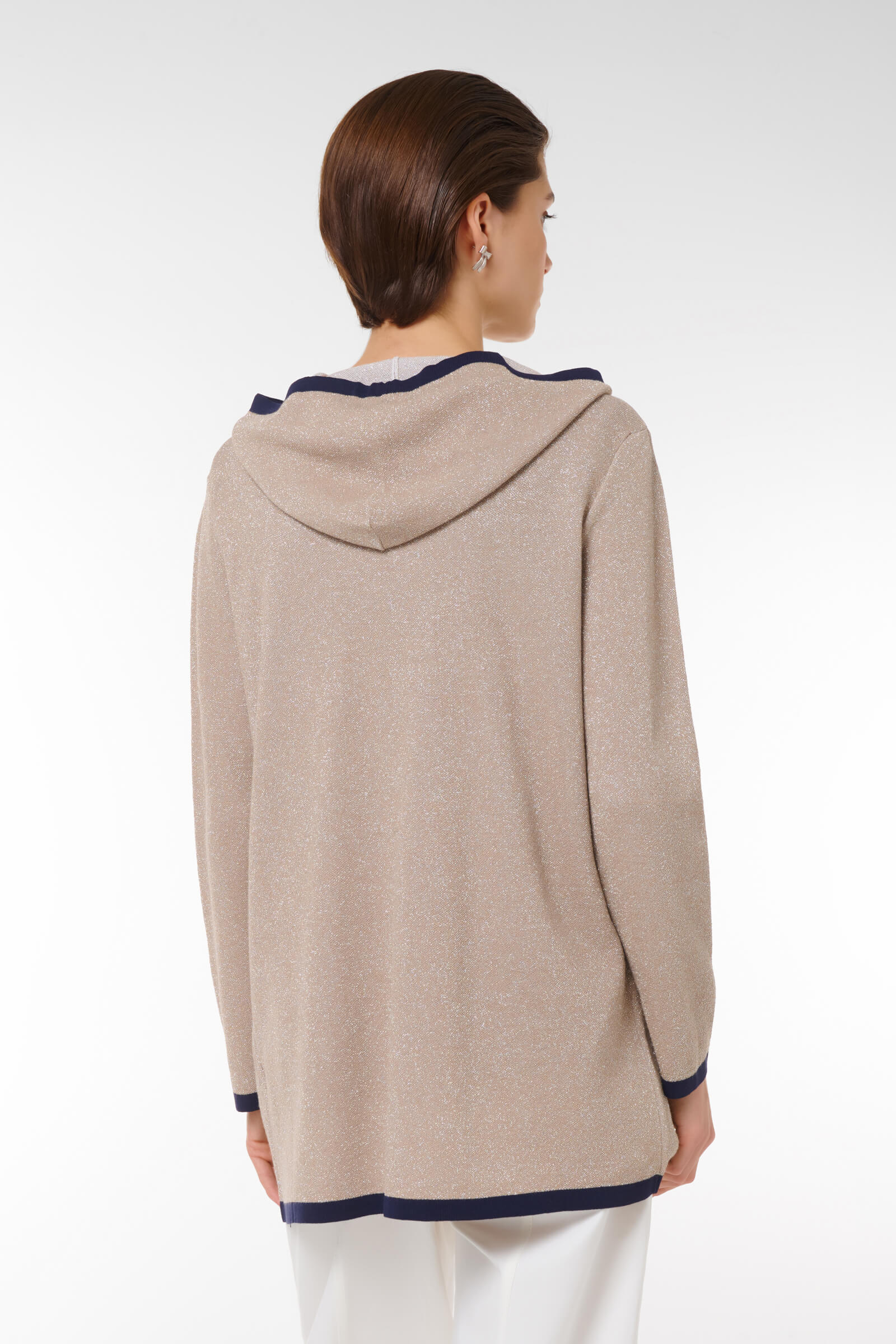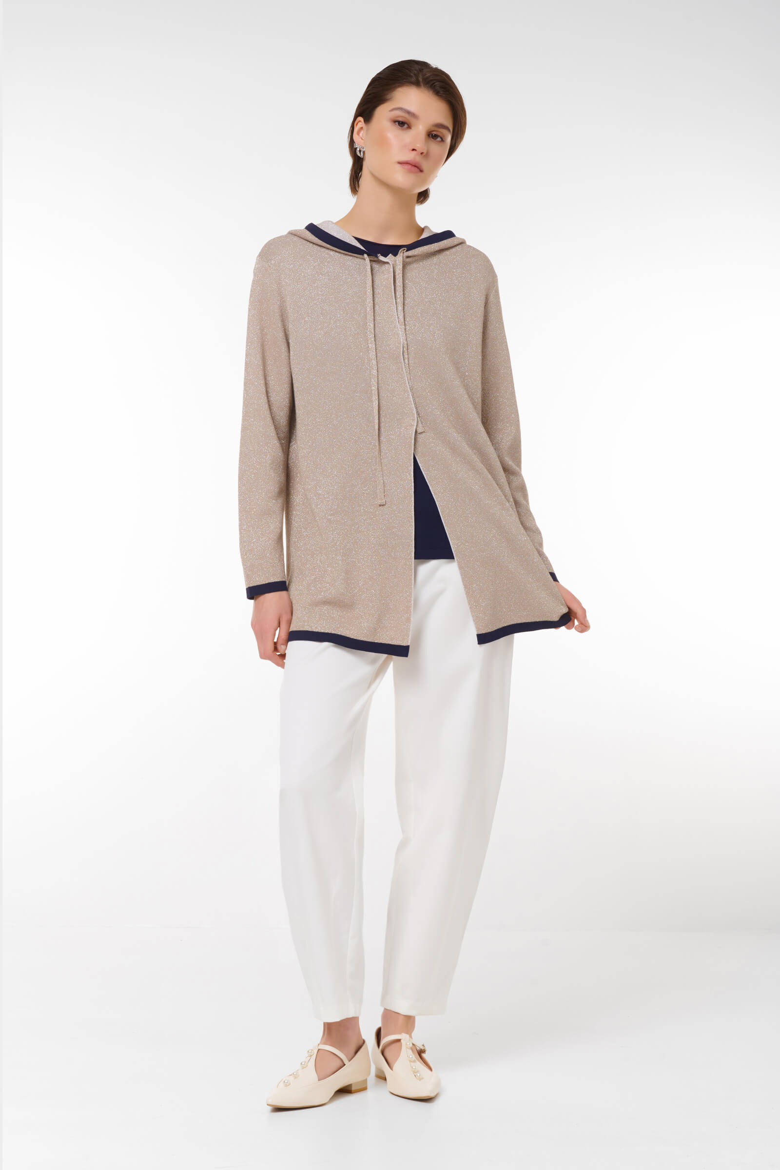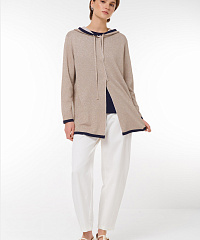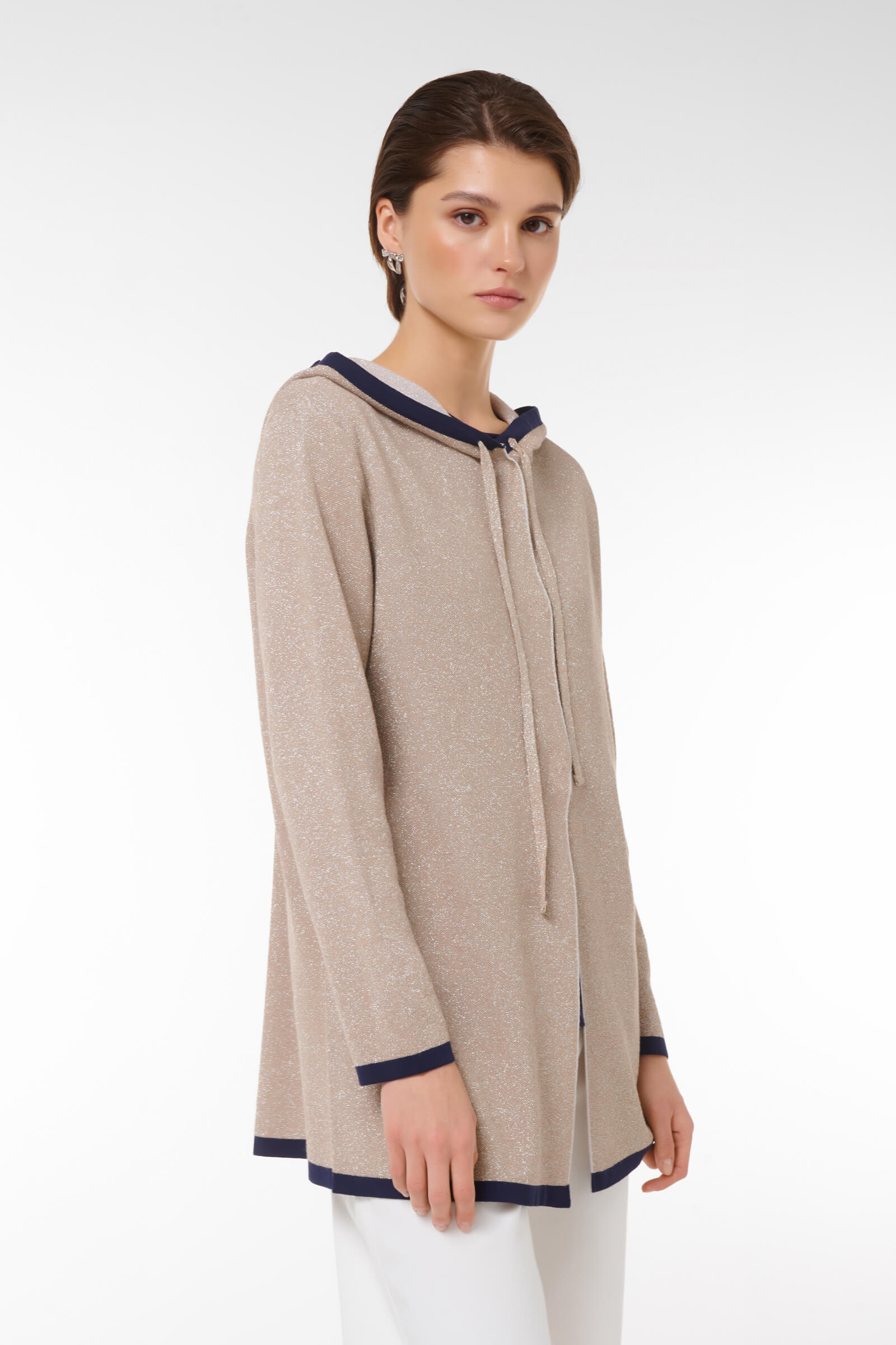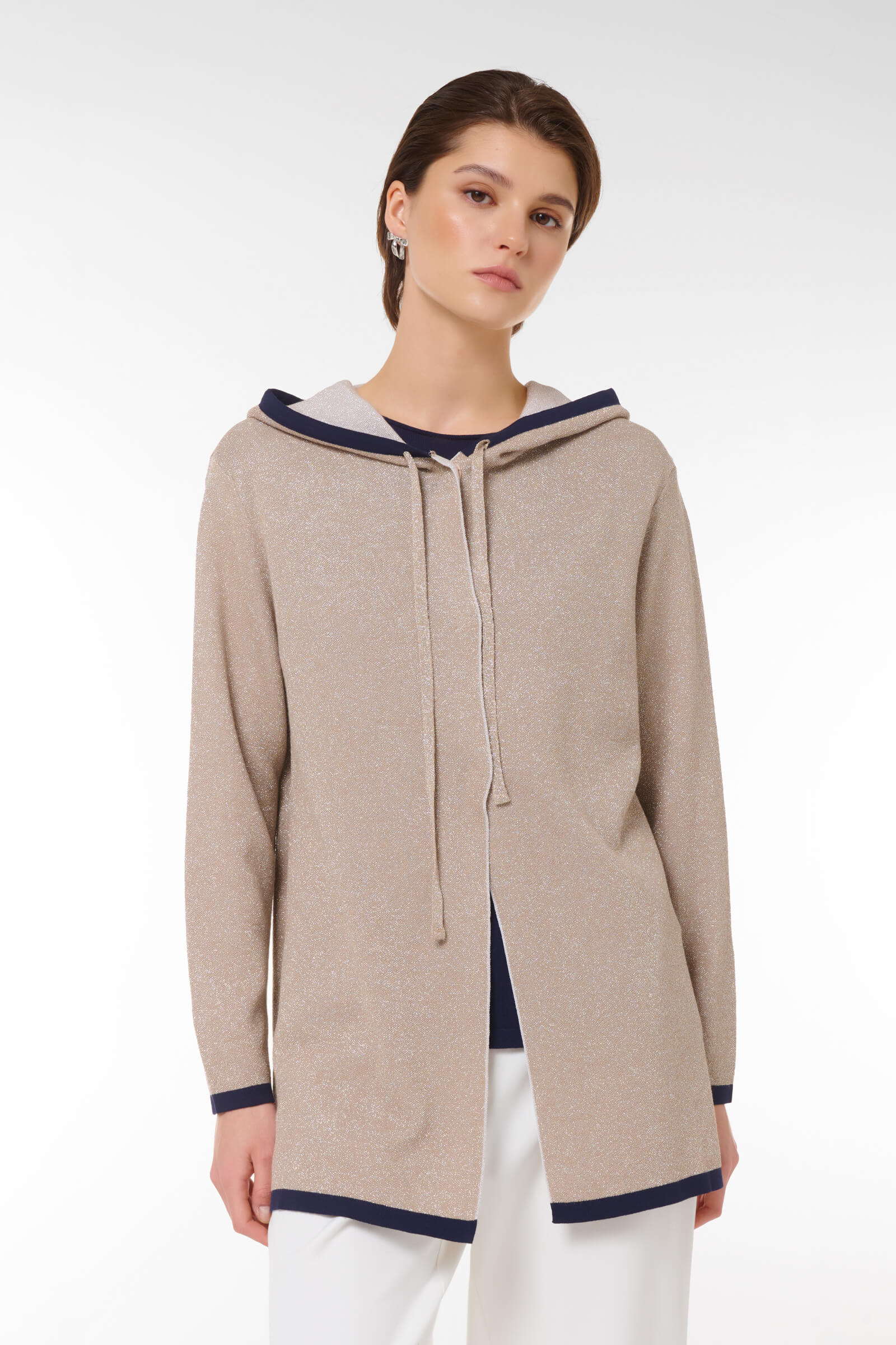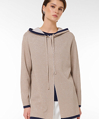 Откройте для себя новый стандарт уюта с нашим кардиганом на молнии, украшенным люрексом. Этот стильный бежевый кардиган не только отлично согревает, но и придаёт образу элегантность благодаря контрастным манжетам и капюшону. Удобная молния позволяет быстро надеть и снять изделие, а drawstring-утяжка на капюшоне идеально регулирует посадку. С длиной, которая подходит как для городских прогулок, так и для уютных вечеров дома, этот кардиган станет идеальным дополнением к вашему гардеробу.