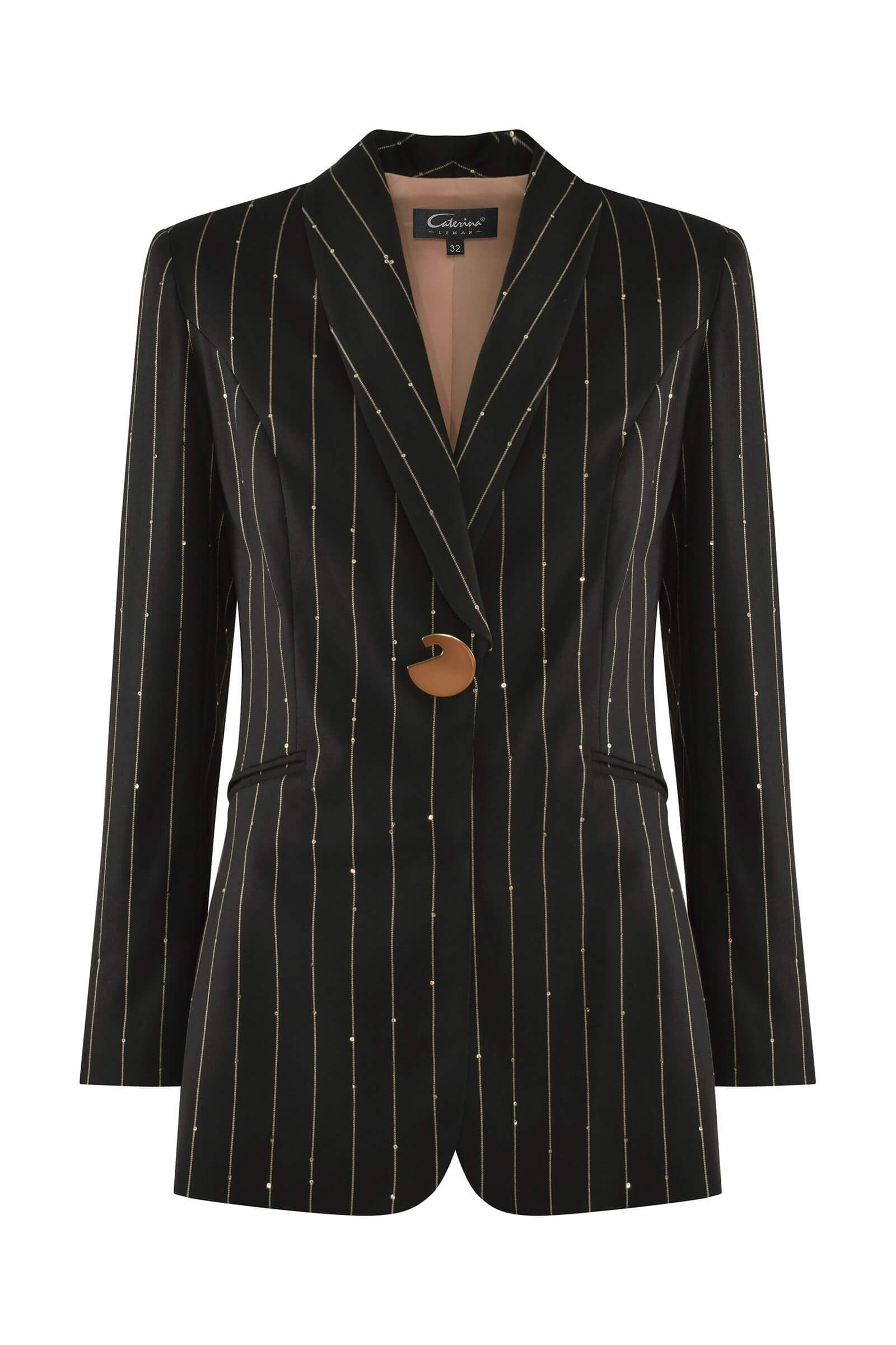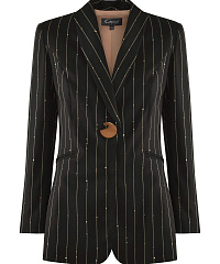 Пиджак классического кроя заиграл по-новому благодаря эффектному сочетанию классического принта и россыпи мелких пайеток. Вертикальная полоска, выбранная дизайнерами бренда, визуально вытягивает силуэт. Шалевый воротник добавляет баланс, делая черты изделия менее графичными. Комбинируйте пиджак с брюками из той же линейки для создания ослепительного образа.