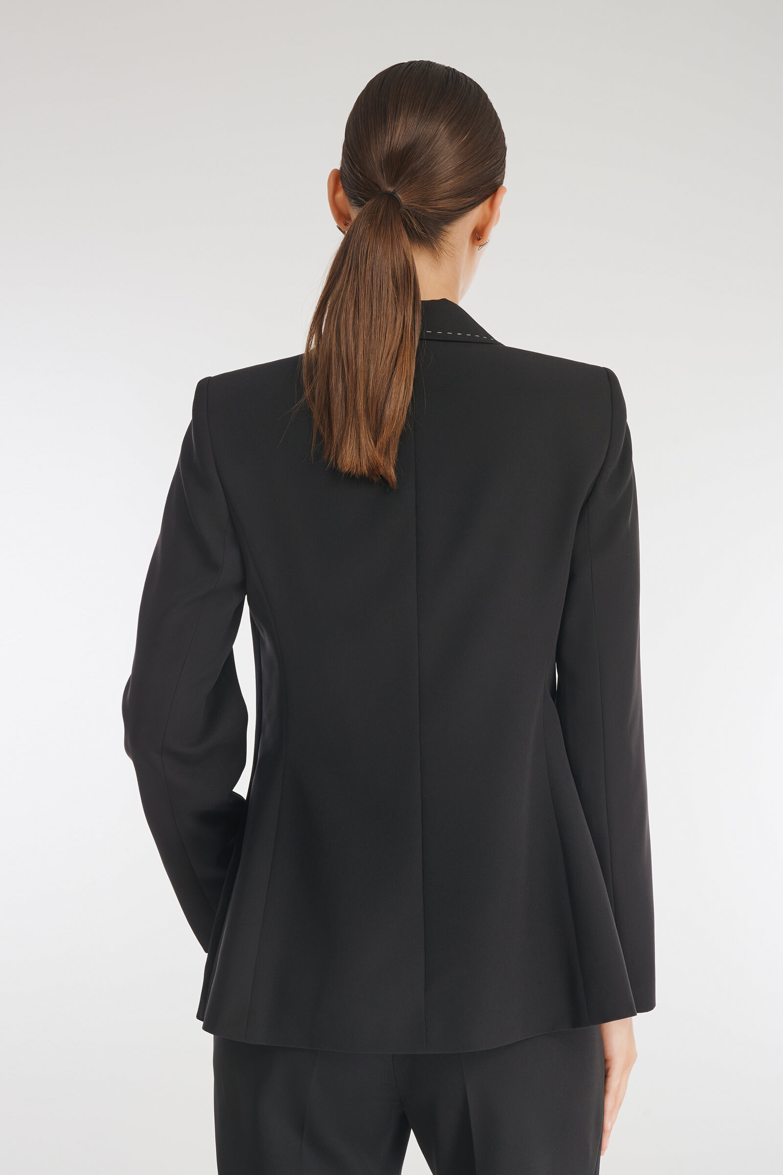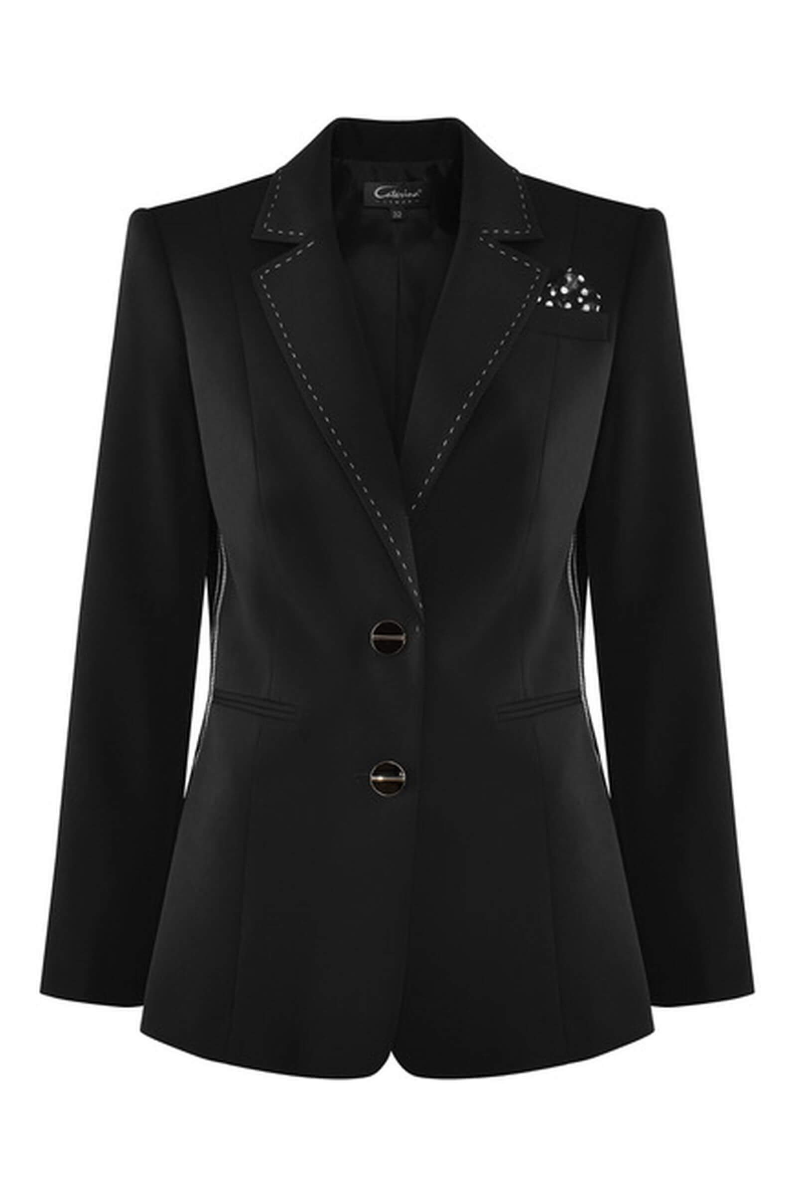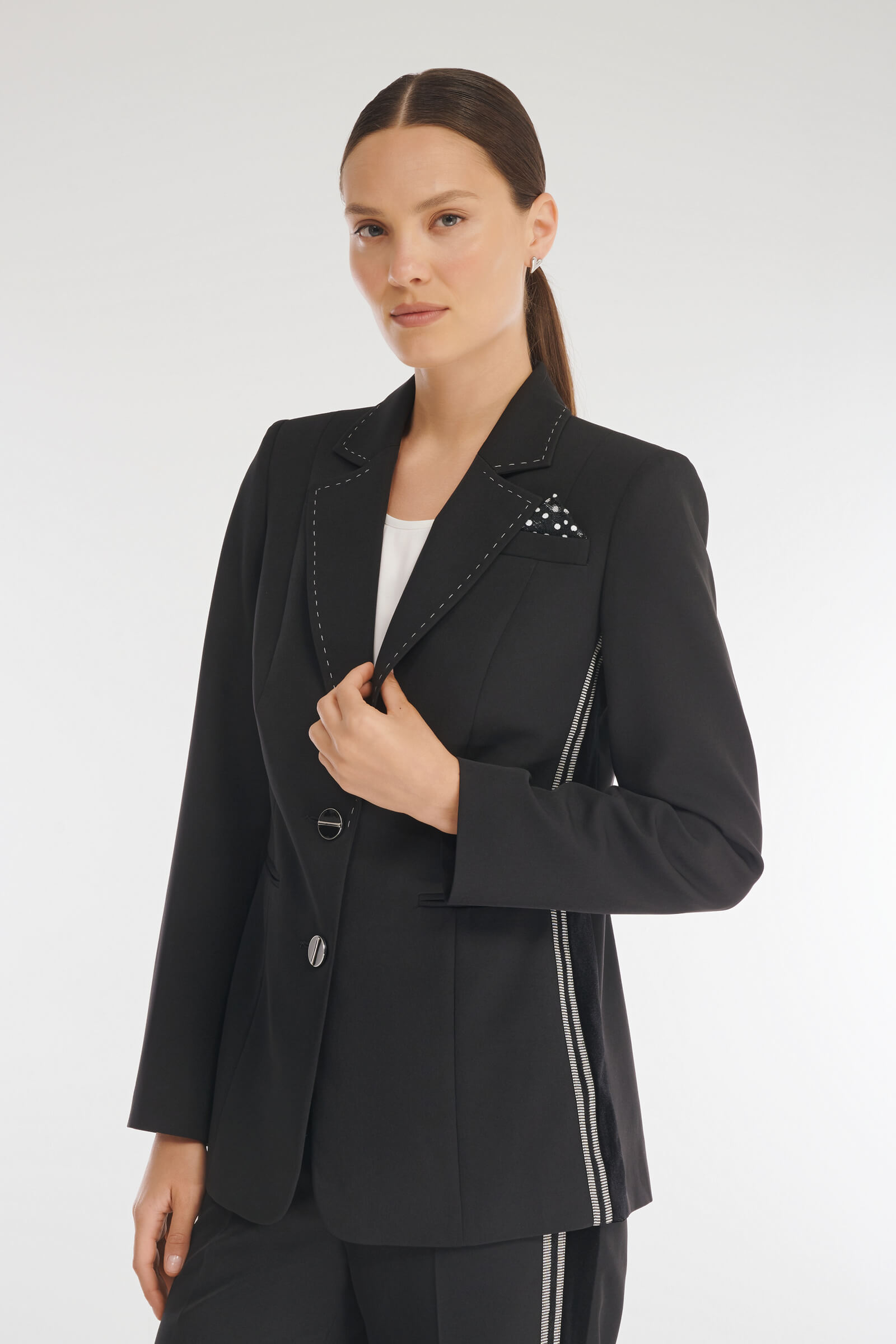 Классический однобортный пиджак заиграл по-новому благодаря деталям. Во-первых — контрастной строчке, украшающей воротник. Во-вторых — вставкам из бархата и декоративной тесьмы по бокам, которые также визуально вытягивают силуэт. В-третьих, благодаря акцентному платку из кружева в нагрудном кармане. Костюмный материал на основе вискозы держит форму, подплечники отвечают за стабильность силуэта.