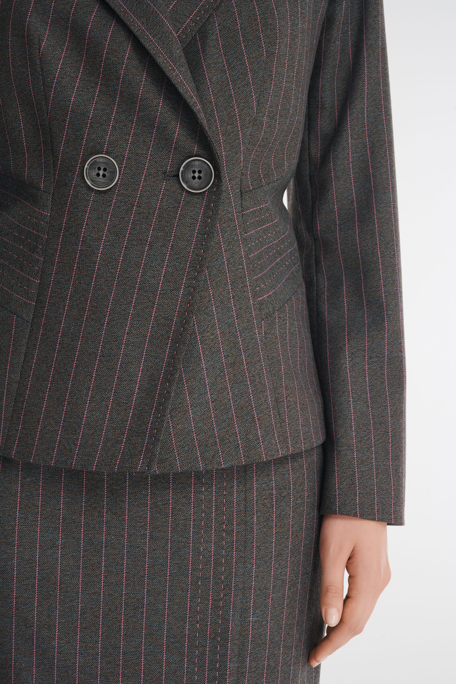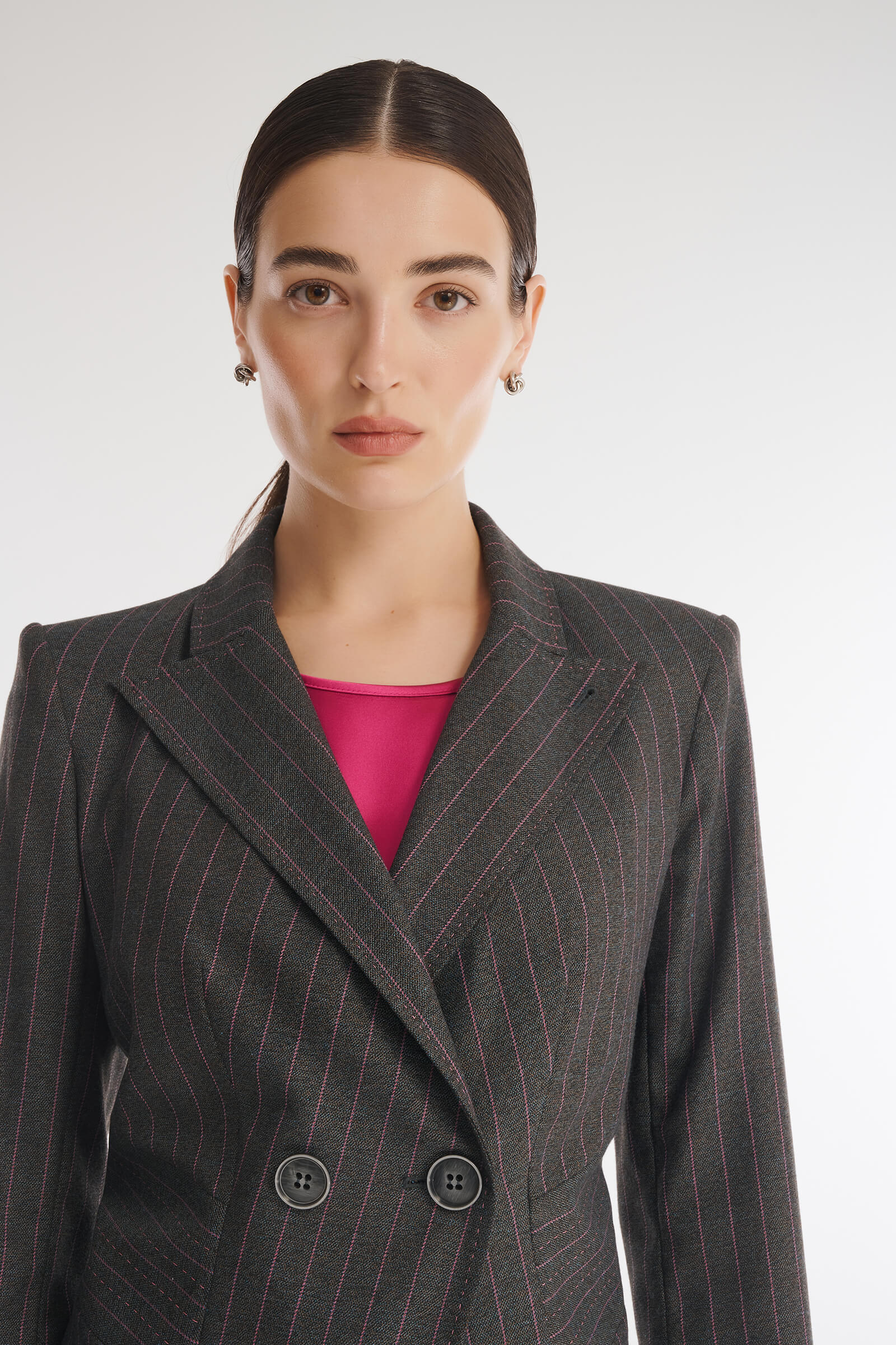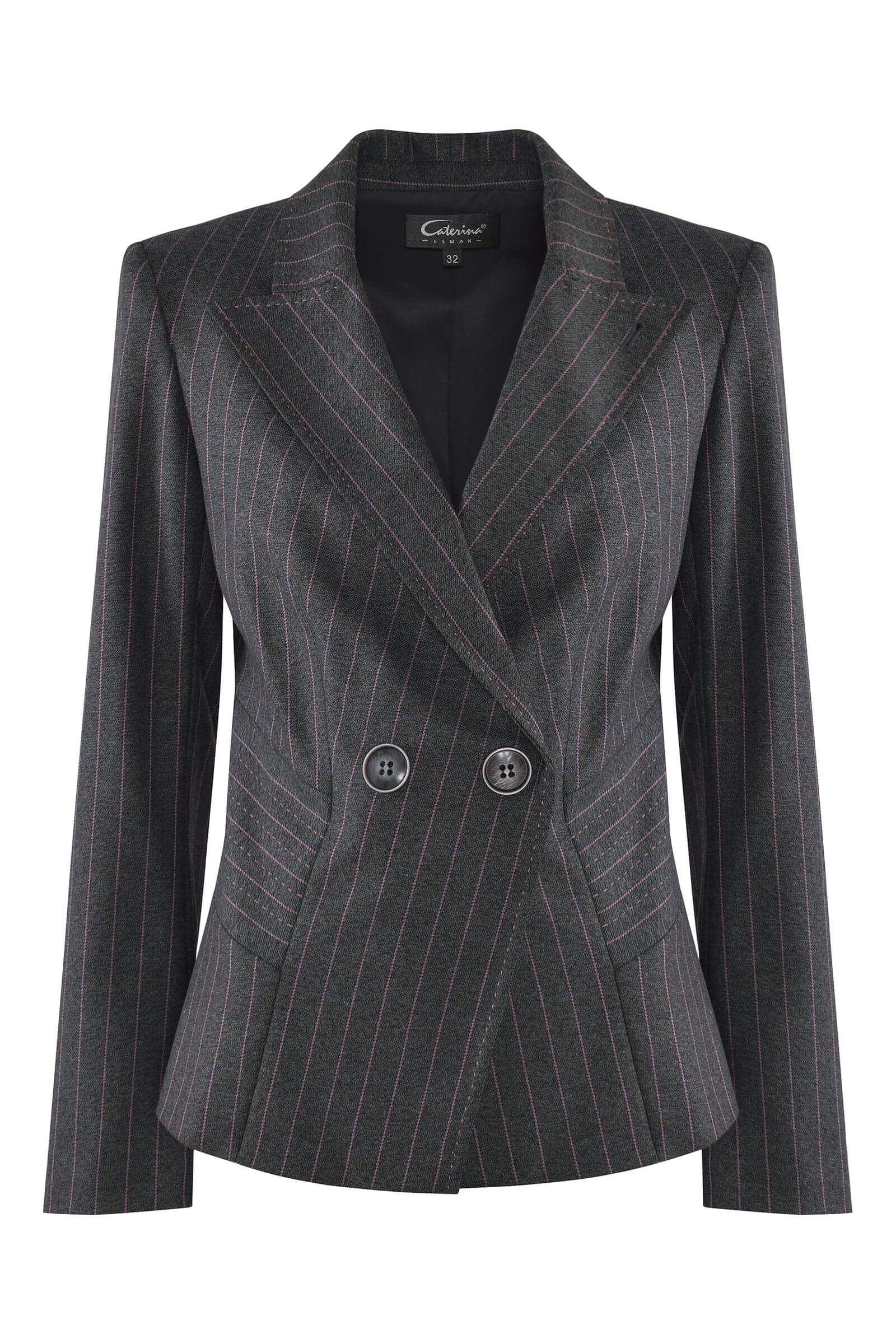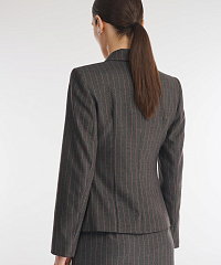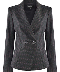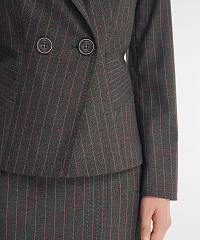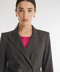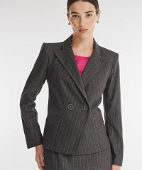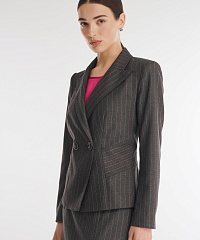 Двубортный пиджак визуально моделирует фигуру, делая похожей на «песочные часы». Крой и вставки с декоративной строчкой акцентируют внимание на талии, а вертикальная полоска вытягивает силуэт. Для создания изделия был выбран высококачественный костюмный материал на основе вискозы, дополненный гладкой подкладкой для еще большего комфорта.