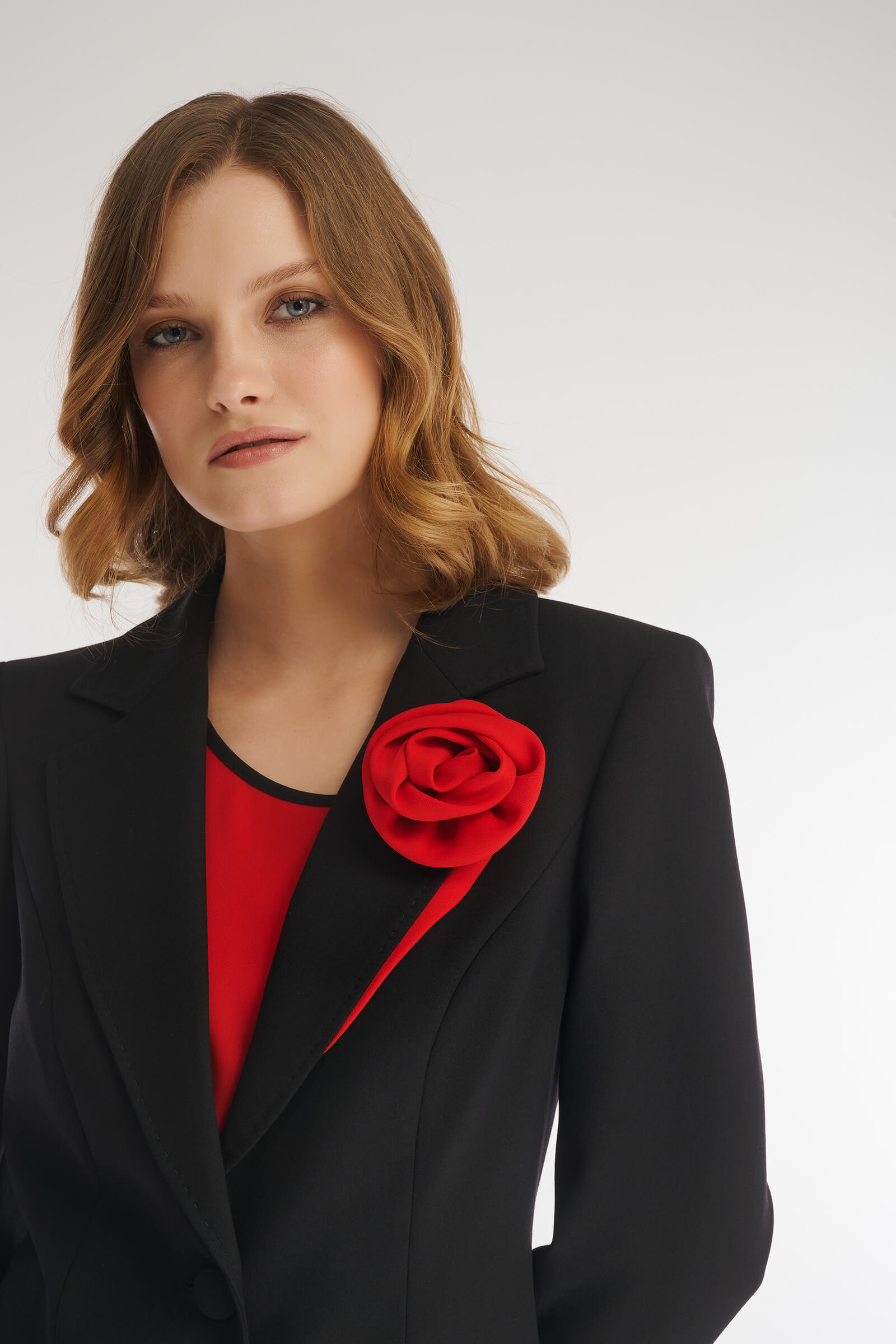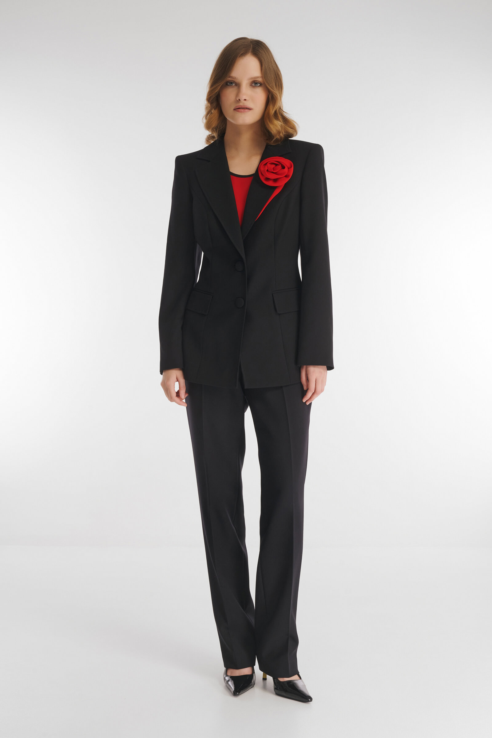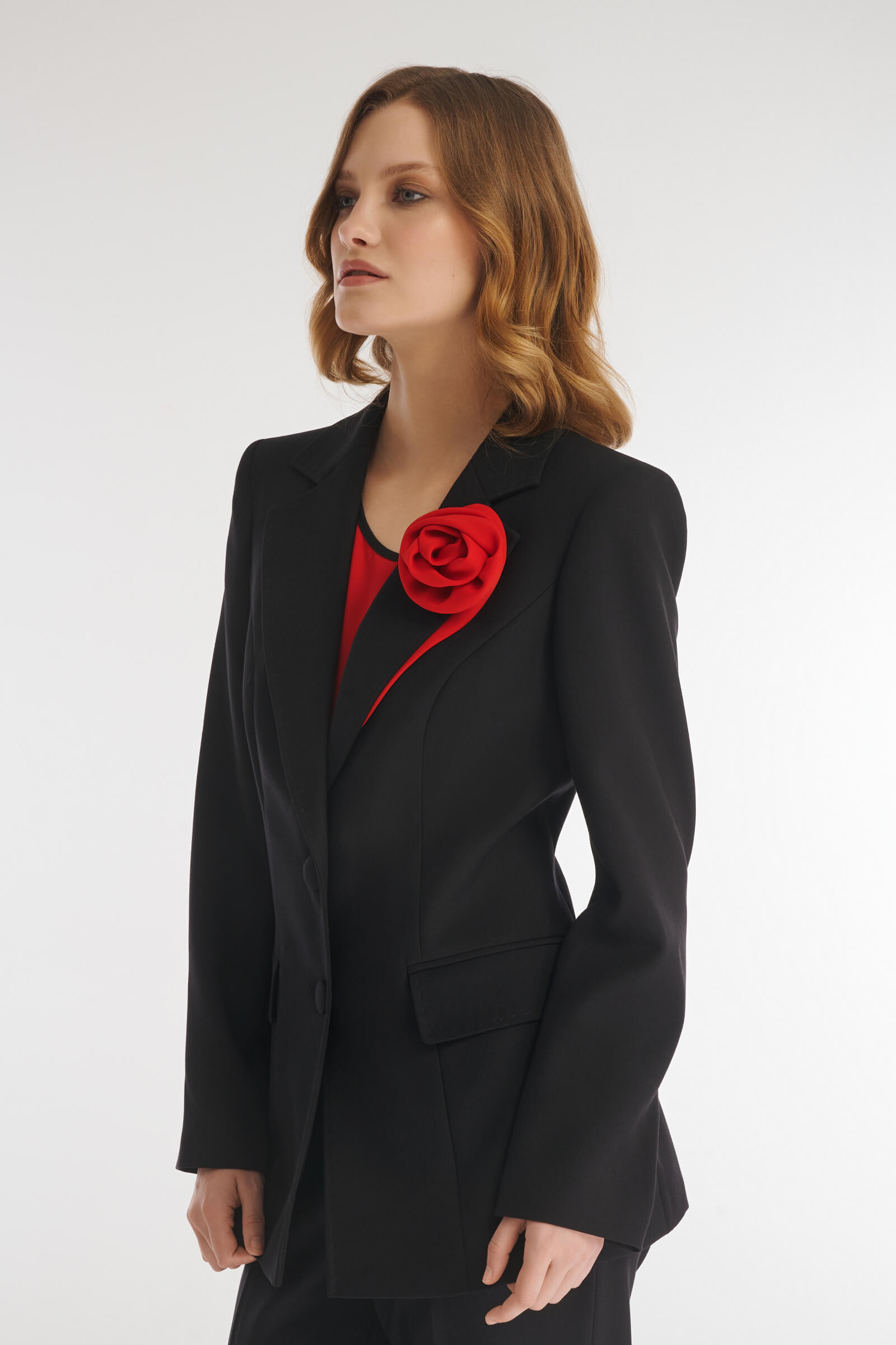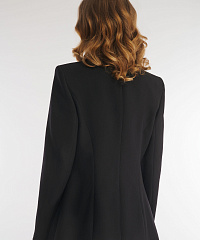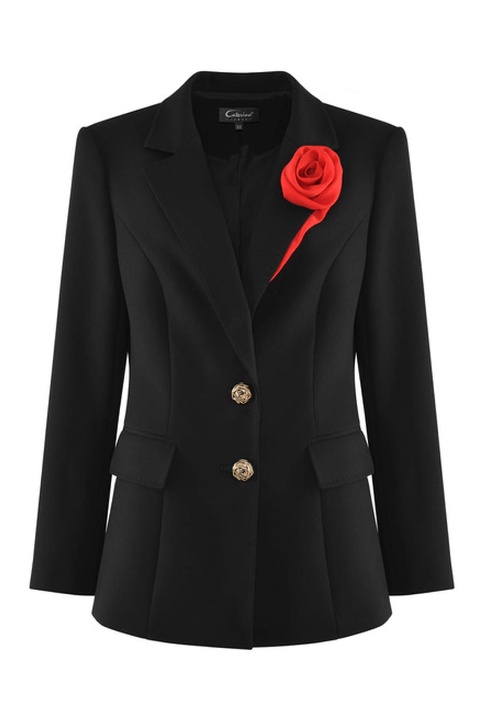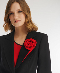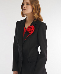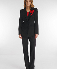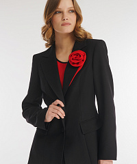 Однобортный пиджак классического фасона с мягким акцентом на талии. Модель выполнили из костюмного материала на основе вискозы, который будет уместен для любого сезона. Гладкая подкладка с антистатическим свойством обеспечивает дополнительный комфорт. Элегантный английский воротник акцентировали объемным цветочным декором.
