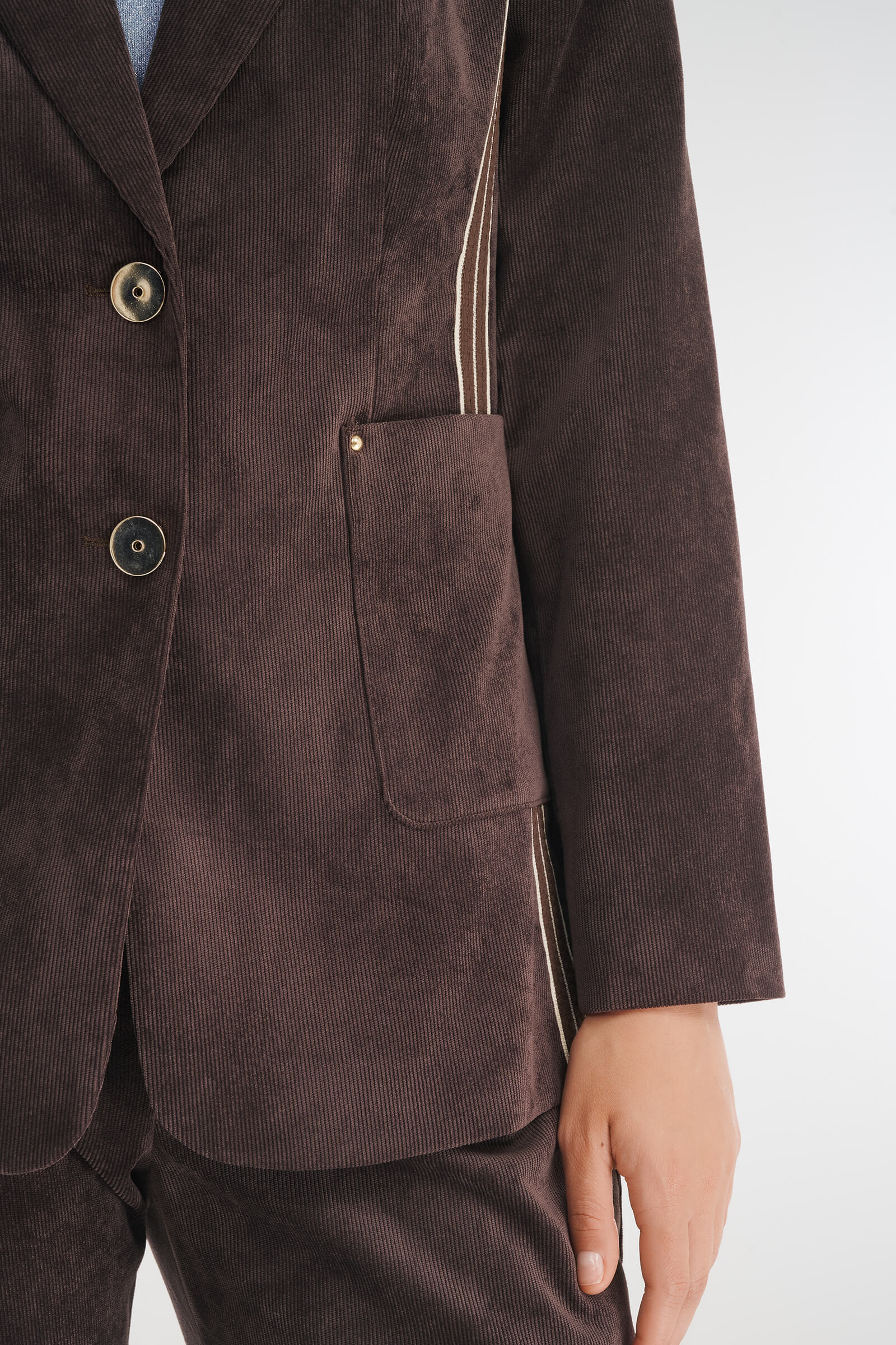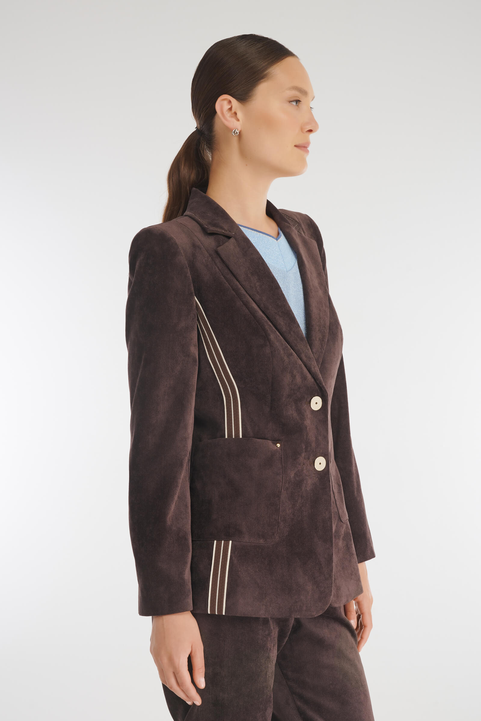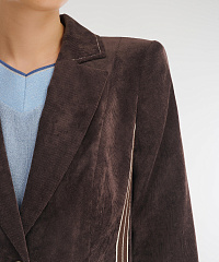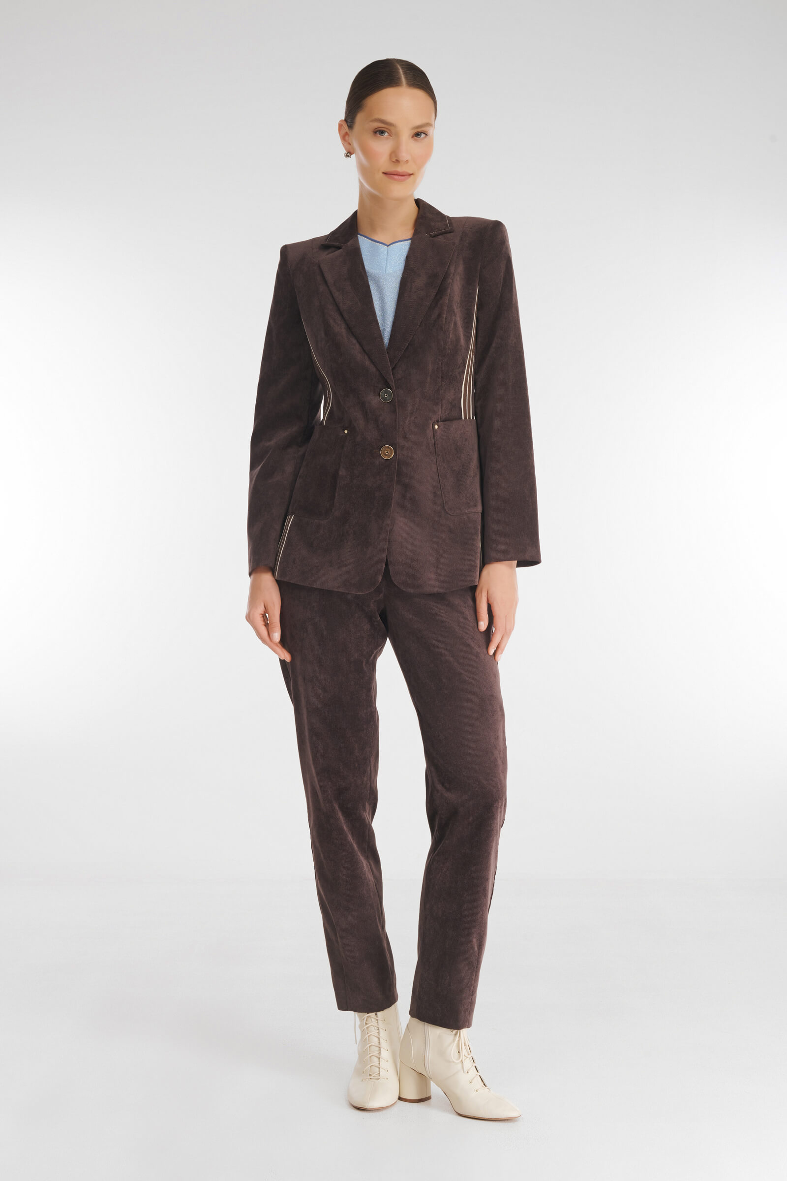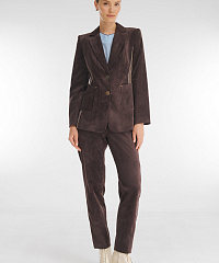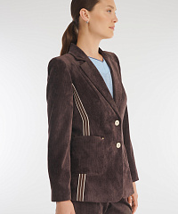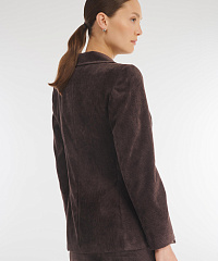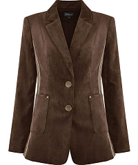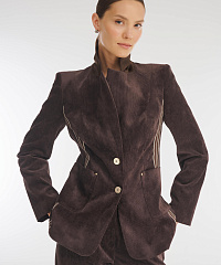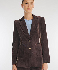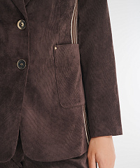 Пиджак из вельвета станет стильным акцентом образа. Модель с элегантным английским воротником застегивается на пуговицы. Декоративная тесьма, украшающая изделие, визуально вытягивает силуэт. Стилизуйте пиджак с любимыми джинсами или комбинируйте с брюками в тон из той же линейки.