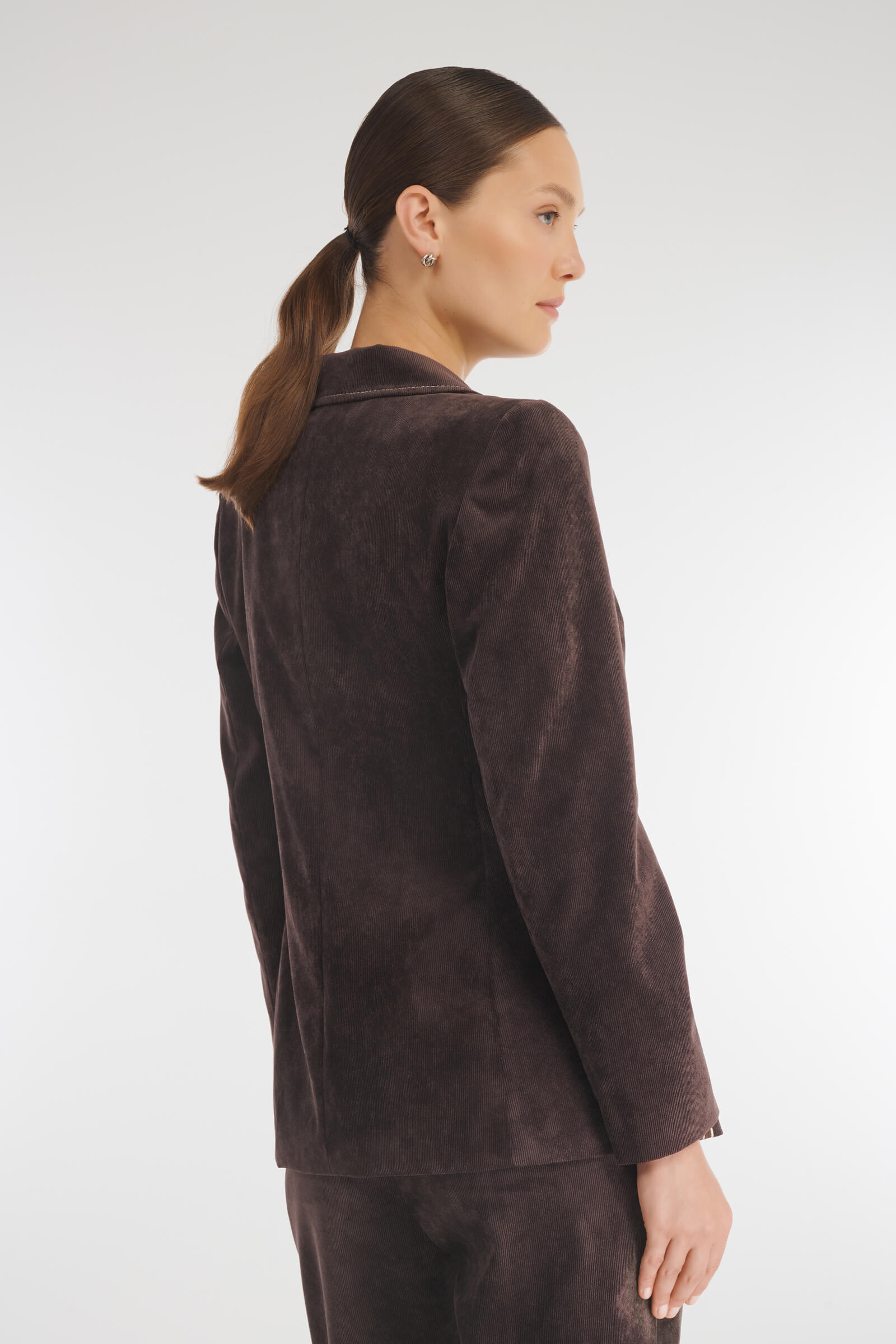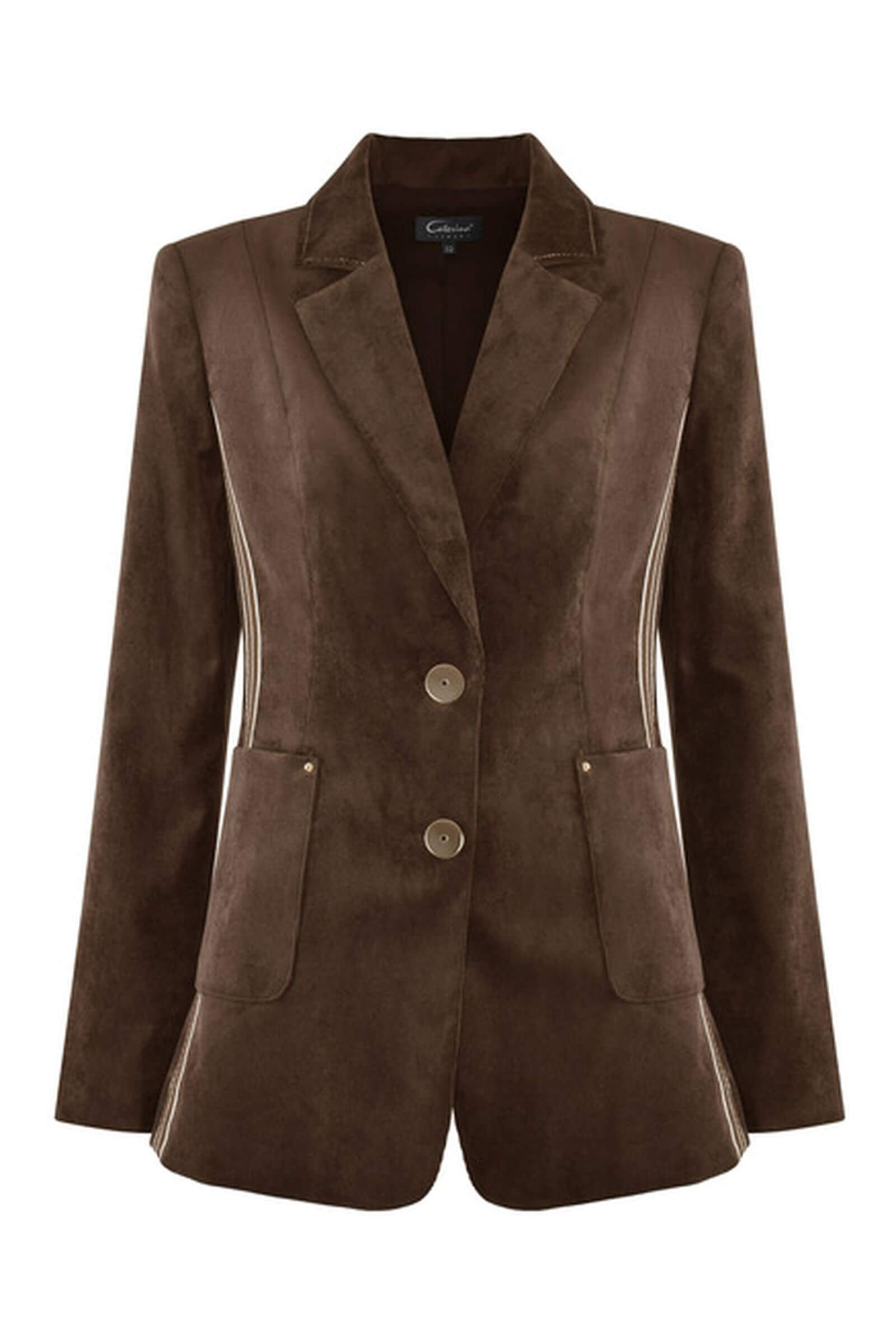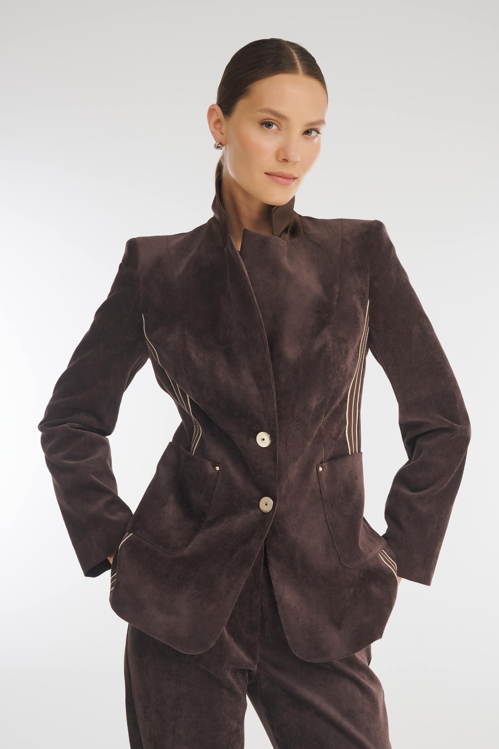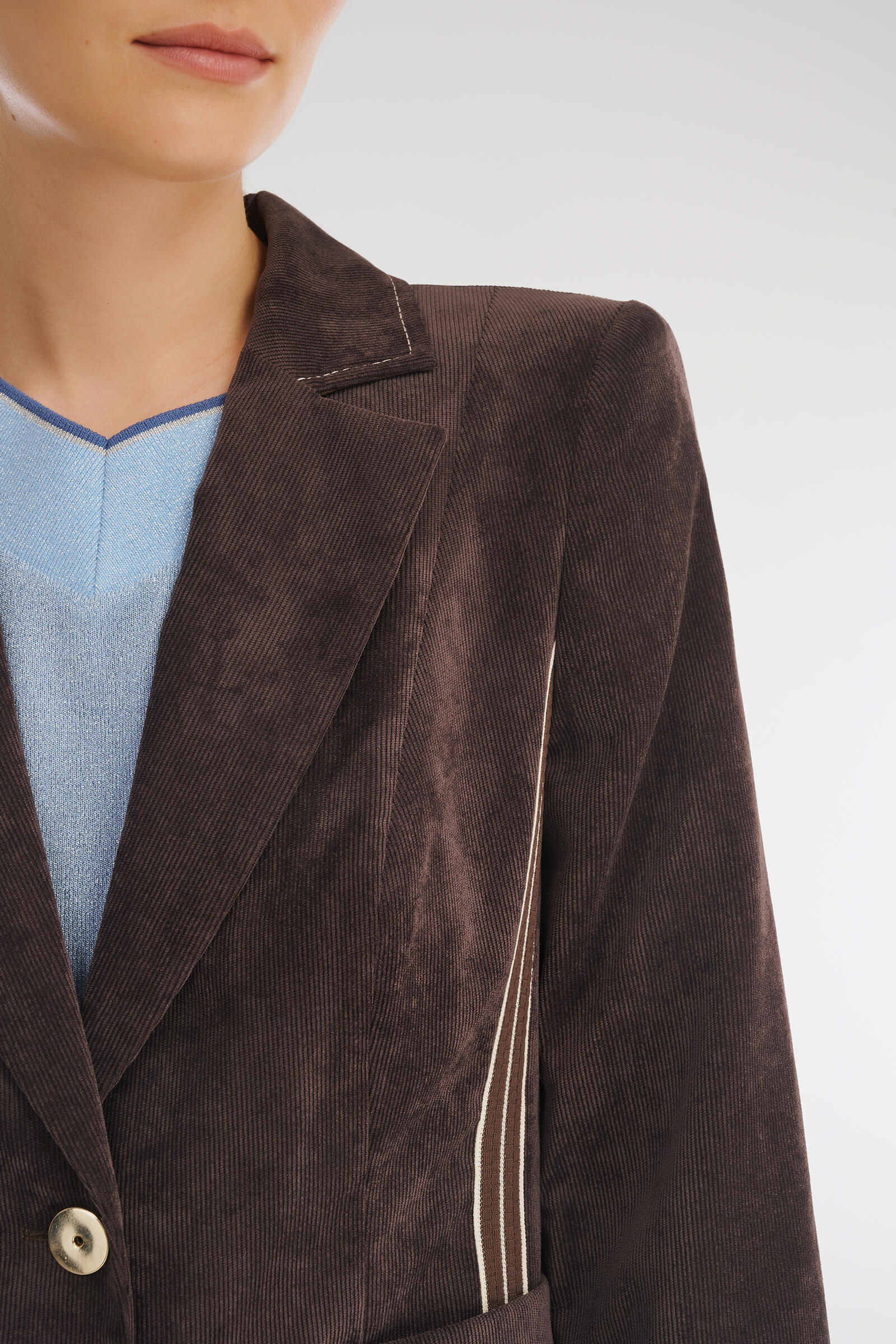 Пиджак из вельвета станет стильным акцентом образа. Модель с элегантным английским воротником застегивается на пуговицы. Декоративная тесьма, украшающая изделие, визуально вытягивает силуэт. Стилизуйте пиджак с любимыми джинсами или комбинируйте с брюками в тон из той же линейки.