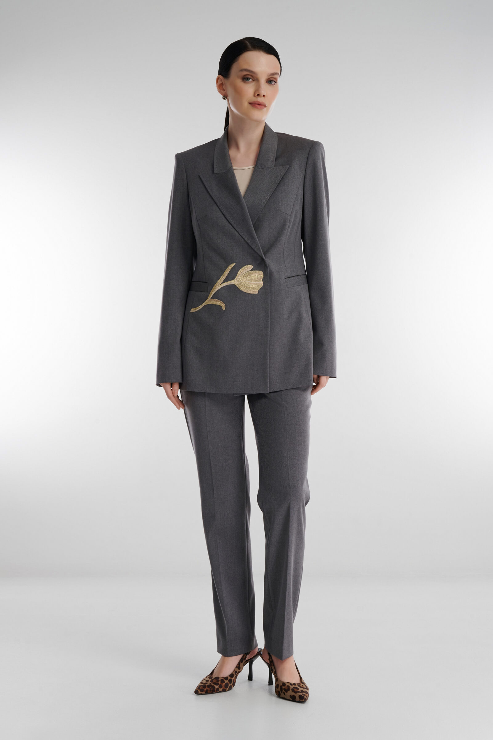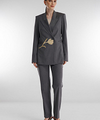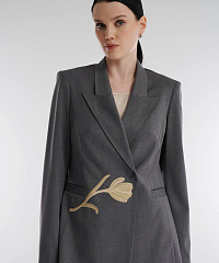 Однобортный пиджак демонстрирует, как классика может звучать по-новому. Элегантный крой с акцентом на талию и линию плеча подчеркивает силуэт, а цветочная вышивка добавляет образу изысканности. Модель выполнена из костюмной ткани, сохраняющей форму и комфорт в течение дня. Пиджак легко адаптируется под формат офиса, деловой встречи или вечернего выхода.