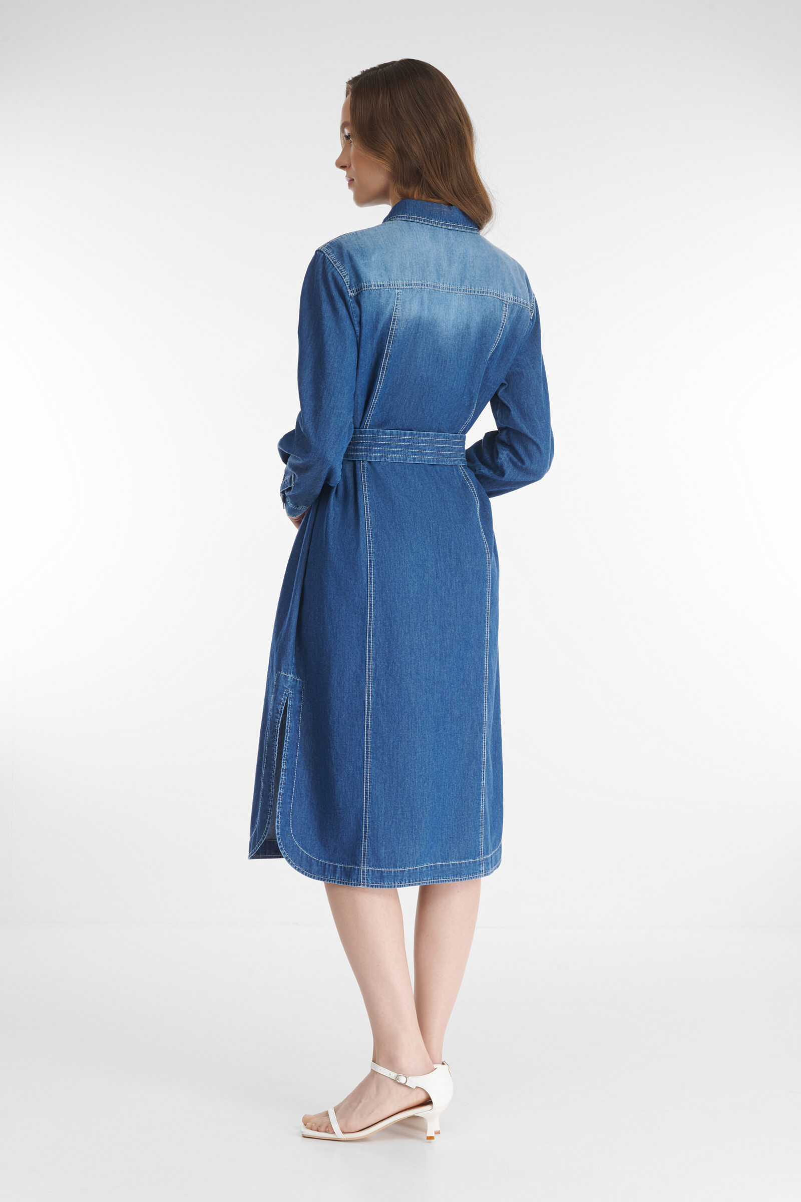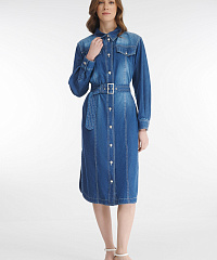 Легкое платье длины миди идеально подойдет для повседневных городских образов. Универсальная модель из дышащего хлопкового денима сочетается как с кроссовками и кедами для прогулок, с лоферами для делового сета, так и с босоножками на танкетке или мюлями для женственного образа. Талию можно акцентировать широким поясом.