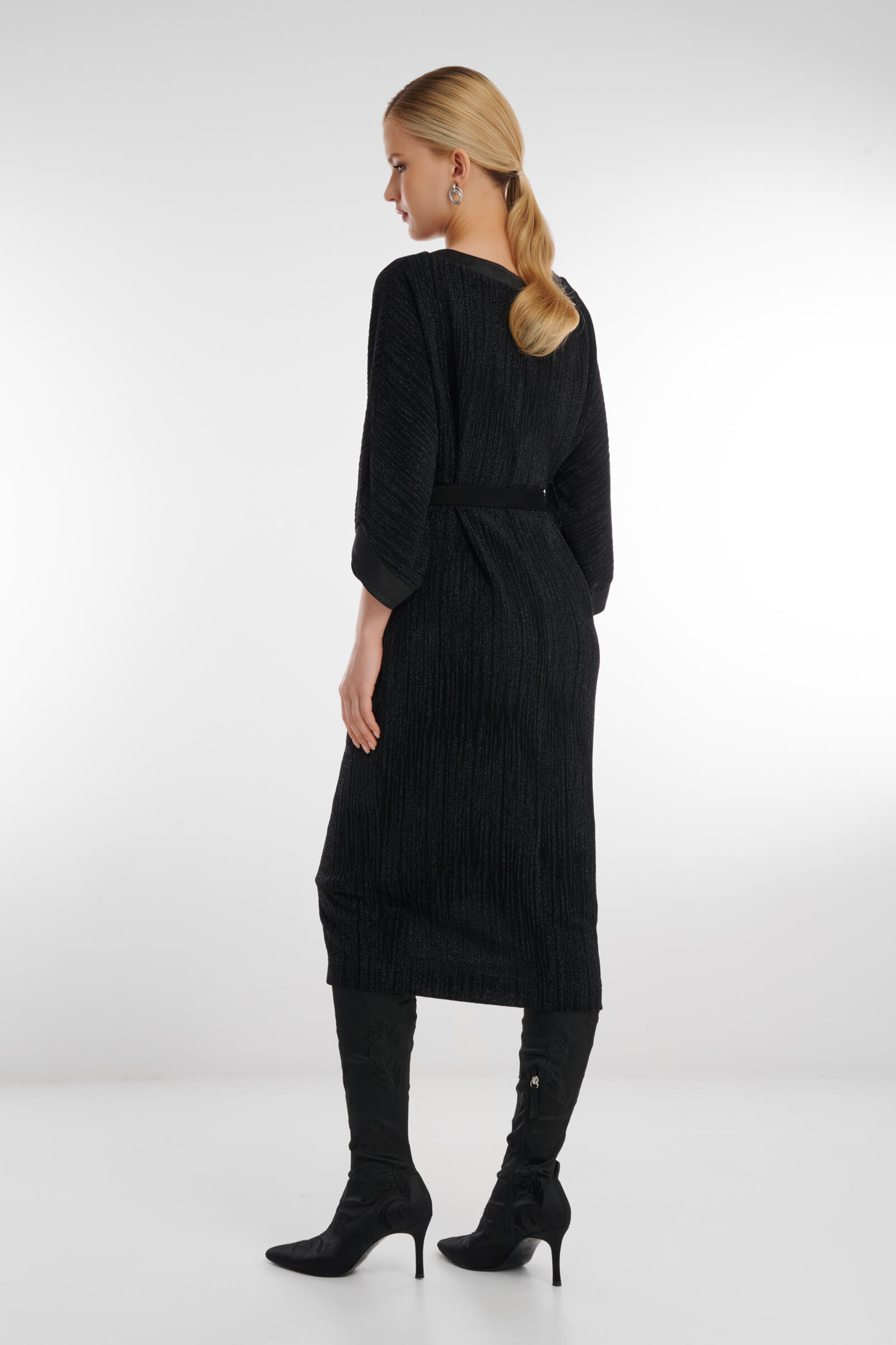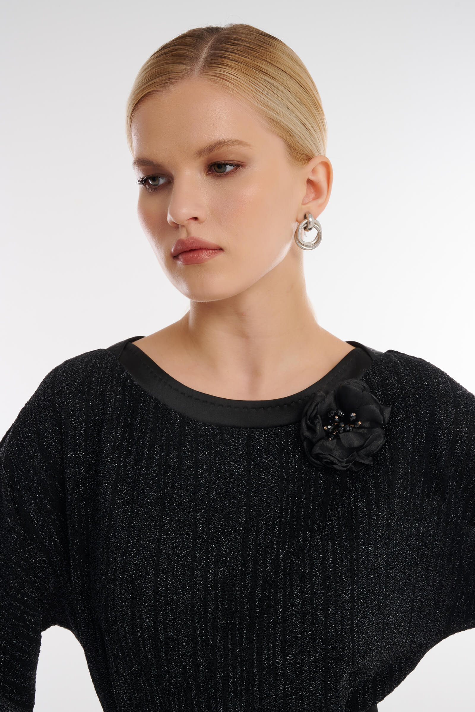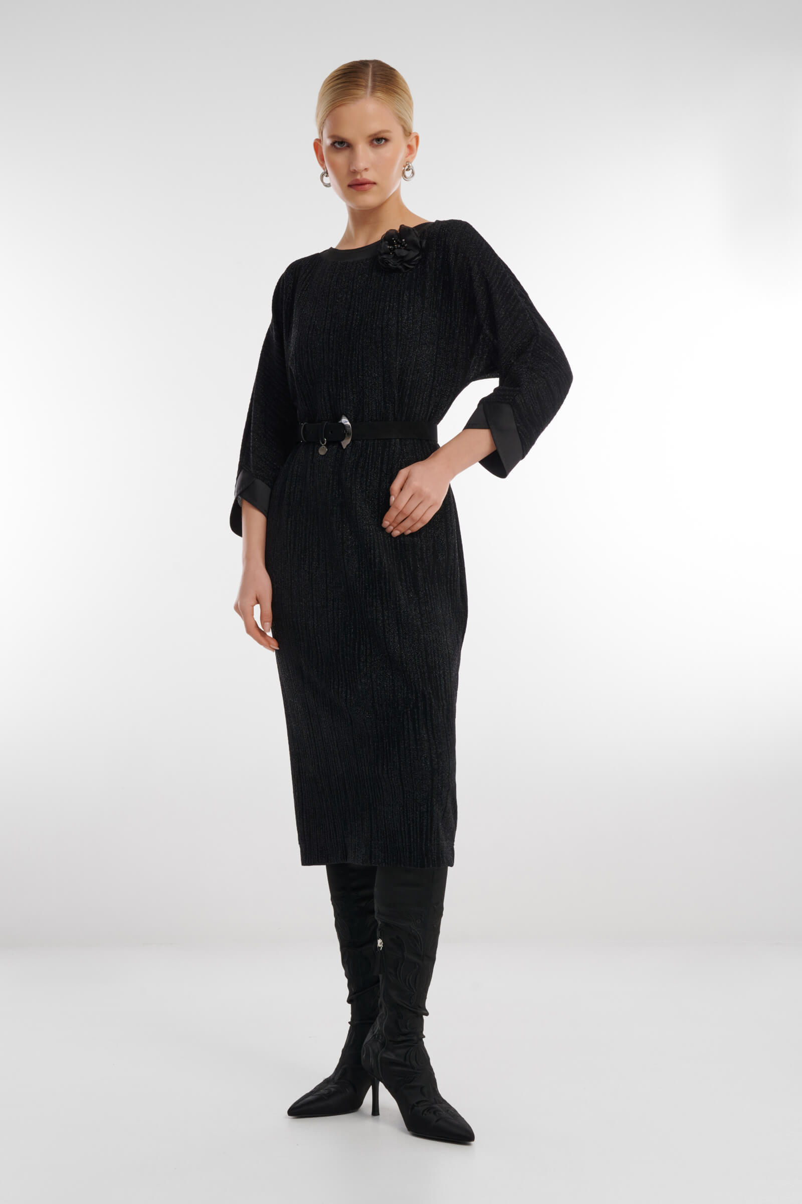 Элегантное платье подчёркивает женственность за счёт мягкого силуэта и утончённых деталей. Рукава длиной 7/8 создают изящную линию, а декоративный цветок-виньетка добавляет образу акцент нежности и деликатной выразительности. Универсальная модель для тех, кто ценит лёгкость, природную грацию и безупречный стиль.