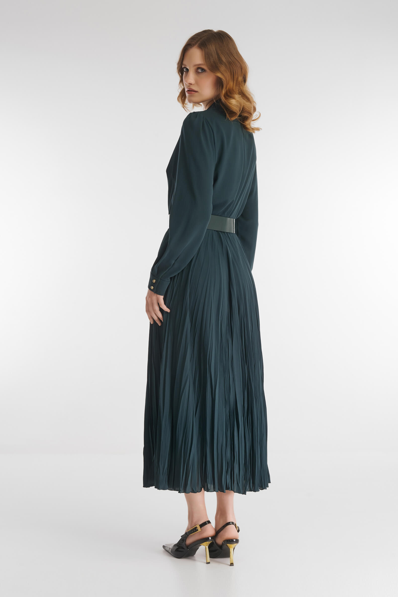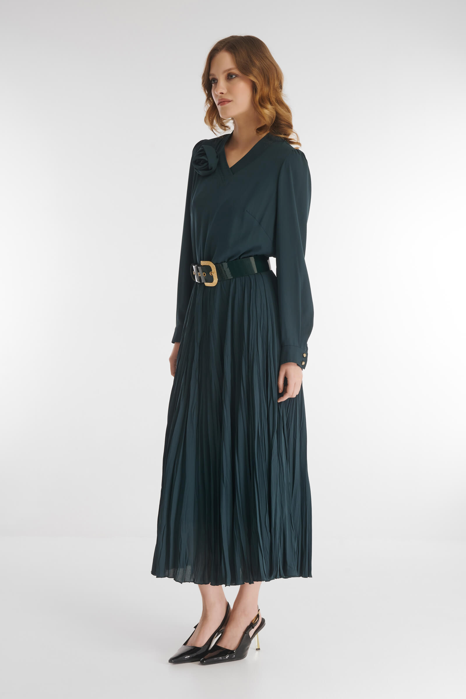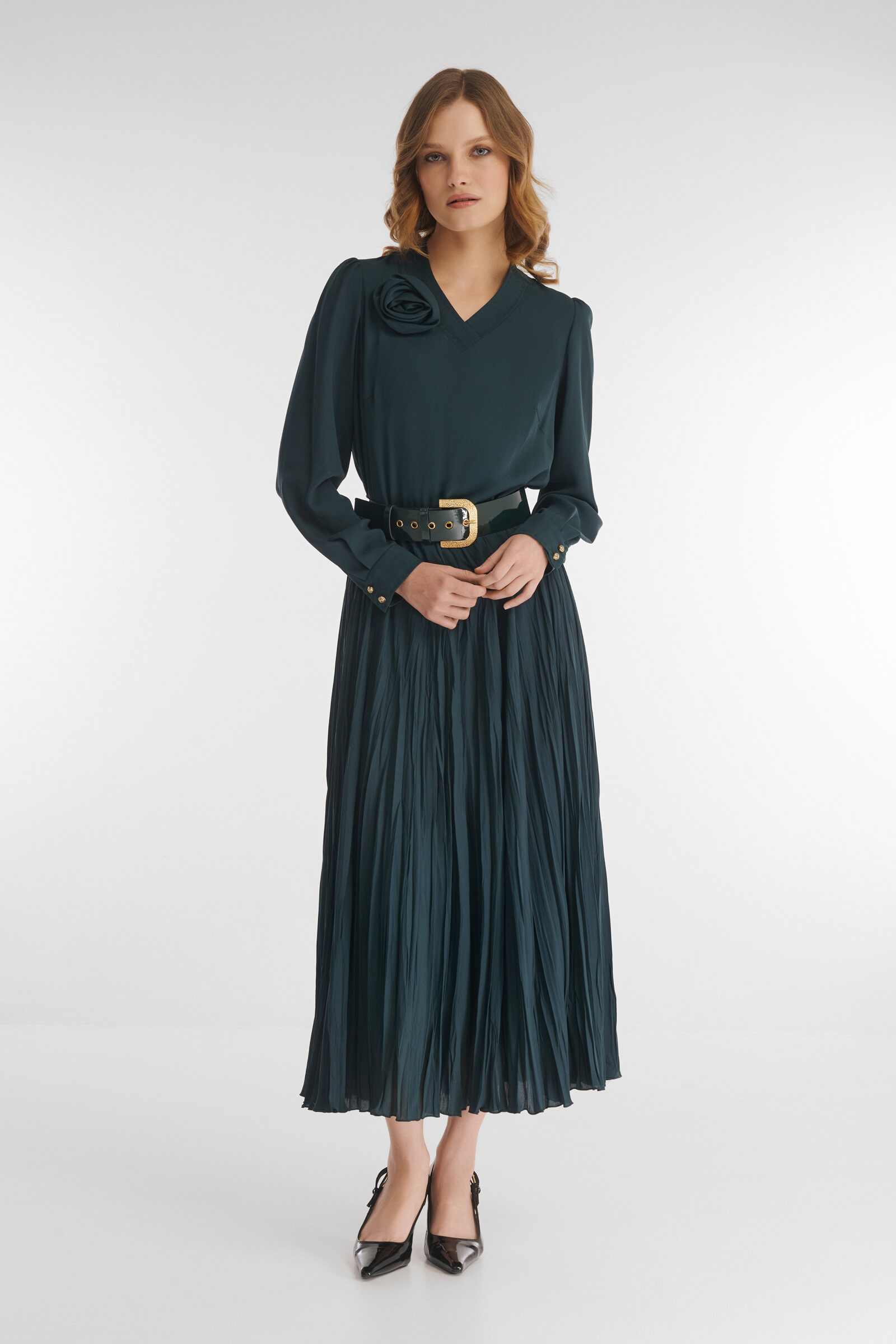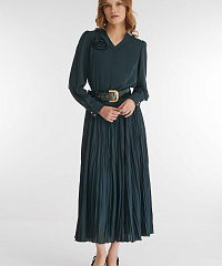 Платье, в котором гармонично сочетаются элегантность и романтическое настроение. Расклешенный крой, а также умелая комбинация гладкого материала в верхней части и юбки из ткани с крэш эффектом делают модель подходящим вариантом для разных типов фигуры. Для комфортной посадки предусмотрена скрытая резинка на талии. V-образный вырез визуально вытягивает шею.
