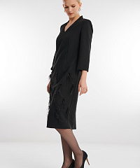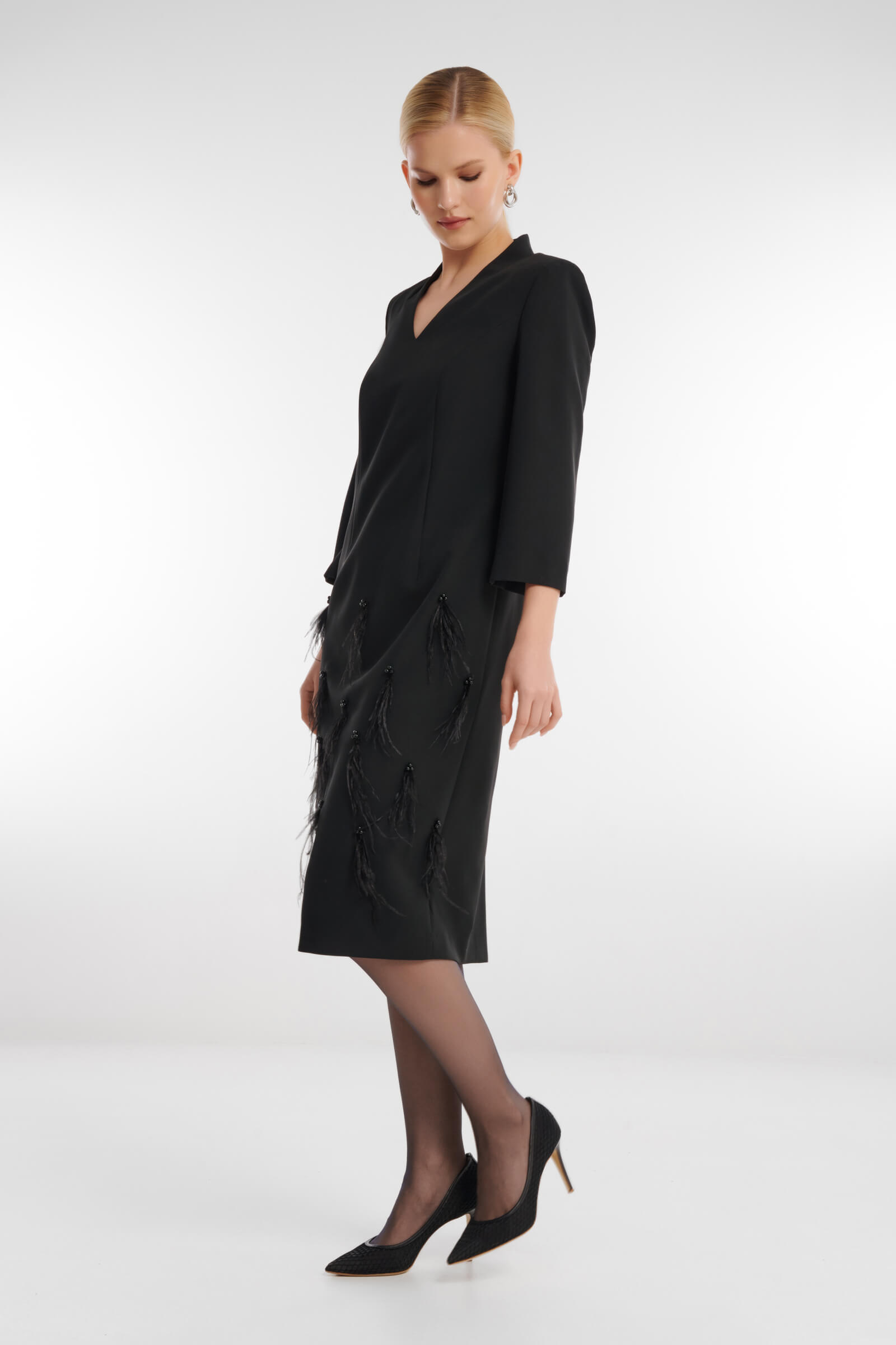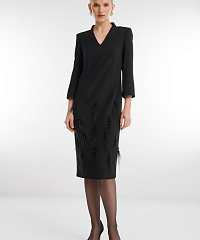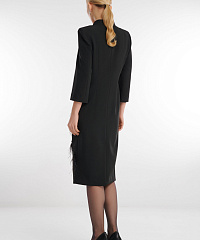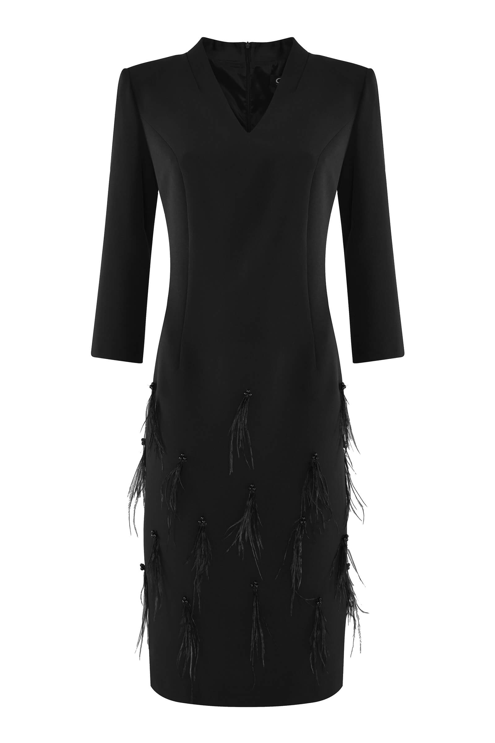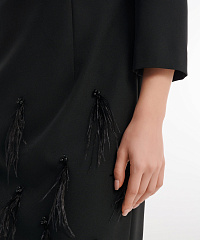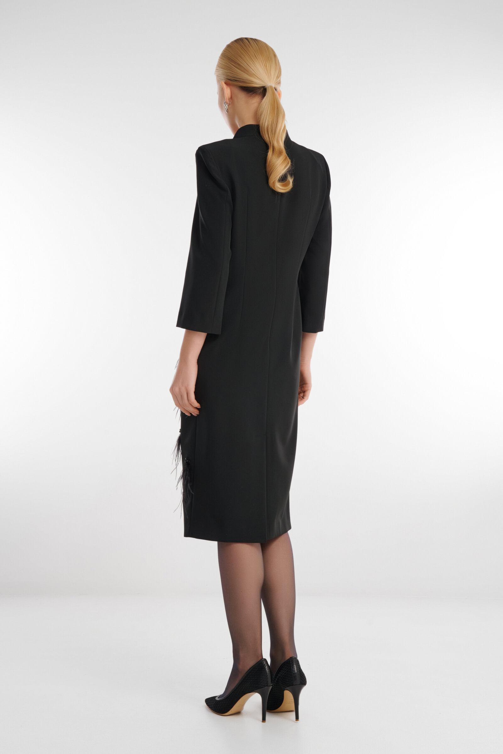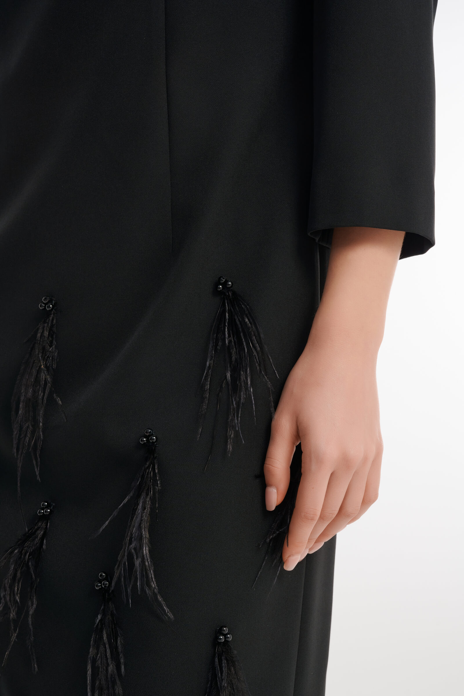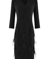 Платье-футляр создано для образов, в которых хочется подчеркнуть элегантность и женственность. Лаконичный силуэт дополнен утончённым декором из перьев, а тонкие подплечники сохраняют стабильную линию плеч и формируют безупречный верх. Универсальная длина делает модель комфортной в сочетании с любой обувью — от изящных каблуков до мягких балеток.