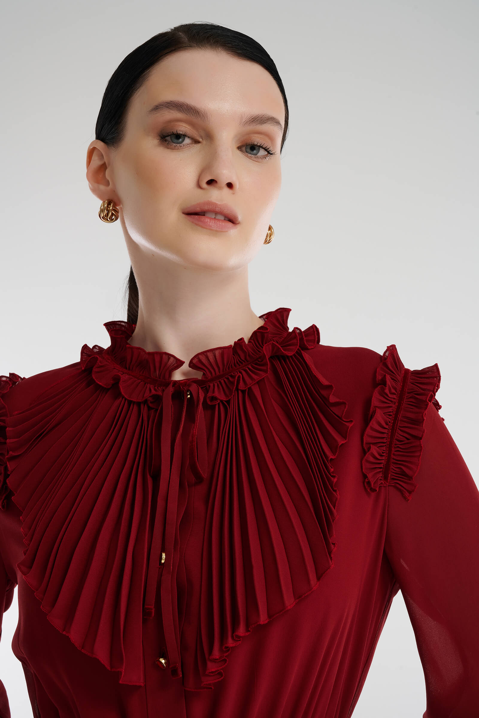 - Круглый вырез с плиссированным жабо и декоративными завязками из бархата