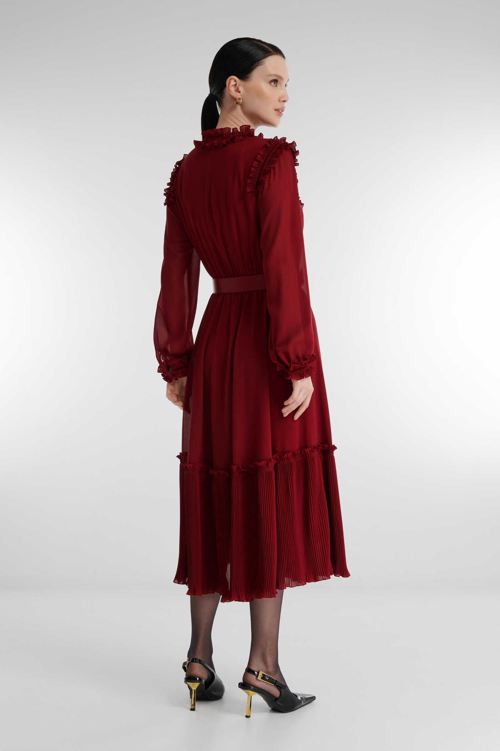 - Декор из рюшей на плечах, манжетах и вырезе