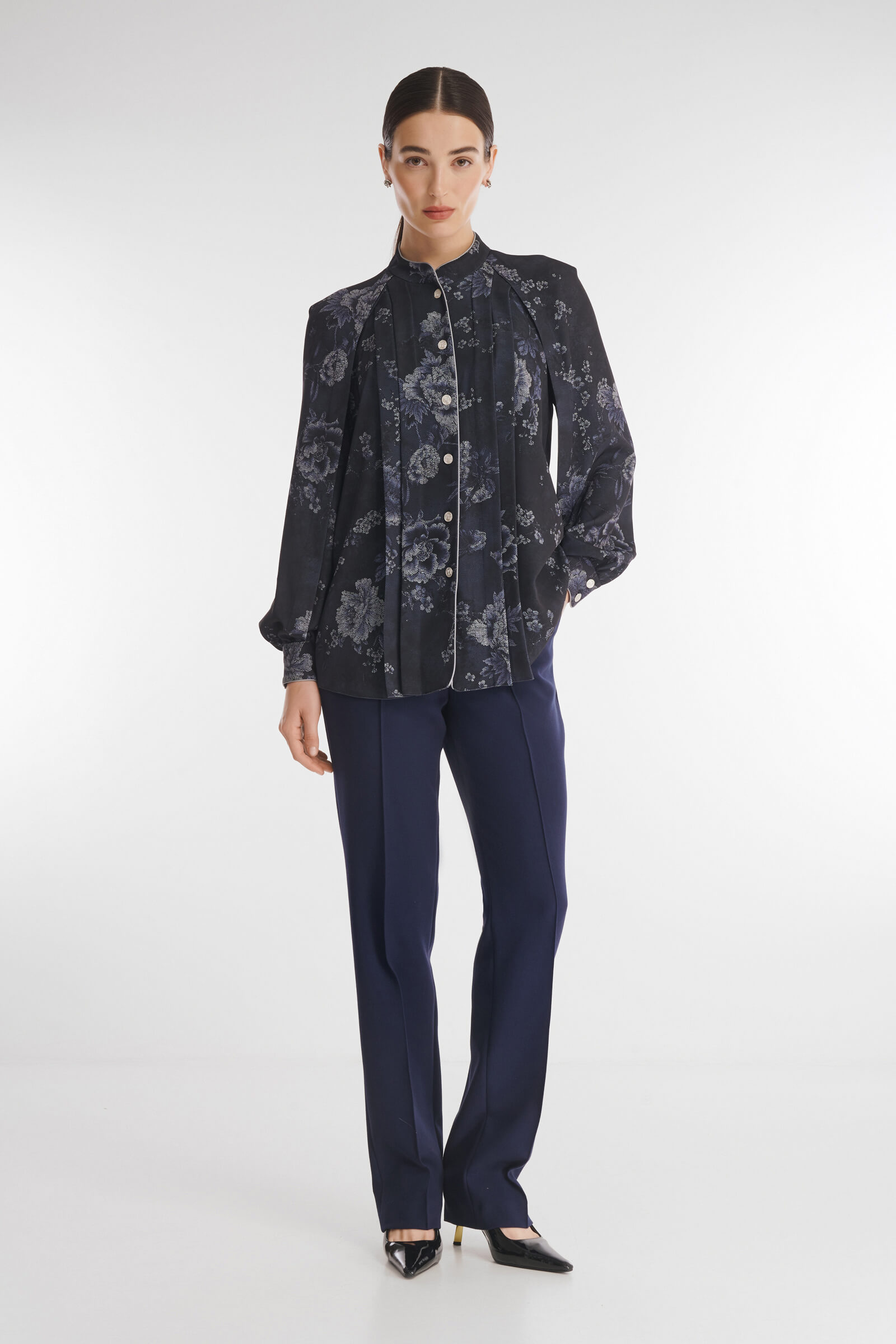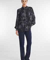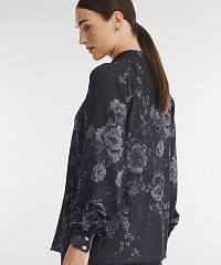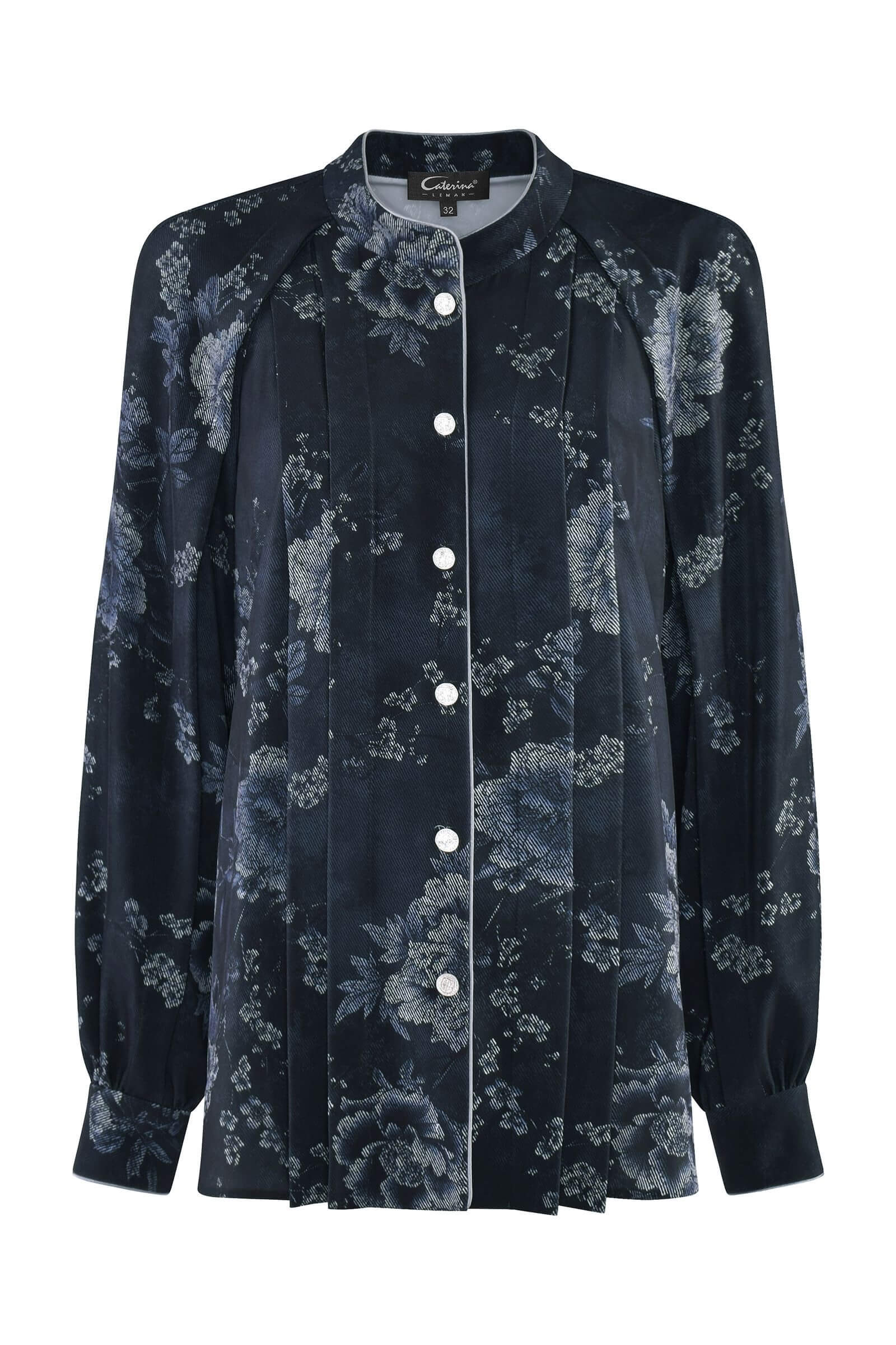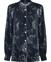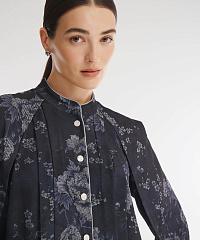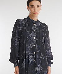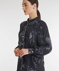 Стильная рубашка с цветочным принтом и декоративными складками, красиво усложняющими силуэт. Для создания модели был выбран плотный непросвечивающий материал из поливискозы, который поддерживает форму изделия. Дизайн позволяет стилизовать рубашку в различные образы, а крой — носить свободной или в тандеме с аксессуаром на талии.