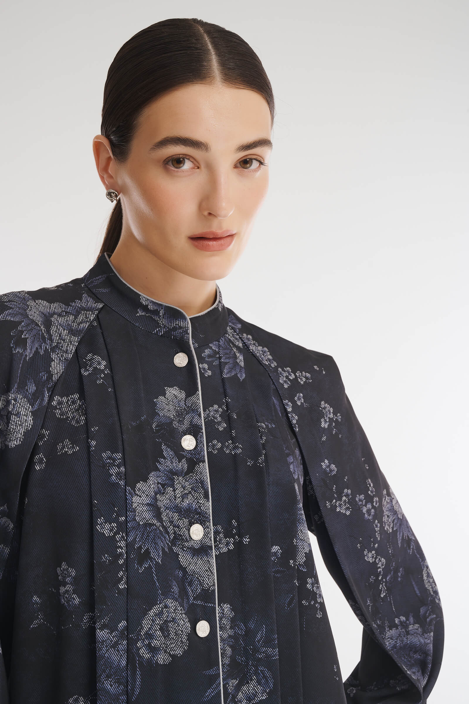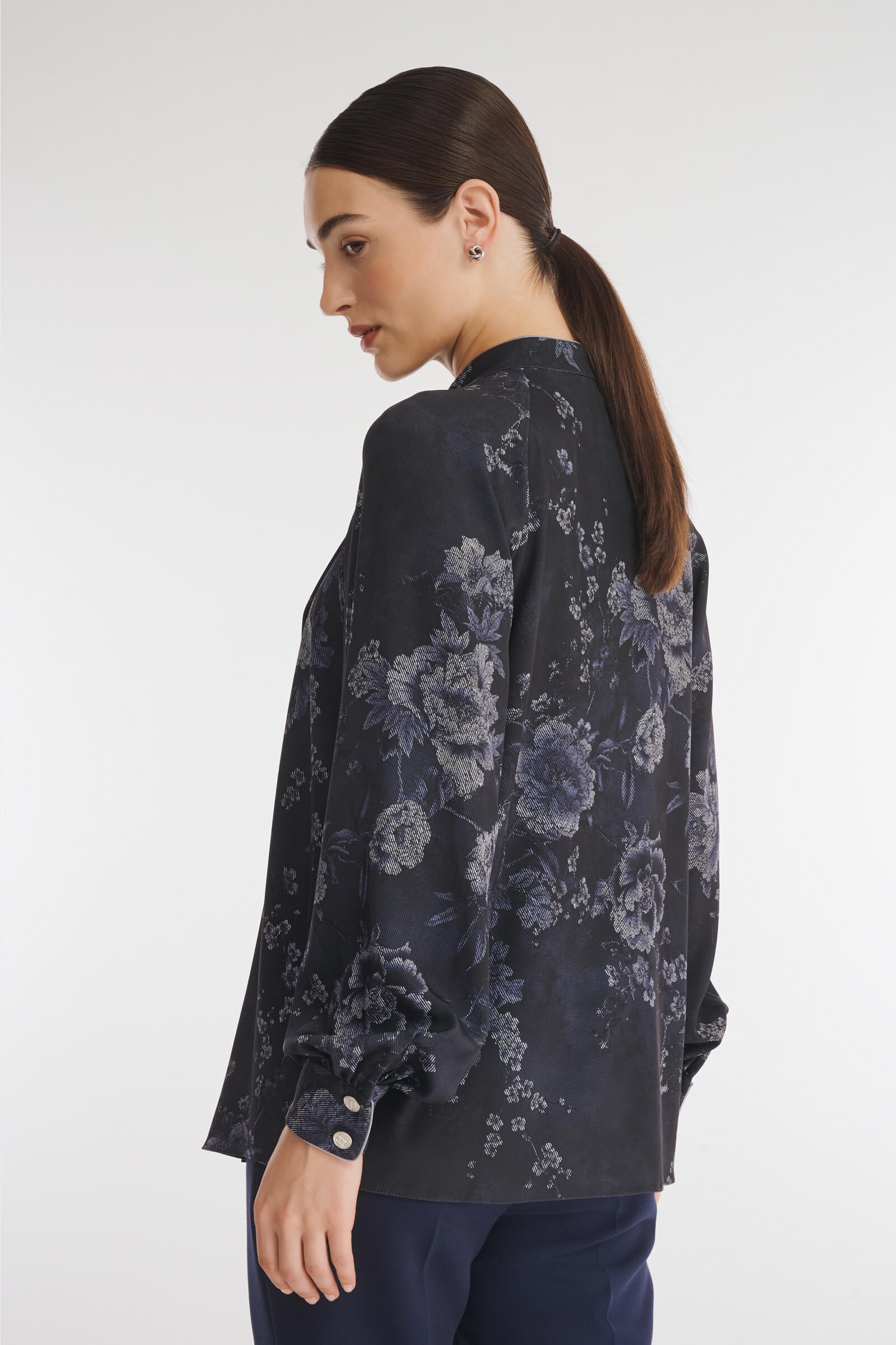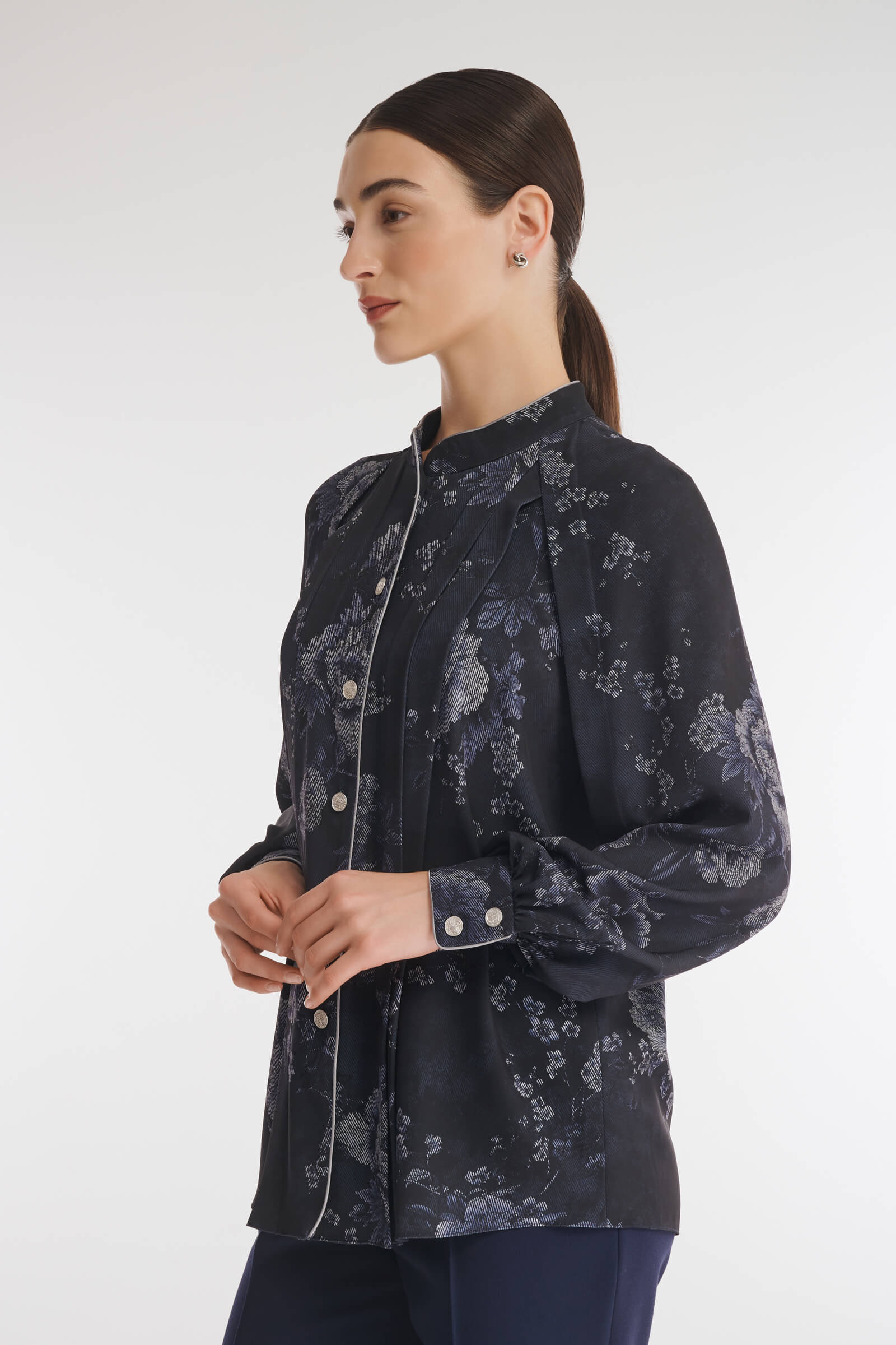 Стильная рубашка с цветочным принтом и декоративными складками, красиво усложняющими силуэт. Для создания модели был выбран плотный непросвечивающий материал из поливискозы, который поддерживает форму изделия. Дизайн позволяет стилизовать рубашку в различные образы, а крой — носить свободной или в тандеме с аксессуаром на талии.