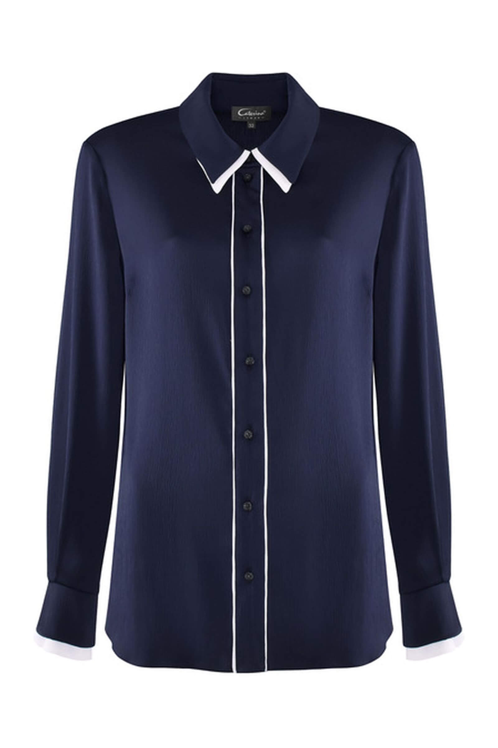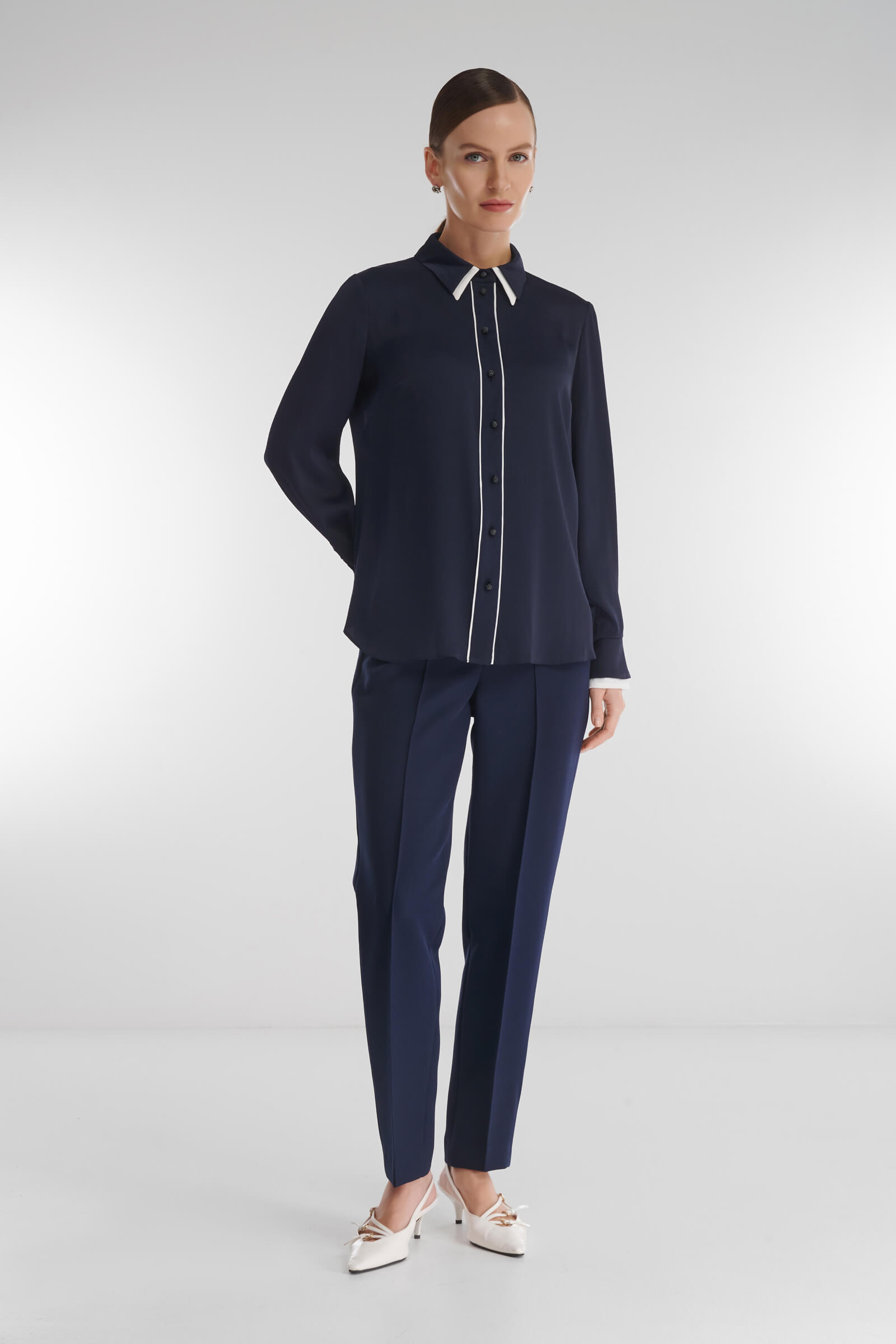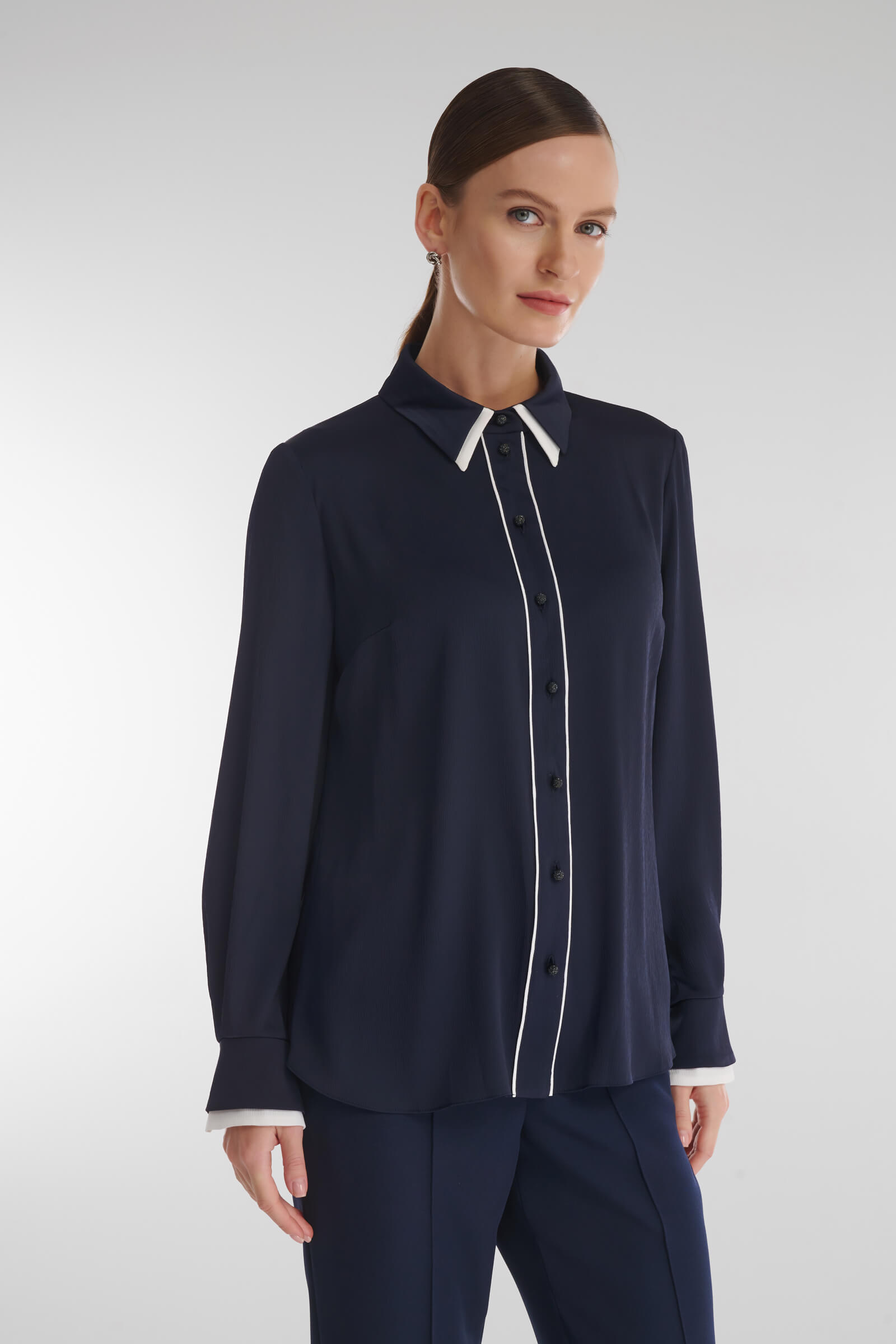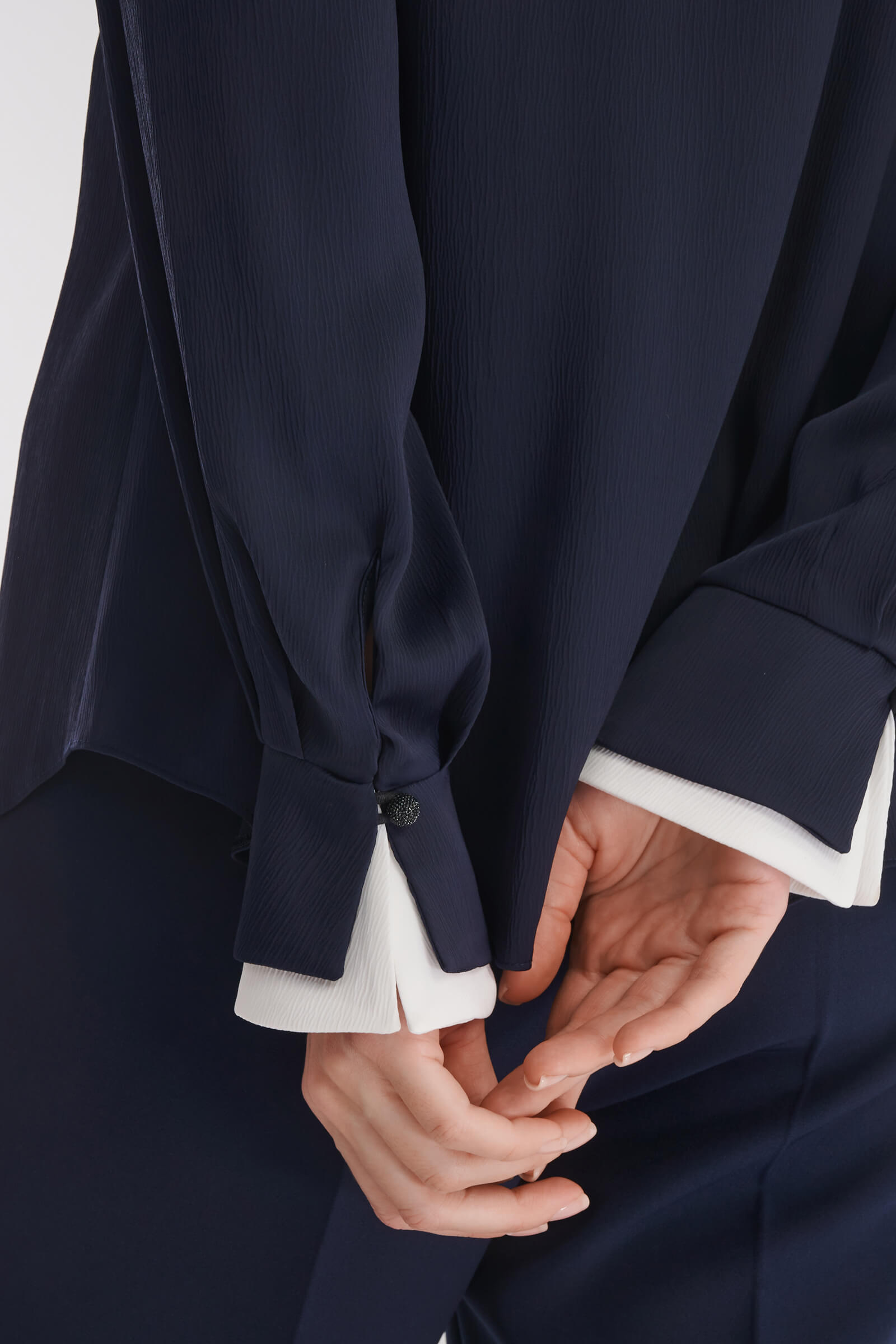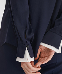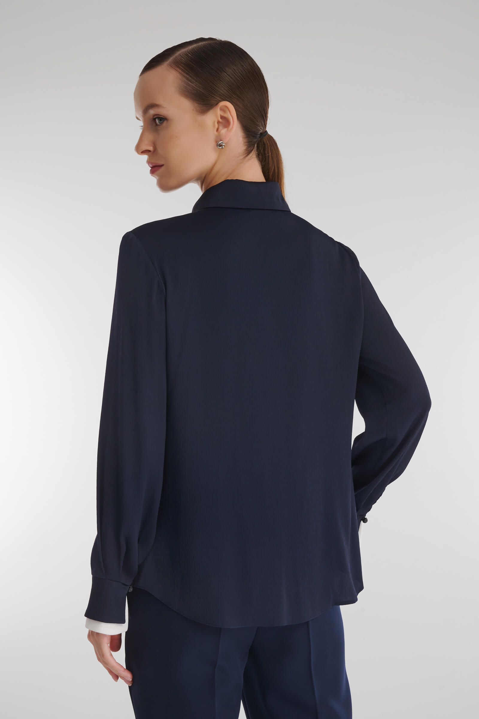 Легкая рубашка с шелковистым блеском и фактурной поверхностью создает утонченный, но выразительный акцент в образе. Контрастная окантовка пуговичной планки и двойной воротник придают модели характер и индивидуальность. Она гармонично сочетается с классическими брюками и юбками-карандаш, а в паре с джинсами или широкими брюками образует расслабленный, но безупречно стильный ансамбль.