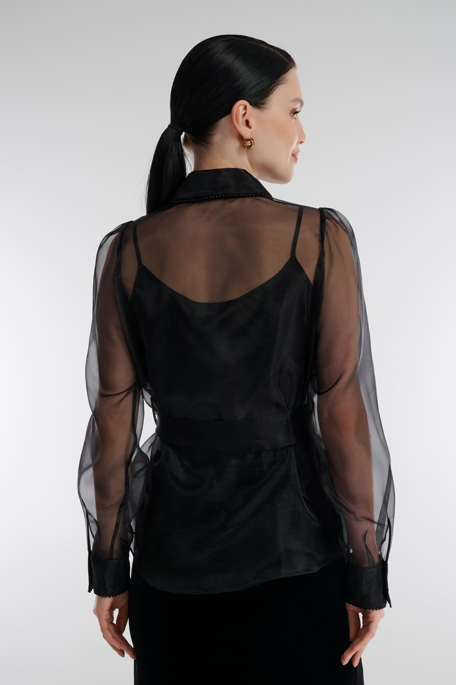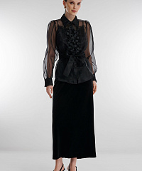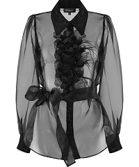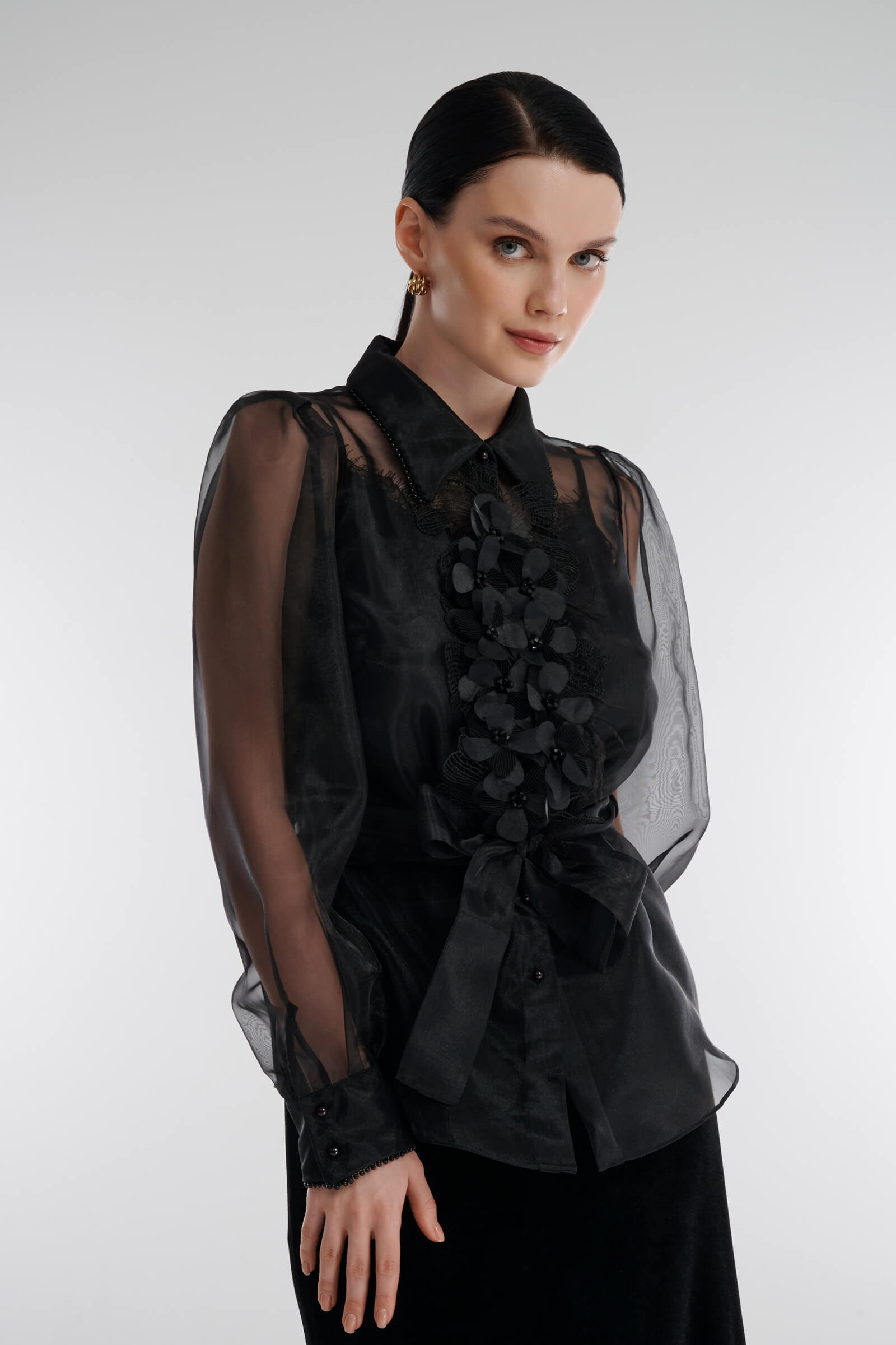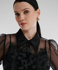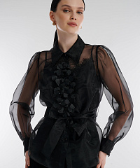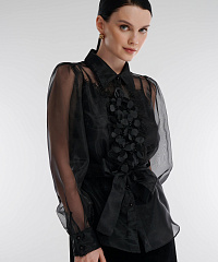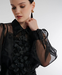 Рубашка — ключевой элемент стиля, сочетающий эстетику, комфорт и функциональность. Модель из прозрачной поливискозы с объемным декором идеально подойдет для создания утонченного вечернего образа, составив гармоничную пару как с брюками, так и с юбкой. В дополнение к изделию можно подобрать нижний слой в виде топа или майки.
