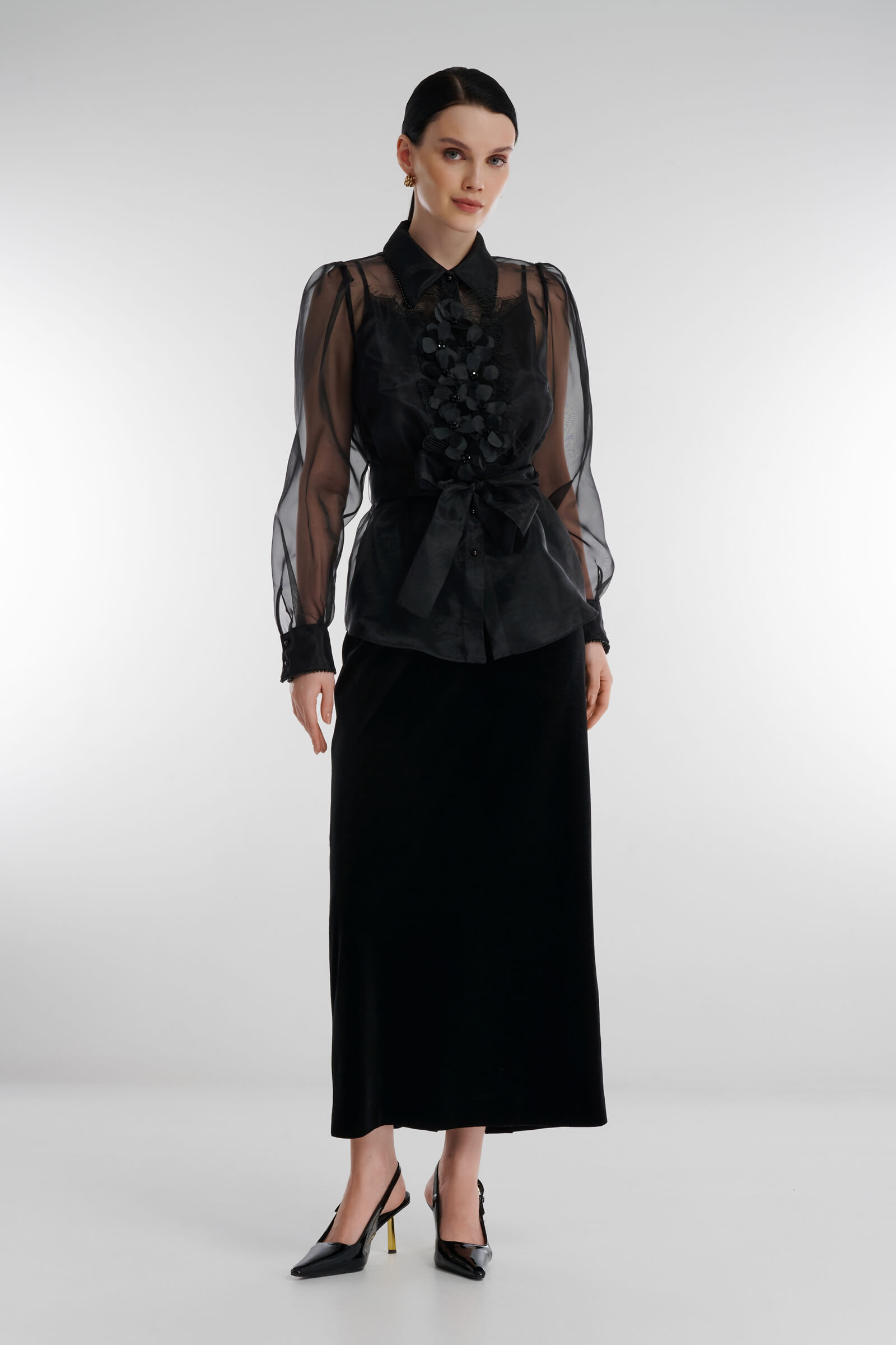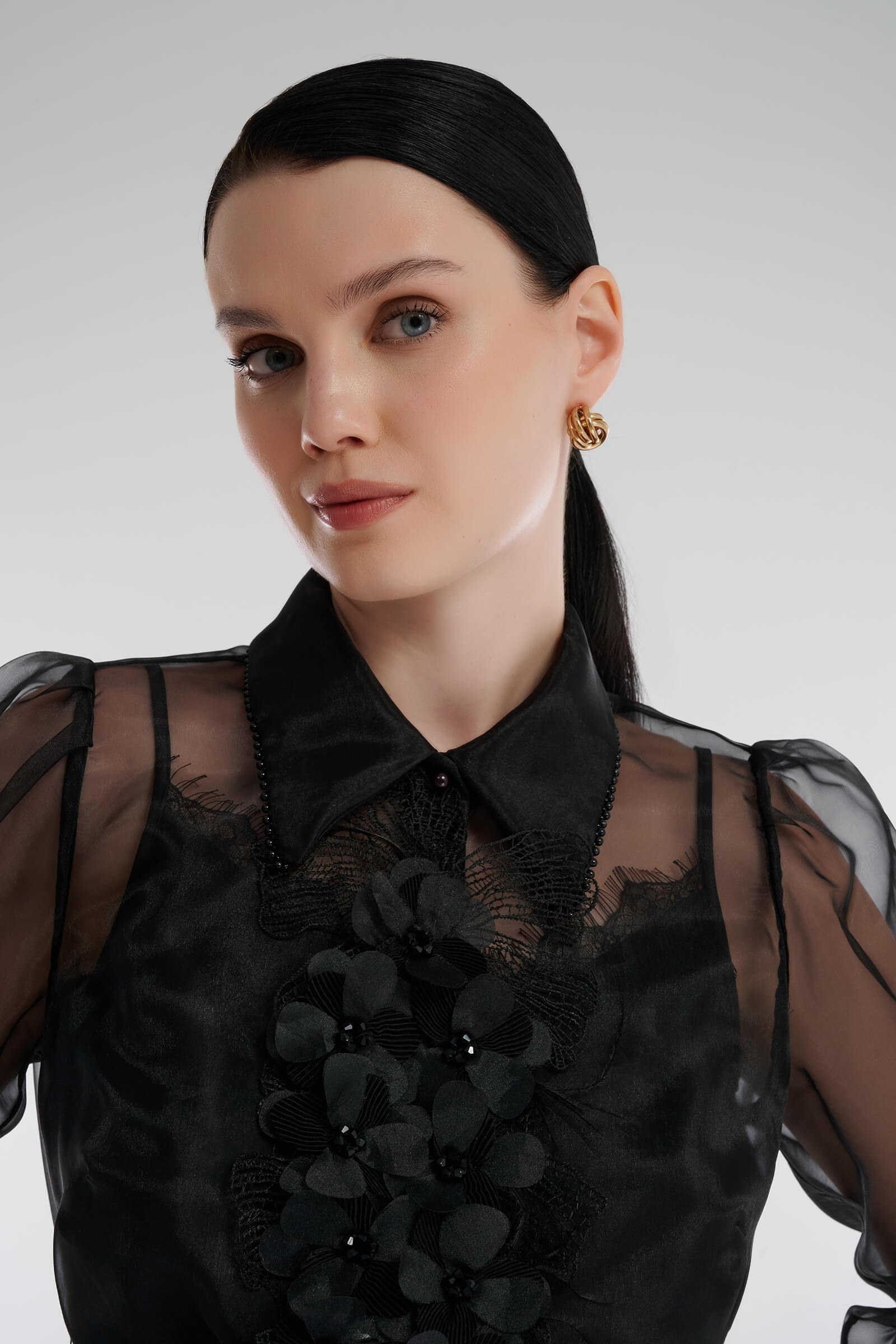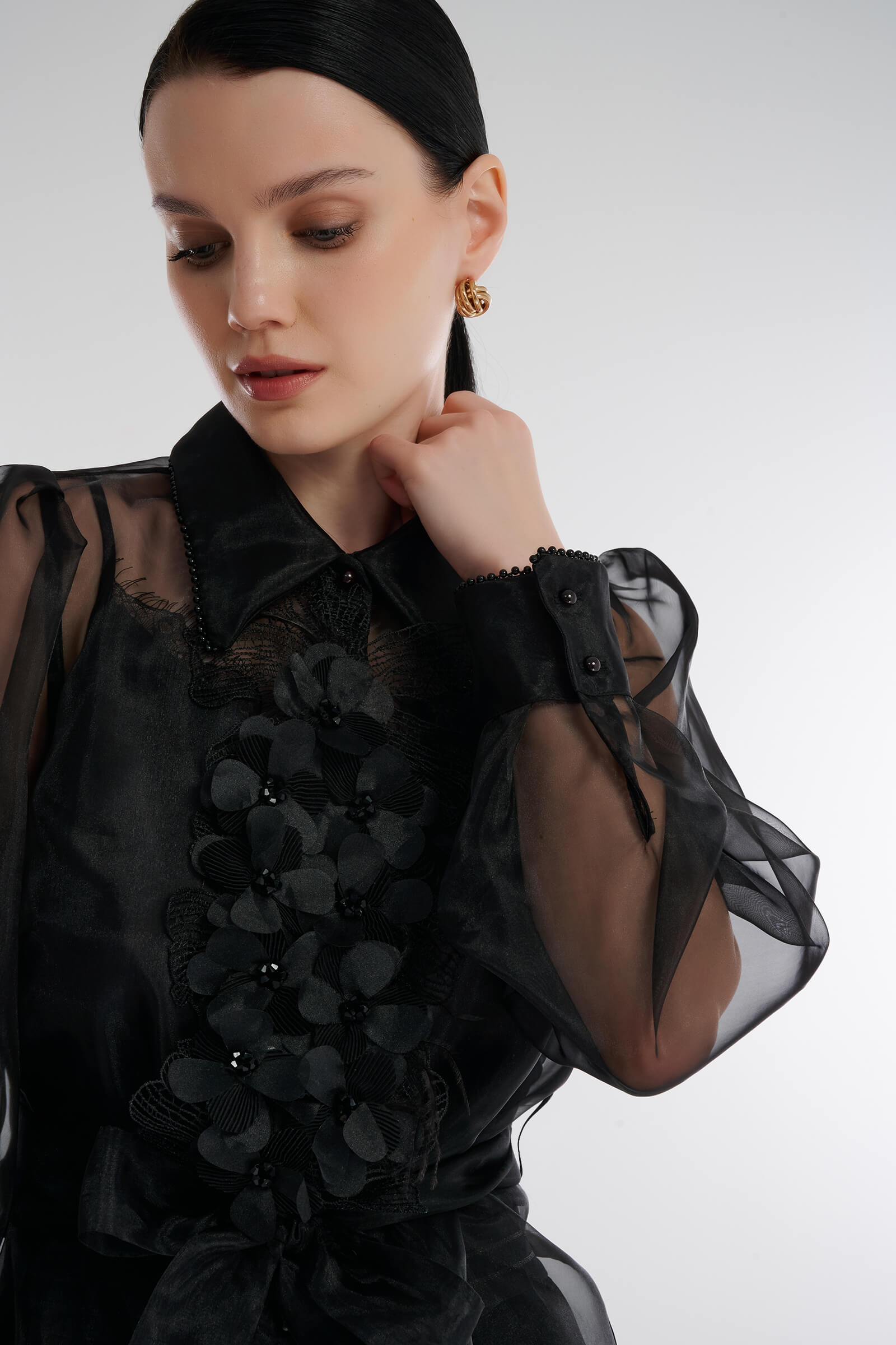 Рубашка — ключевой элемент стиля, сочетающий эстетику, комфорт и функциональность. Модель из прозрачной поливискозы с объемным декором идеально подойдет для создания утонченного вечернего образа, составив гармоничную пару как с брюками, так и с юбкой. В дополнение к изделию можно подобрать нижний слой в виде топа или майки.