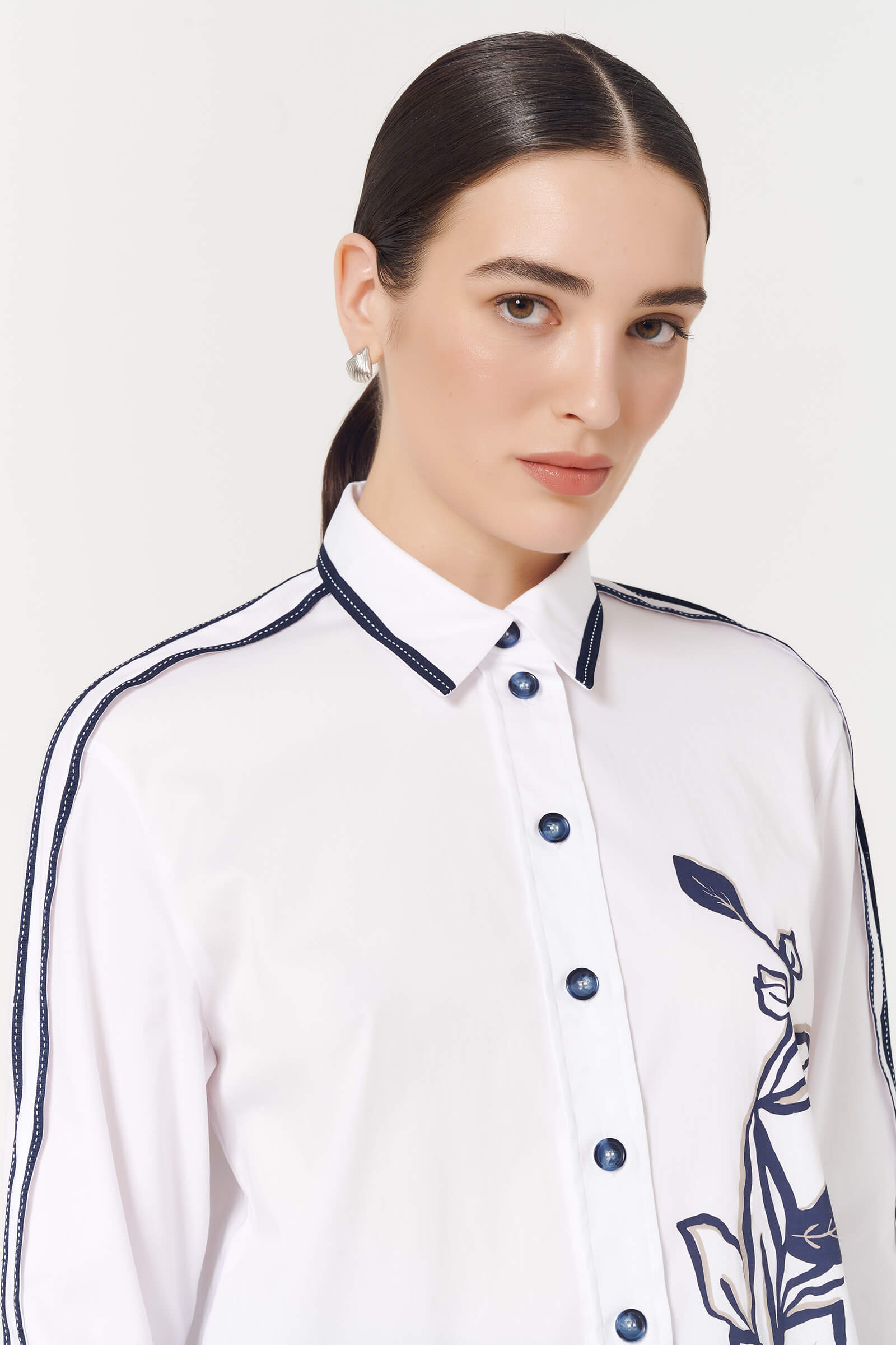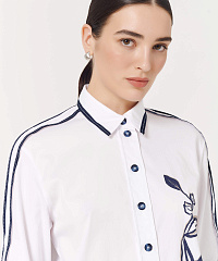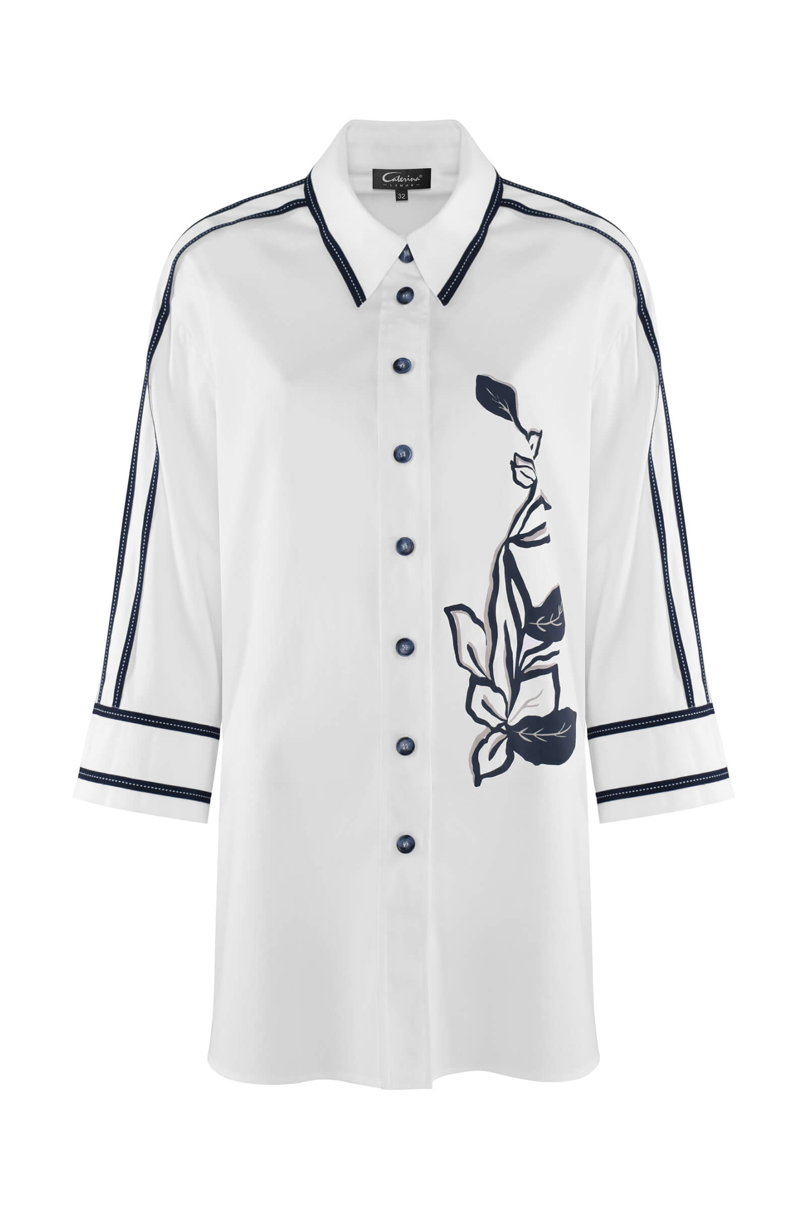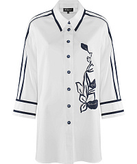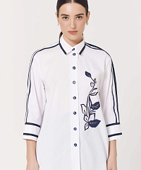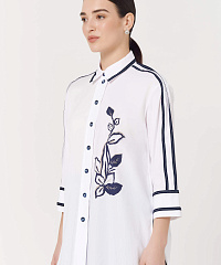 Удлиненная рубашка с рукавом 3/4 и контрастной синей строчкой станет отличным дополнением для создания повседневного образа на каждый день. Цветочный рисунок придает нотку романтики, а чуть спущенный рукав и свободный крой не будут сковывать движения.