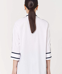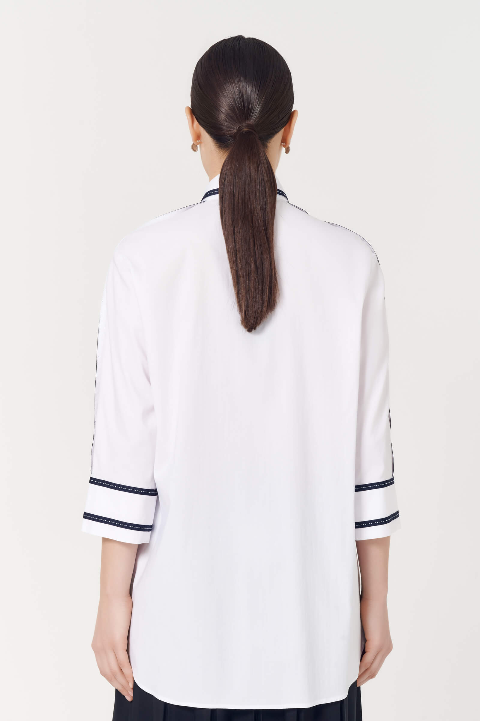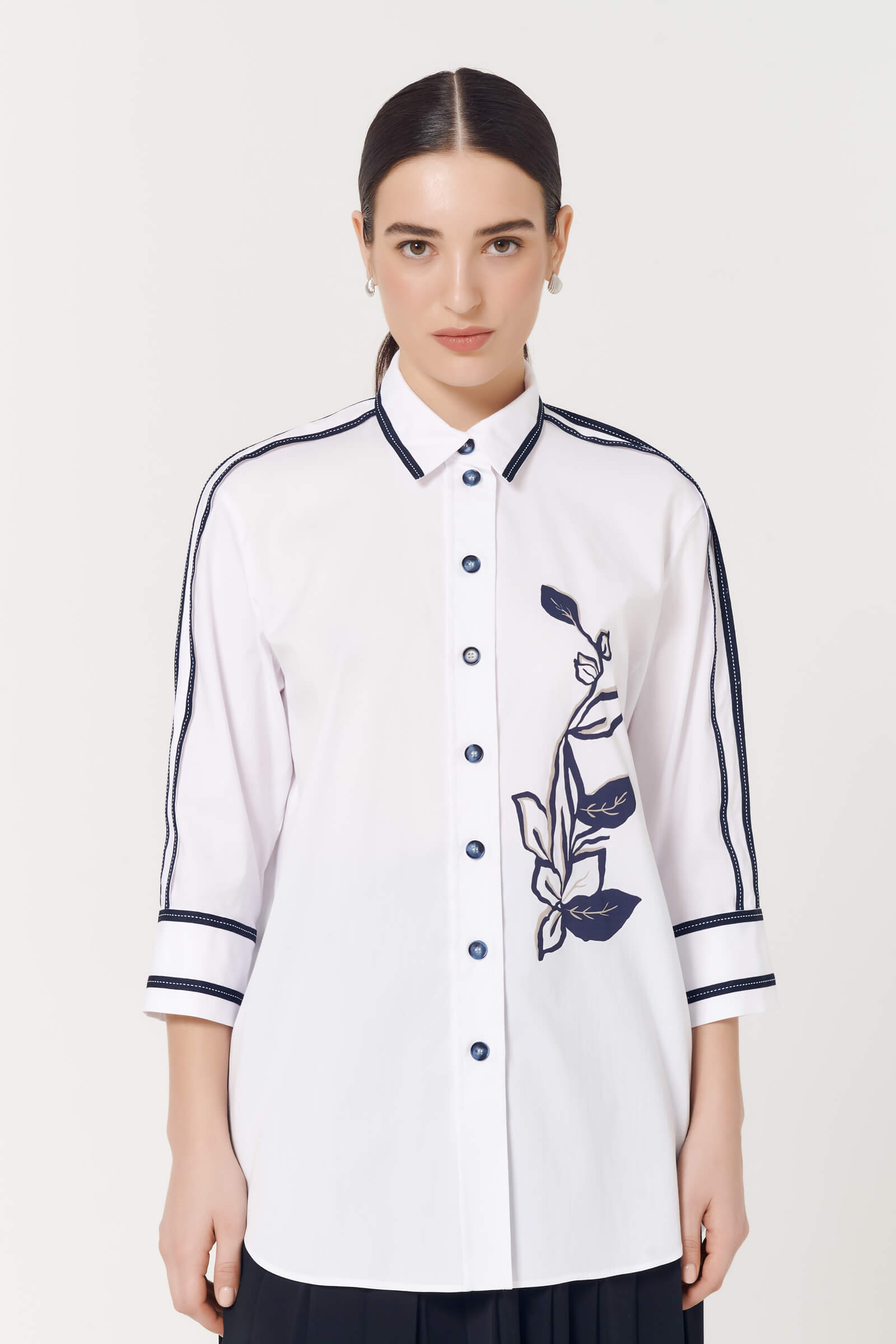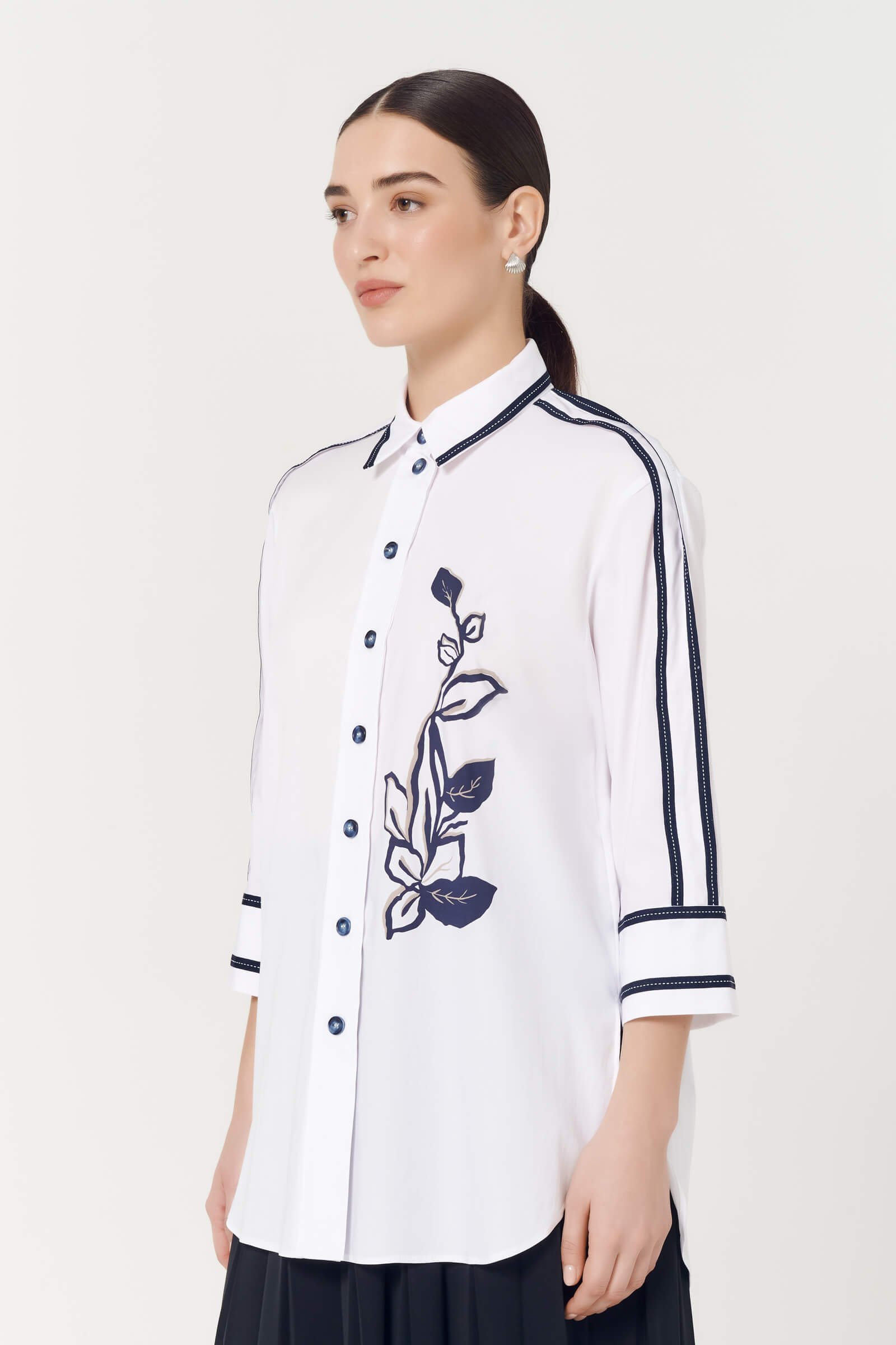 Удлиненная рубашка с рукавом 3/4 и контрастной синей строчкой станет отличным дополнением для создания повседневного образа на каждый день. Цветочный рисунок придает нотку романтики, а чуть спущенный рукав и свободный крой не будут сковывать движения.