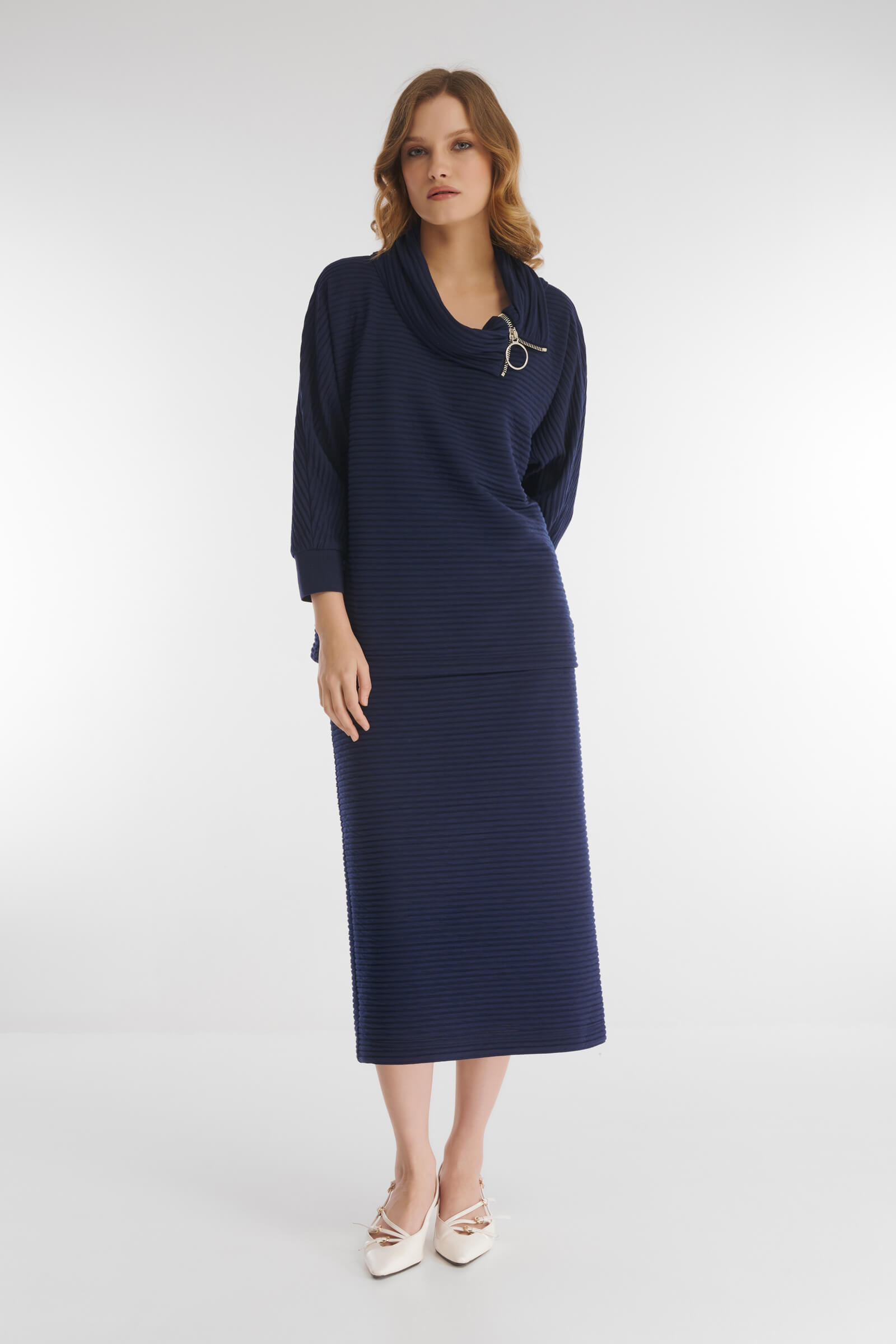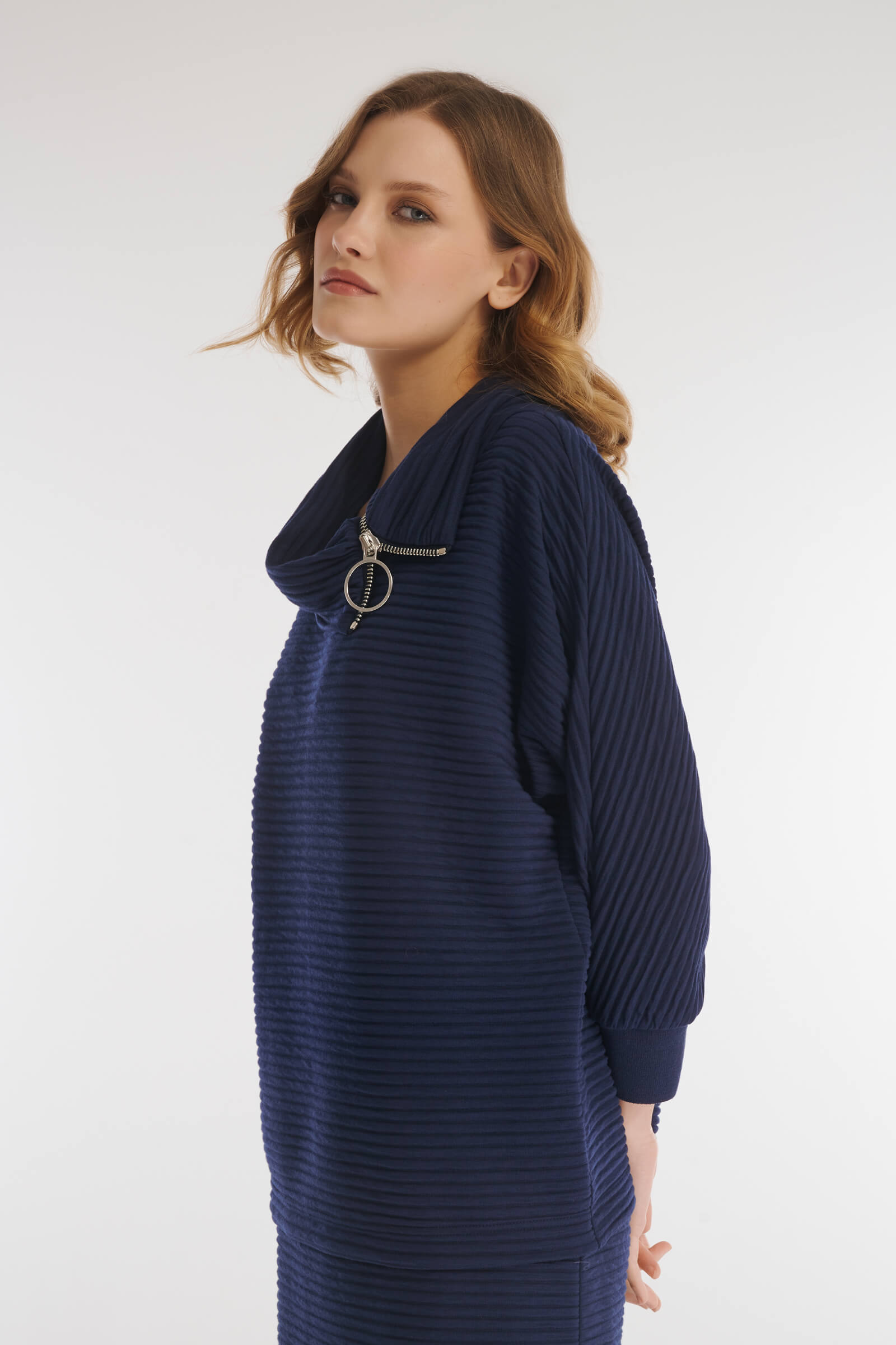 Свитшот с воротником на молнии и рукавом «летучая мышь» — стильная и универсальная вещь, которую получится комбинировать множеством способов. В офис модель можно носить с прямыми или широкими брюками или с юбкой-карандашом. С любимыми джинсами и ботинками свитшот будет незаменим для прогулки или шопинга. С юбкой длины миди и ботильонами на каблуке изделие можно надеть на романтическую встречу. Идеальную пару модели придумали дизайнеры Caterina Leman — это юбка в тон из той же линейки, поэтому создать гармоничный образ не составит труда.