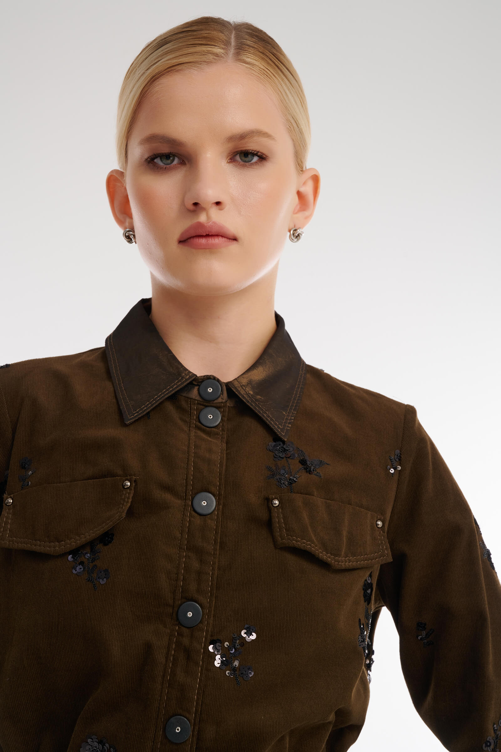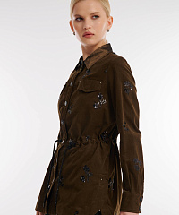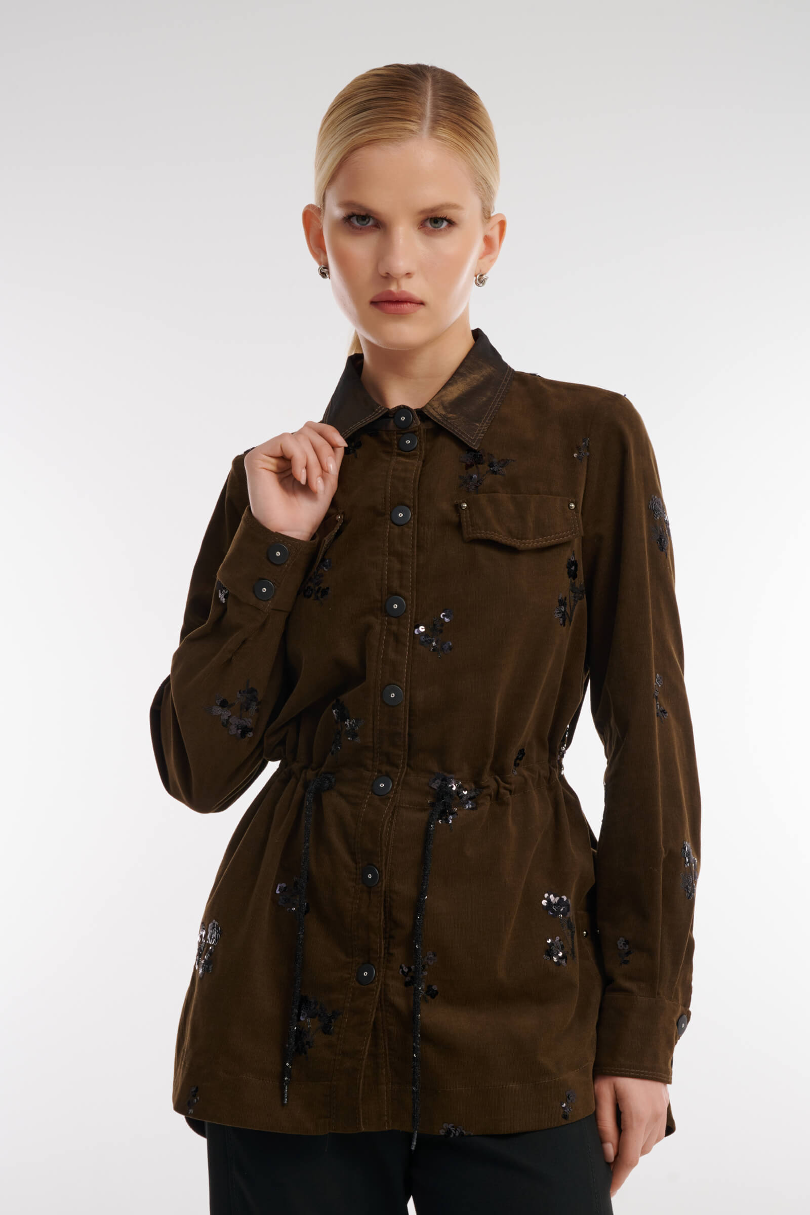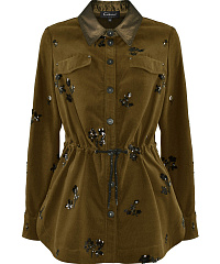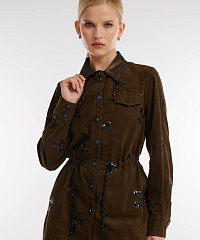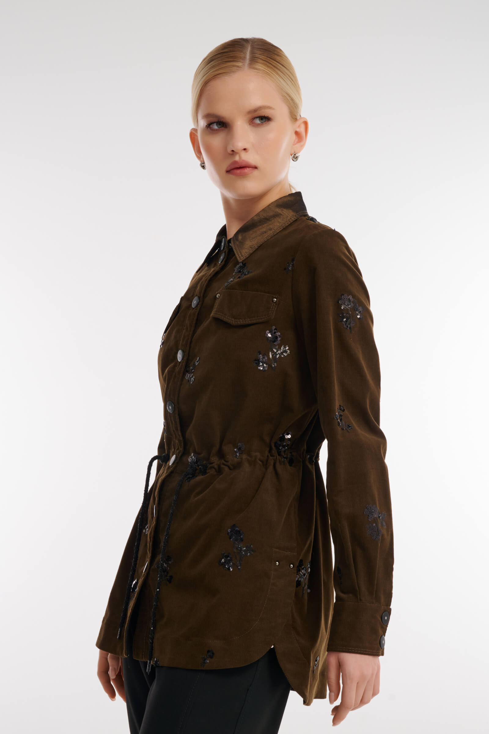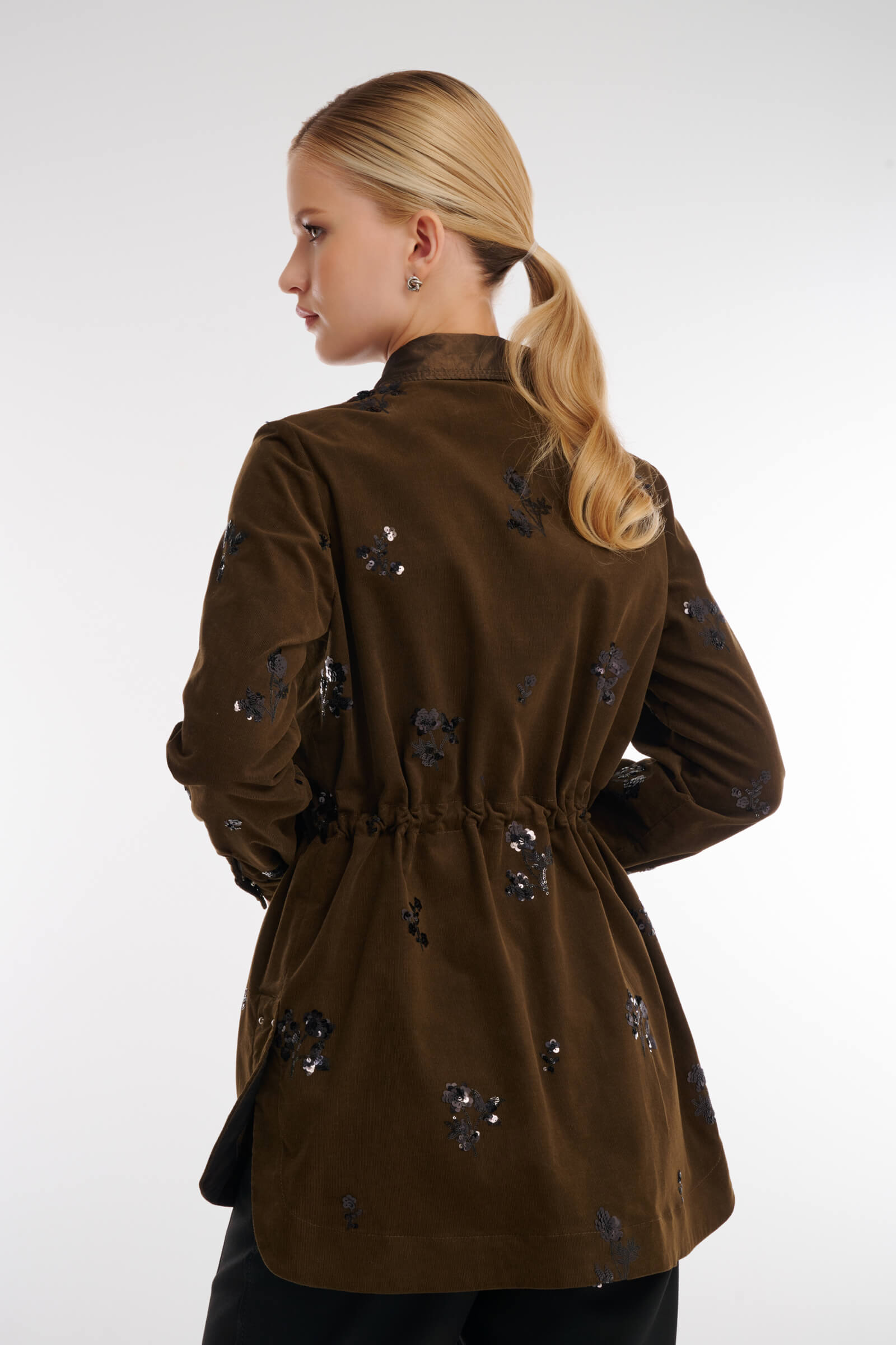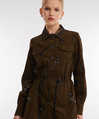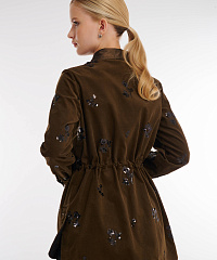 Туника из мягкого вельвета украшена пайетками в виде цветов, создавая выразительный блеск и деликатный акцент. Фактура ткани и декоративные детали формируют эффектный образ, который легко вписывается как в повседневные, так и в более нарядные сочетания.