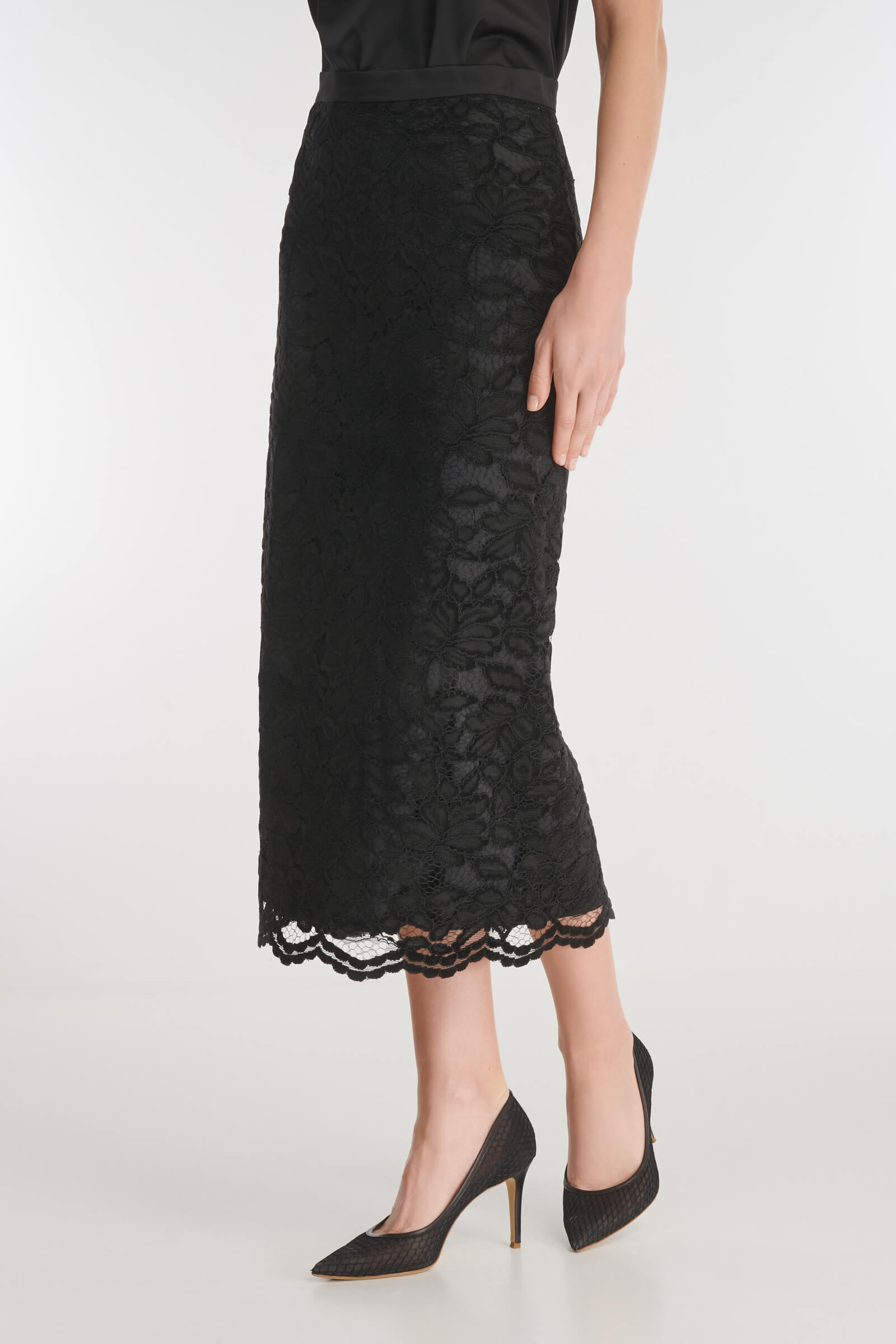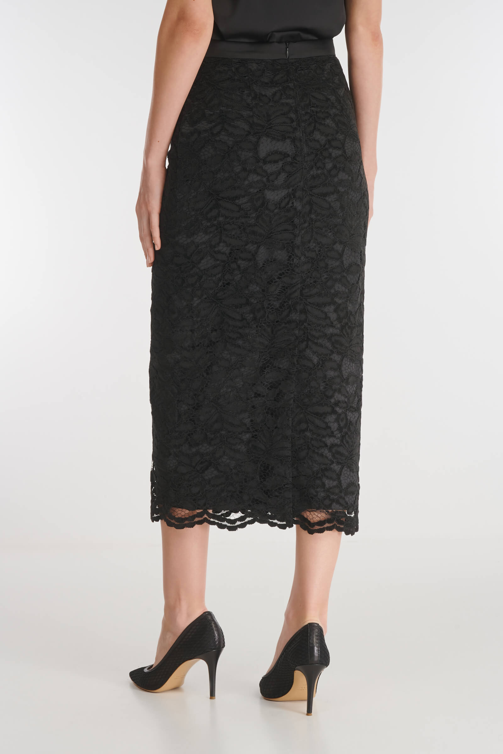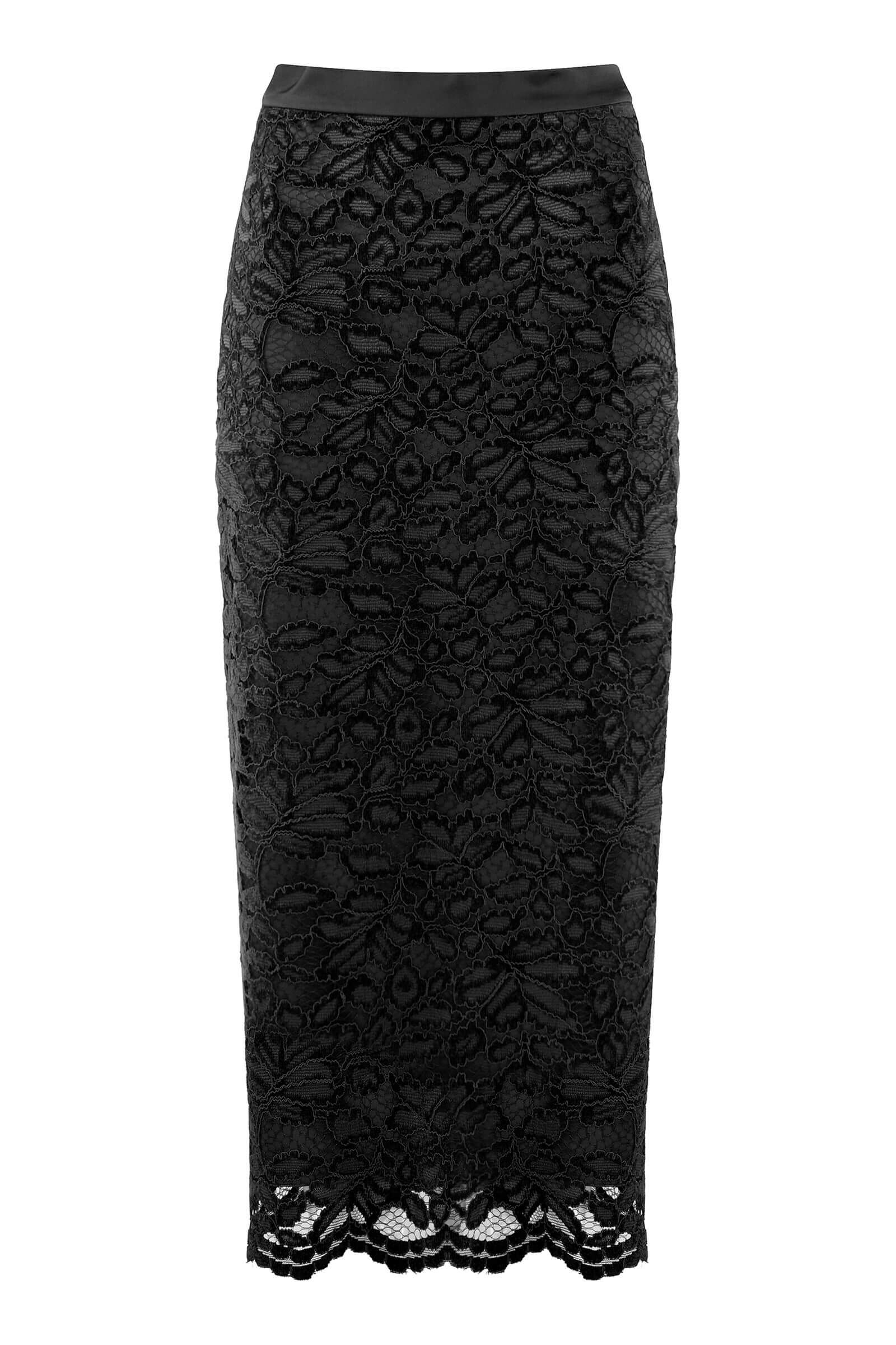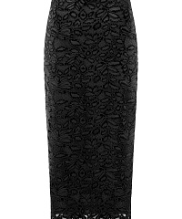 Юбка-карандаш выполнена из нежного гипюра с флористичным мотивом. Узкий атласный пояс подчеркивает благородный дизайн. Модель застегивается на скрытые молнию и пуговицу на спине. В комплект к юбке можно подобрать жакет из той же линейки.