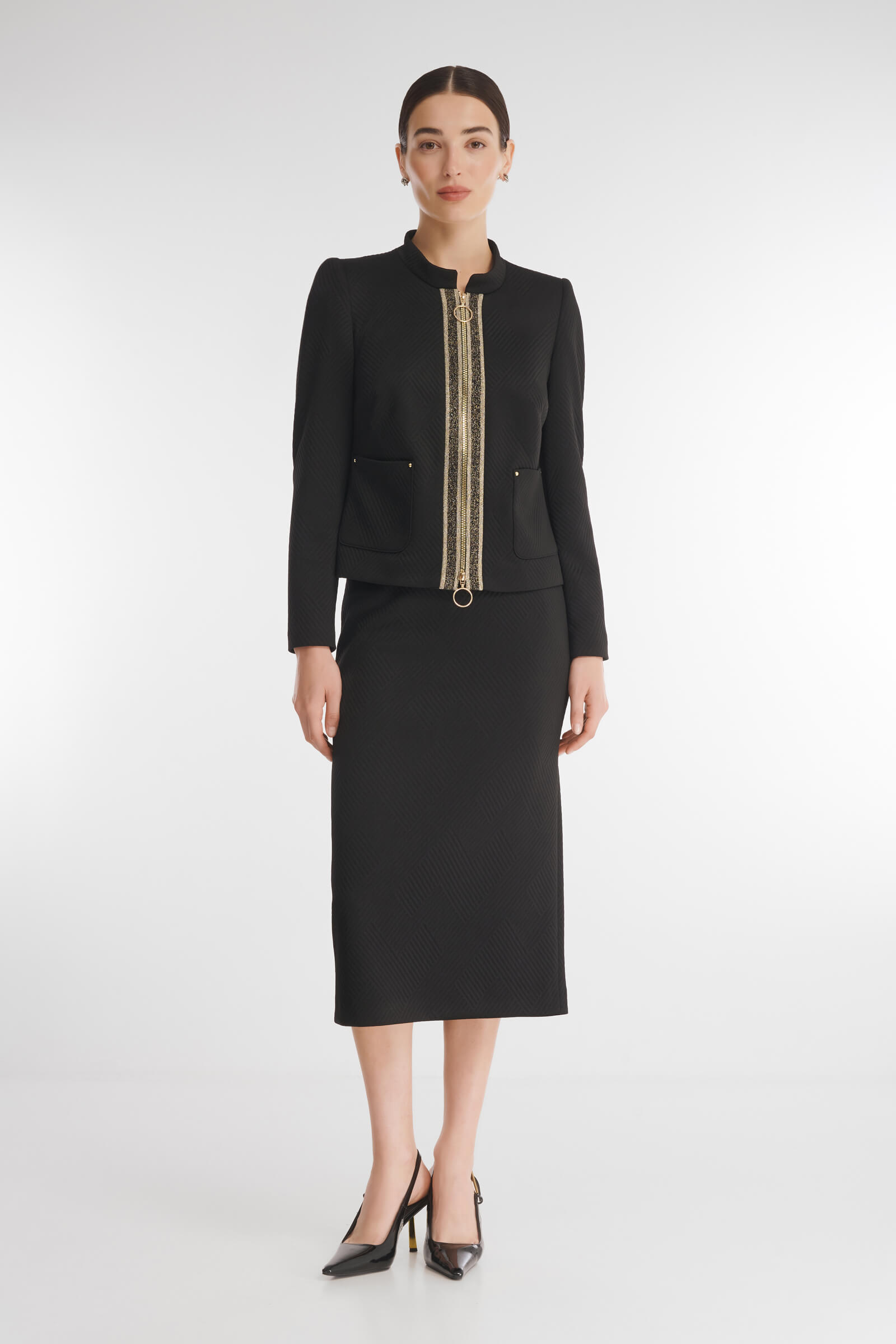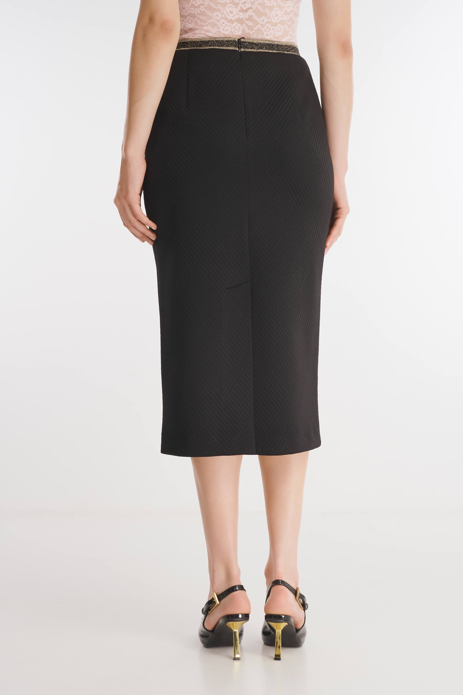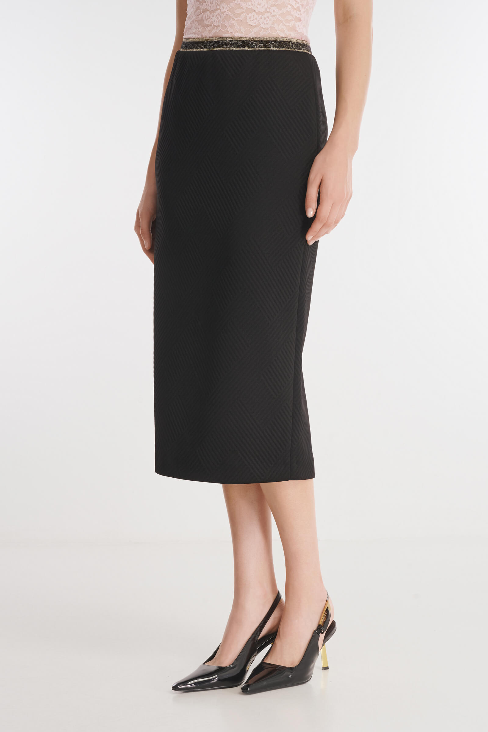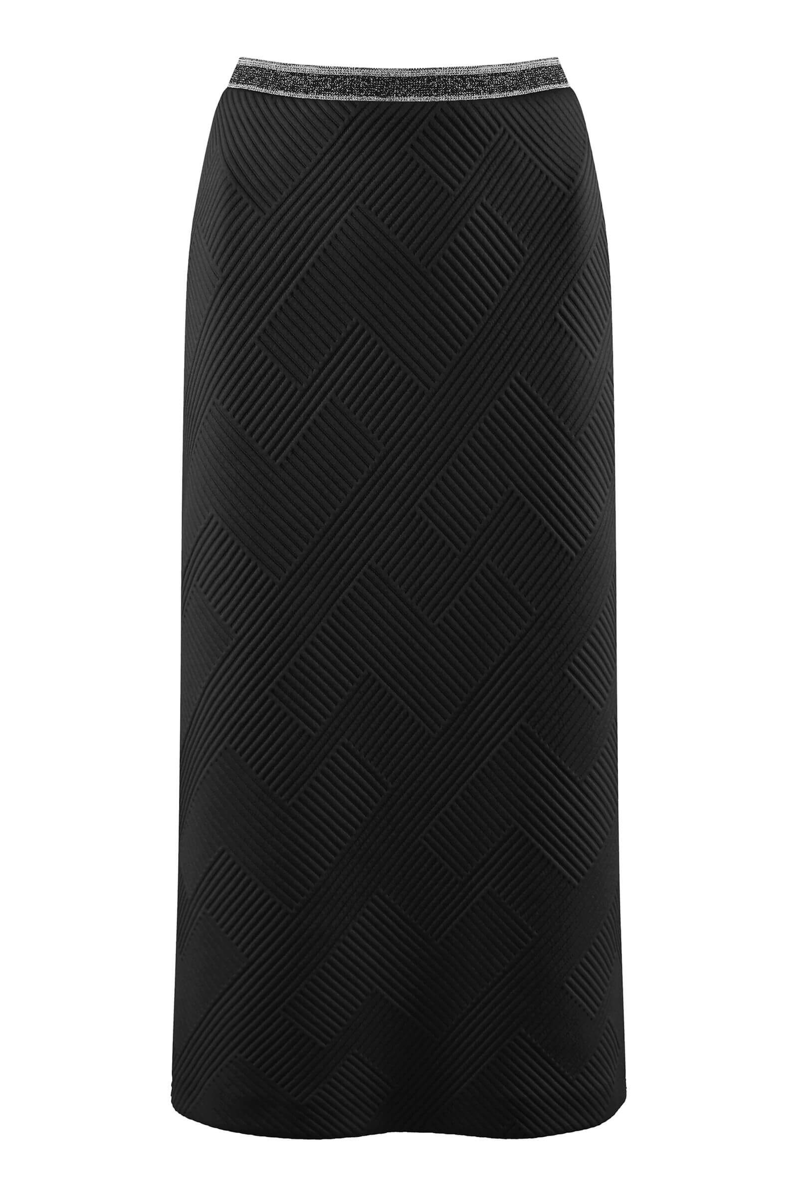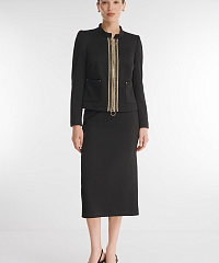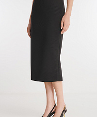 Для создания юбки был выбран мягкий фактурный материал на основе вискозы с выраженным геометрическим узором. Гладкая подкладка делает модель еще комфортней, а посадку — идеальной. Сочетайте юбку с жакетом из той же линейки для создания стильного тотал-лука.