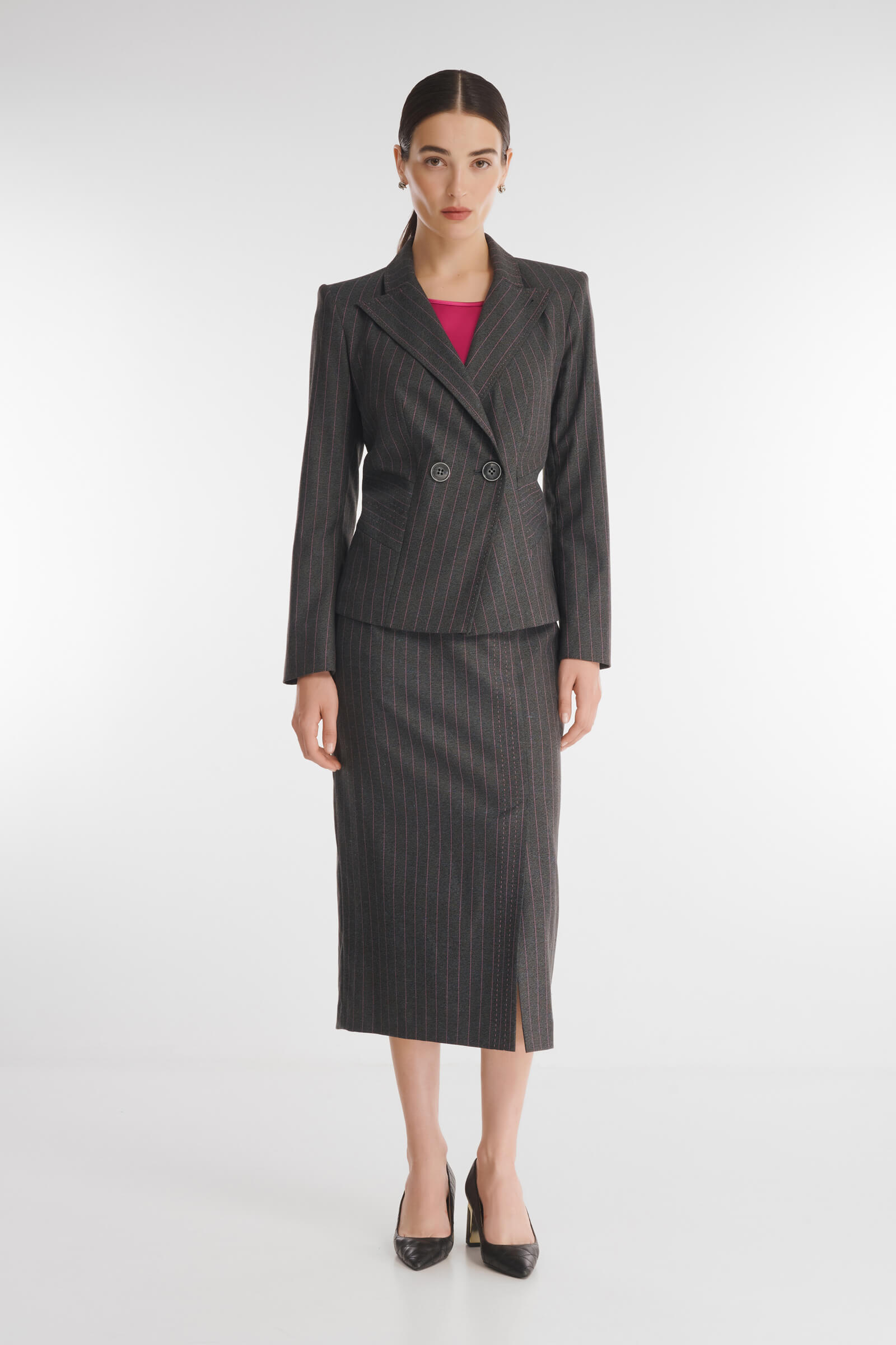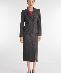 Для создания юбки был выбран высококачественный костюмный материал на основе вискозы, дополненный гладкой подкладкой для еще большего комфорта. Вертикальная полоска визуально вытягивает силуэт. Классическая шлица, расположенная спереди, гарантирует удобство во время носки. В пару к юбке можно подобрать пиджак из той же линейки.