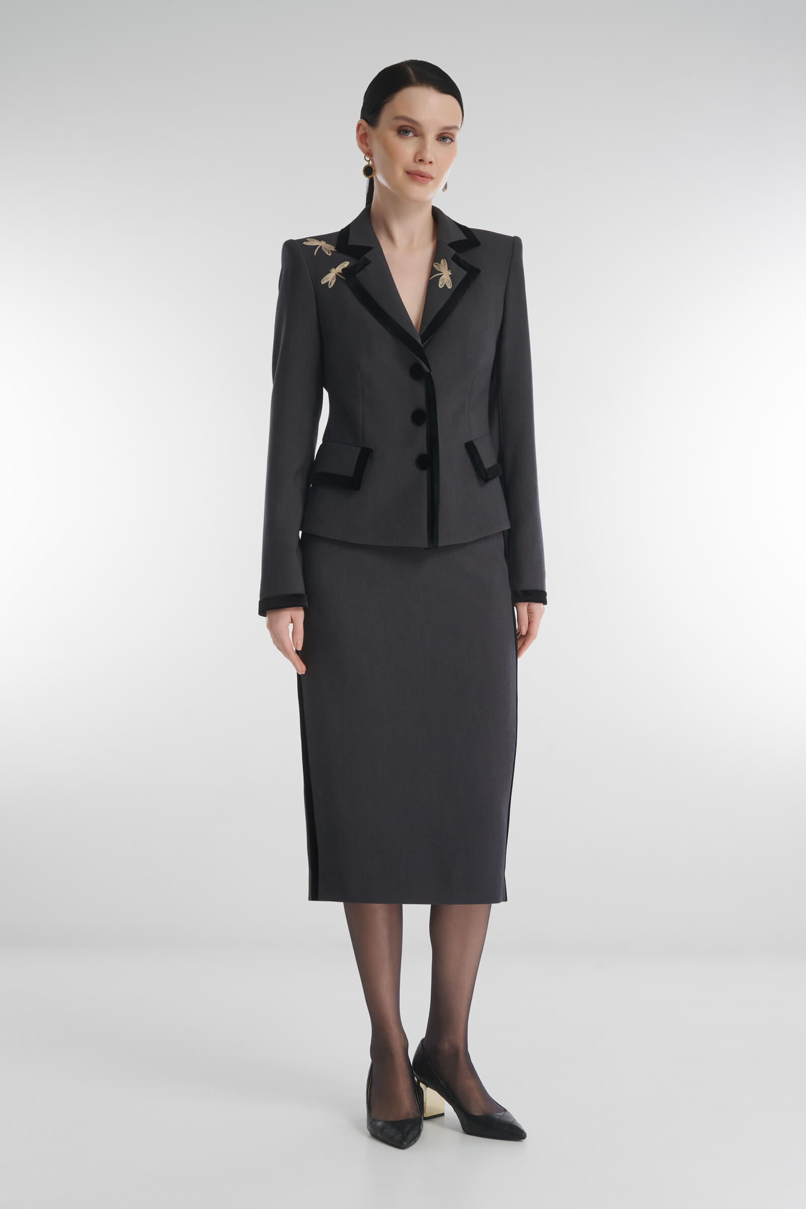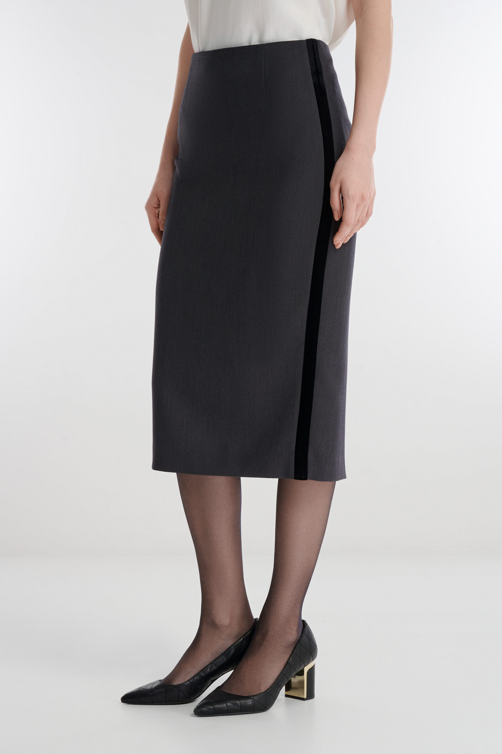 Лаконичная юбка-карандаш становится более выразительной благодаря бархатным вставкам, которые визуально вытягивают силуэт и добавляют изысканный акцент. Универсальная модель гармонично впишется в любой гардероб, а в сочетании с жакетом из той же линии поможет создать стильный комплект для офиса или особых случаев.
