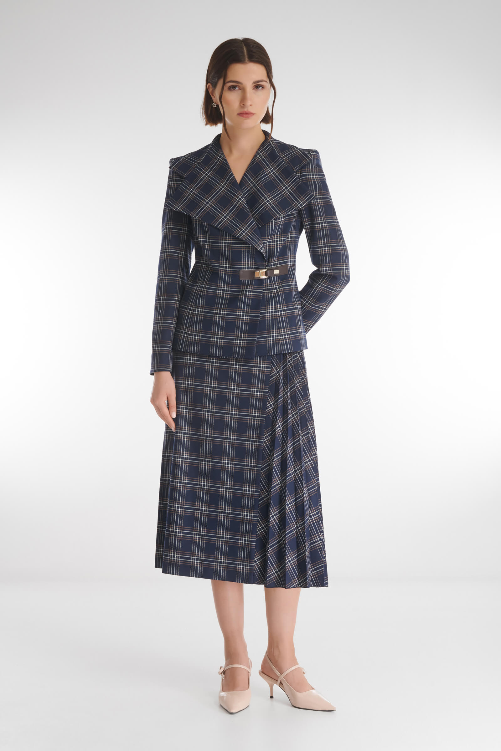 Юбка, которая создает движение и легкость при каждом шаге. Плиссировка играет в клетчатом узоре, делая образ живым и динамичным, а изящная длина мидакси придает современную элегантность. Деталь сбоку добавляет характер — акцент, ради которого хочется надеть ее снова и снова. Идеальна в паре с жакетом для цельного образа или с уютным трикотажем, когда нужен стиль без усилий.
